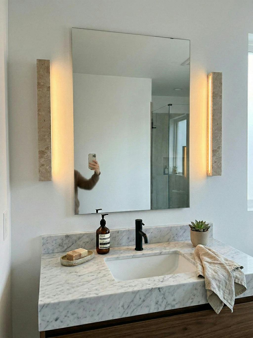 I installed one on each side of the vanity mirror in the master bathroom. The texture of this natural stone is a perfect match.