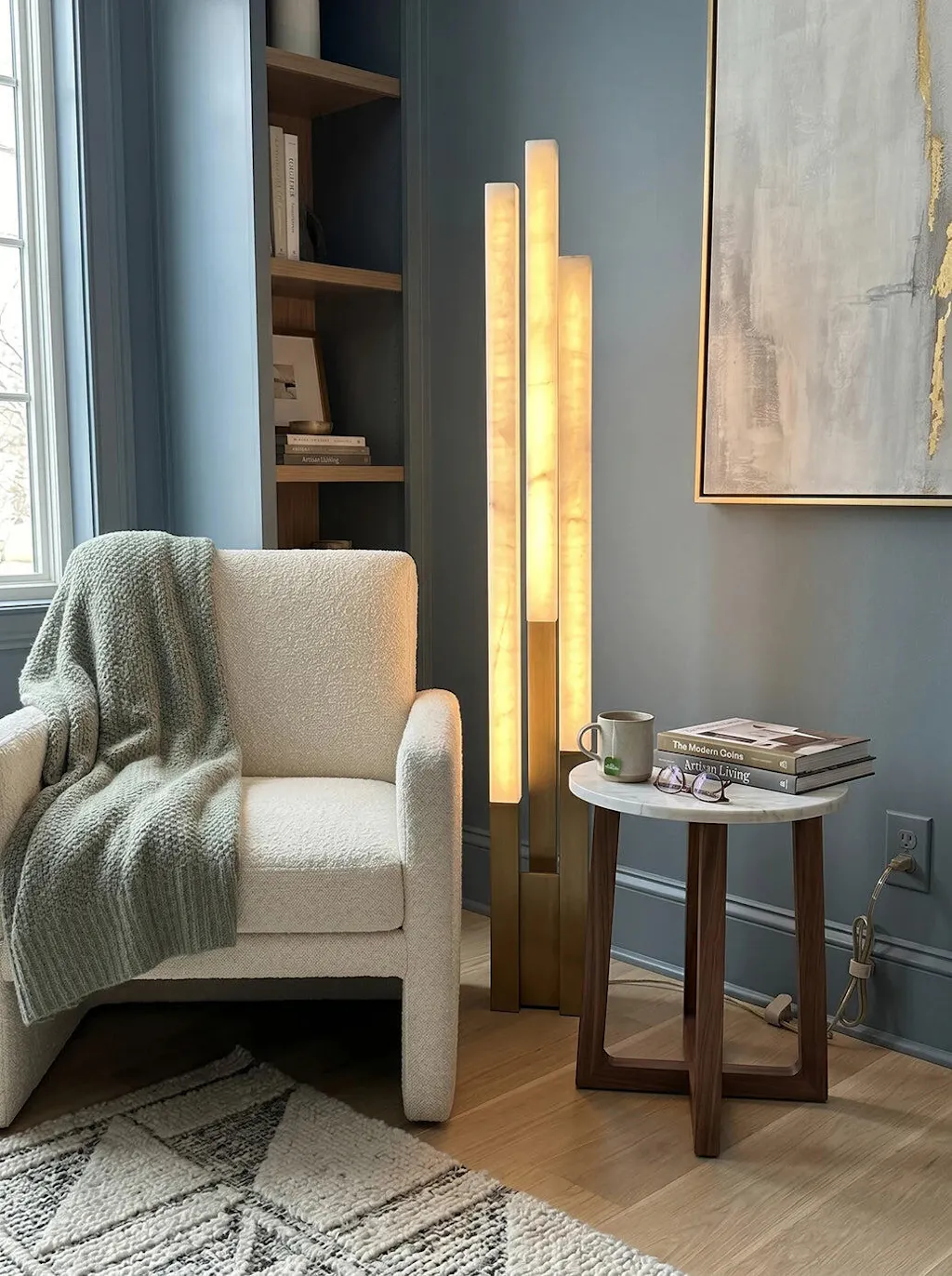 This wall lamp combines a sculptural feel with natural materials. The marble has perfect light transmittance, allowing you to see the natural mineral textures. The mounting bracket is also crafted with exceptional sturdiness and precision.