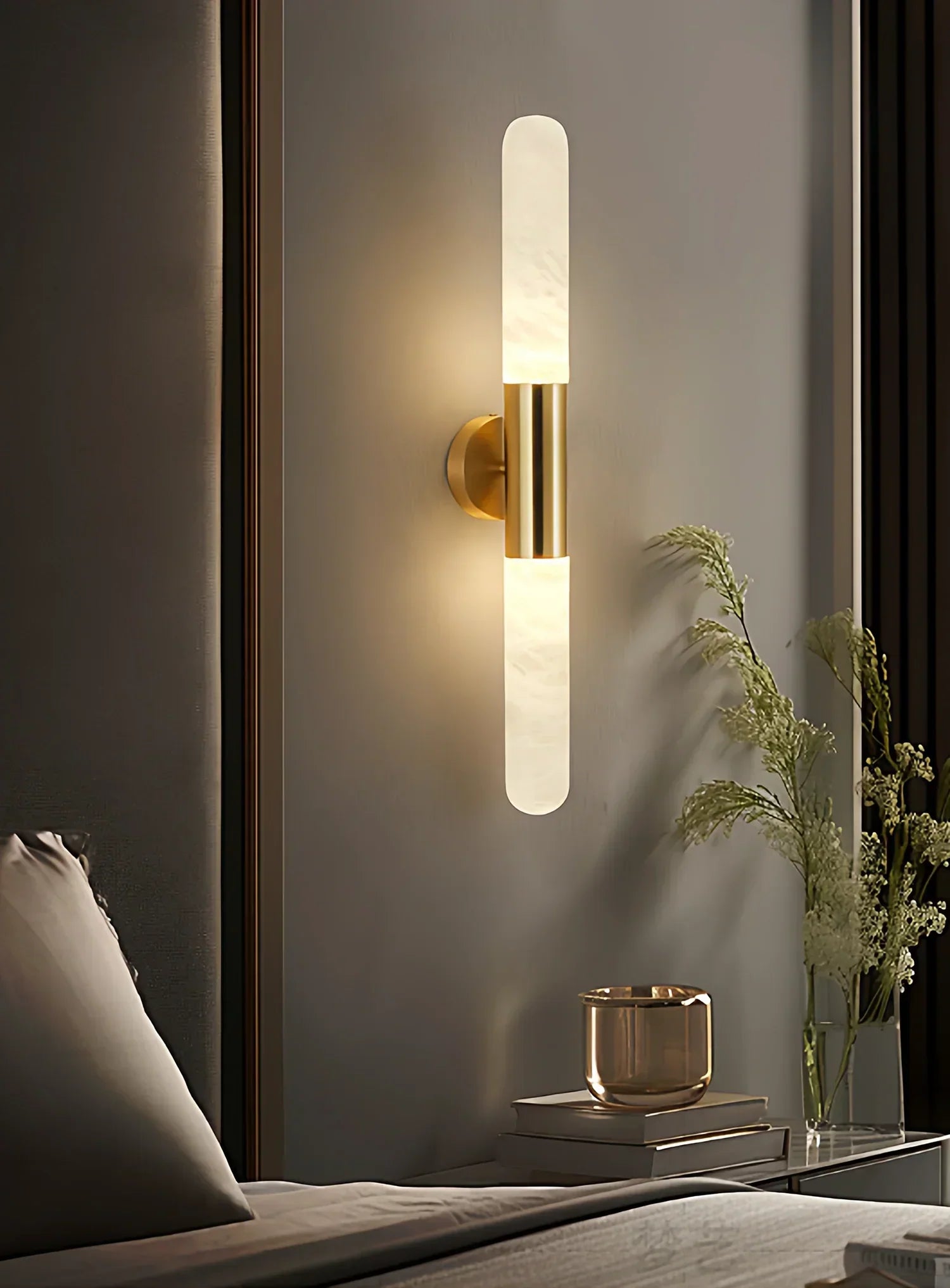Illuminate your space with the captivating beauty of the Cylindrical Alabaster Slim Wall Lamp. This stunning piece is a refined fusion of natural elegance and modern design, transforming any wall into a canvas of light. The sconce features two graceful, cylindrical light sources crafted from natural alabaster, a material celebrated for its mesmerizing diffusion of light. The unique, subtle veining of the stone ensures that each piece is a one-of-a-kind work of art. A sleek, polished brass or gold-toned metal body connects the cylinders, adding a touch of sophisticated contrast.