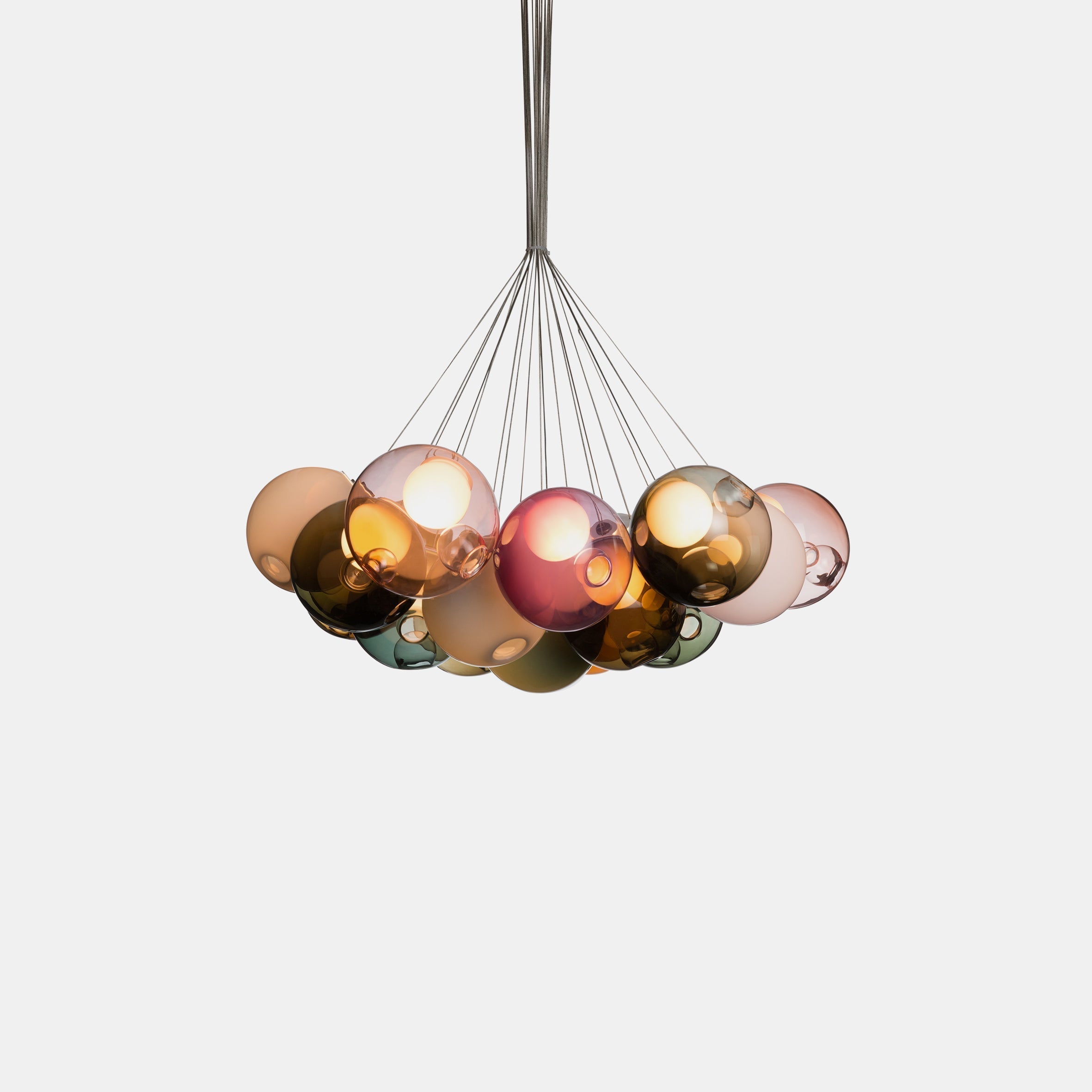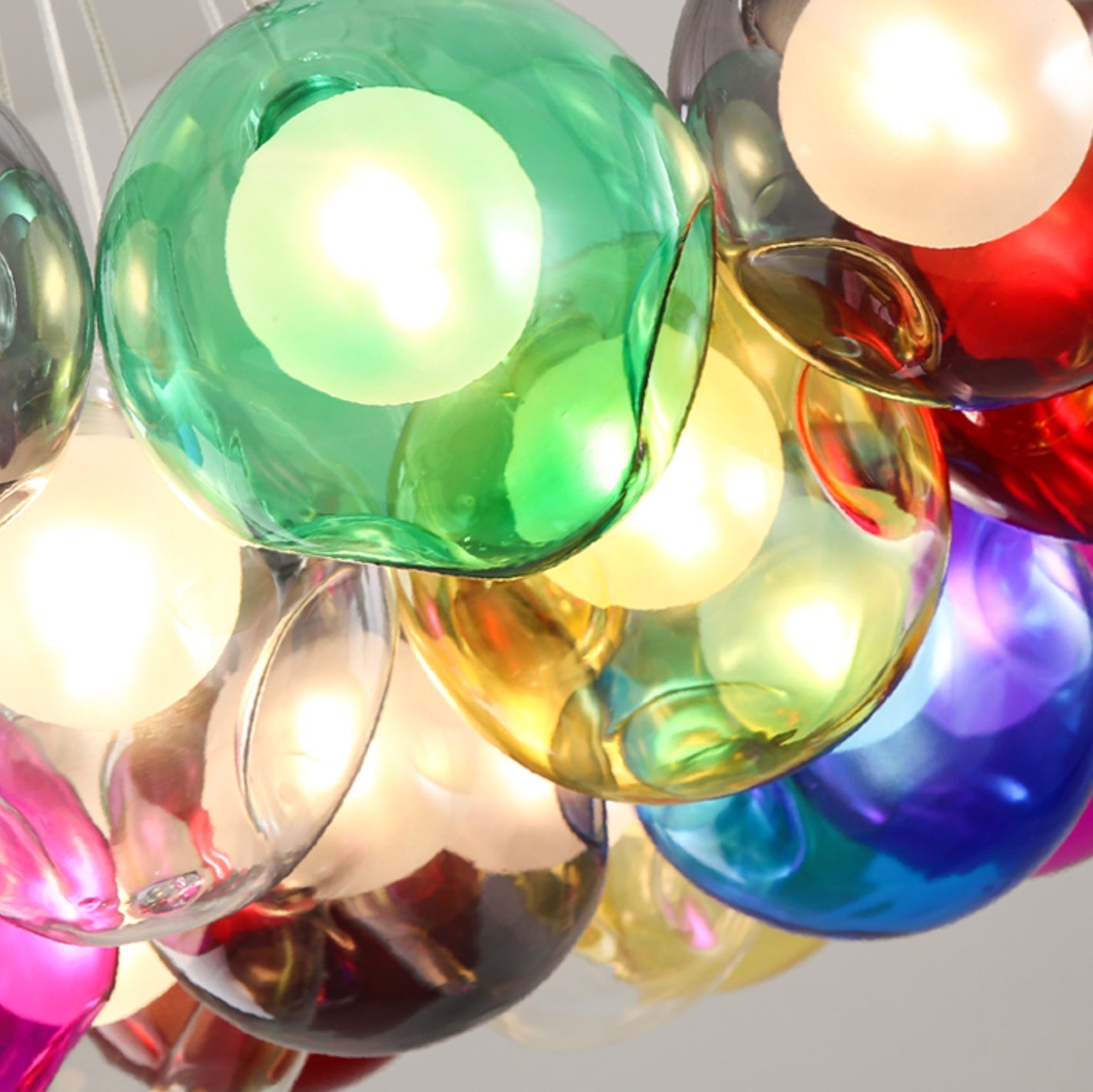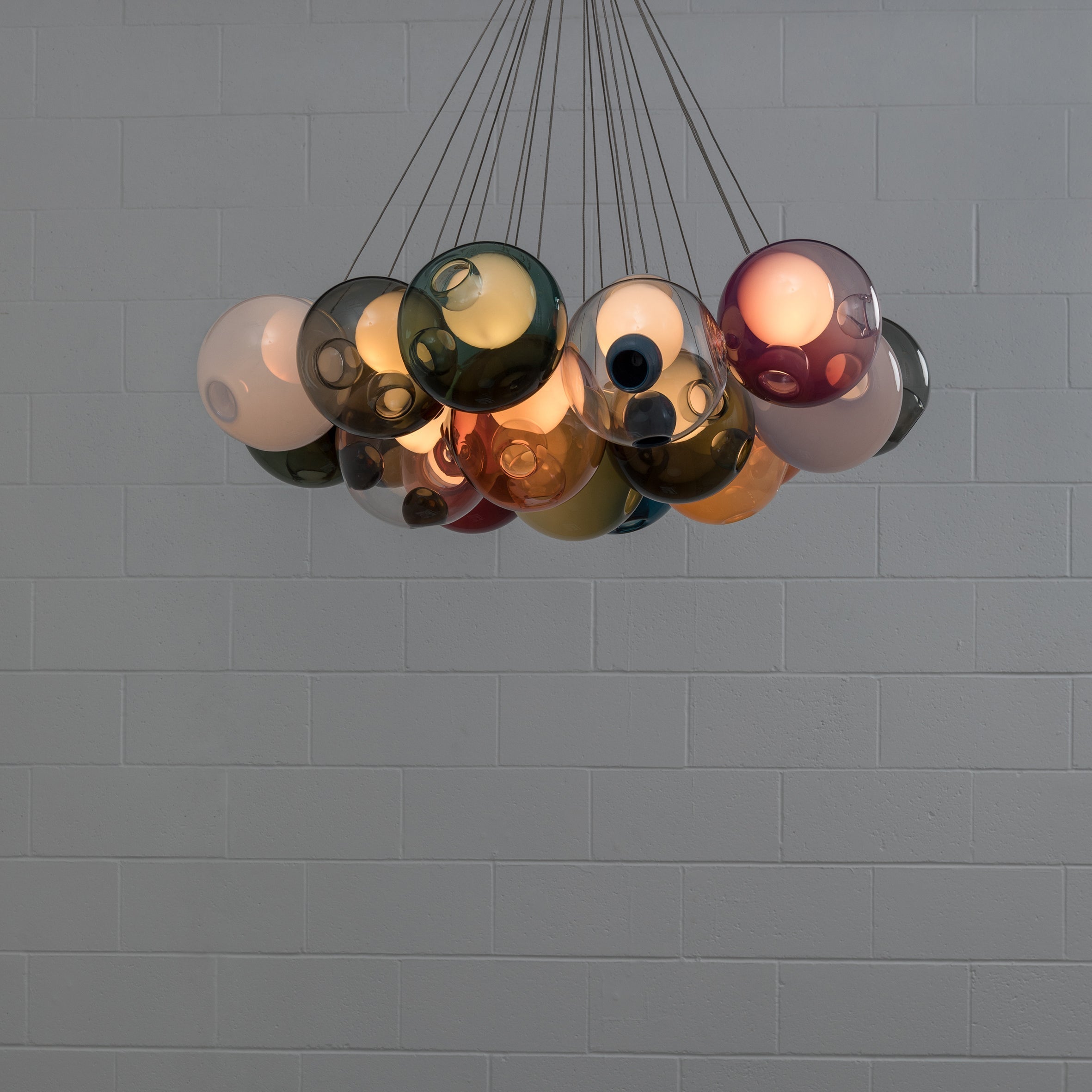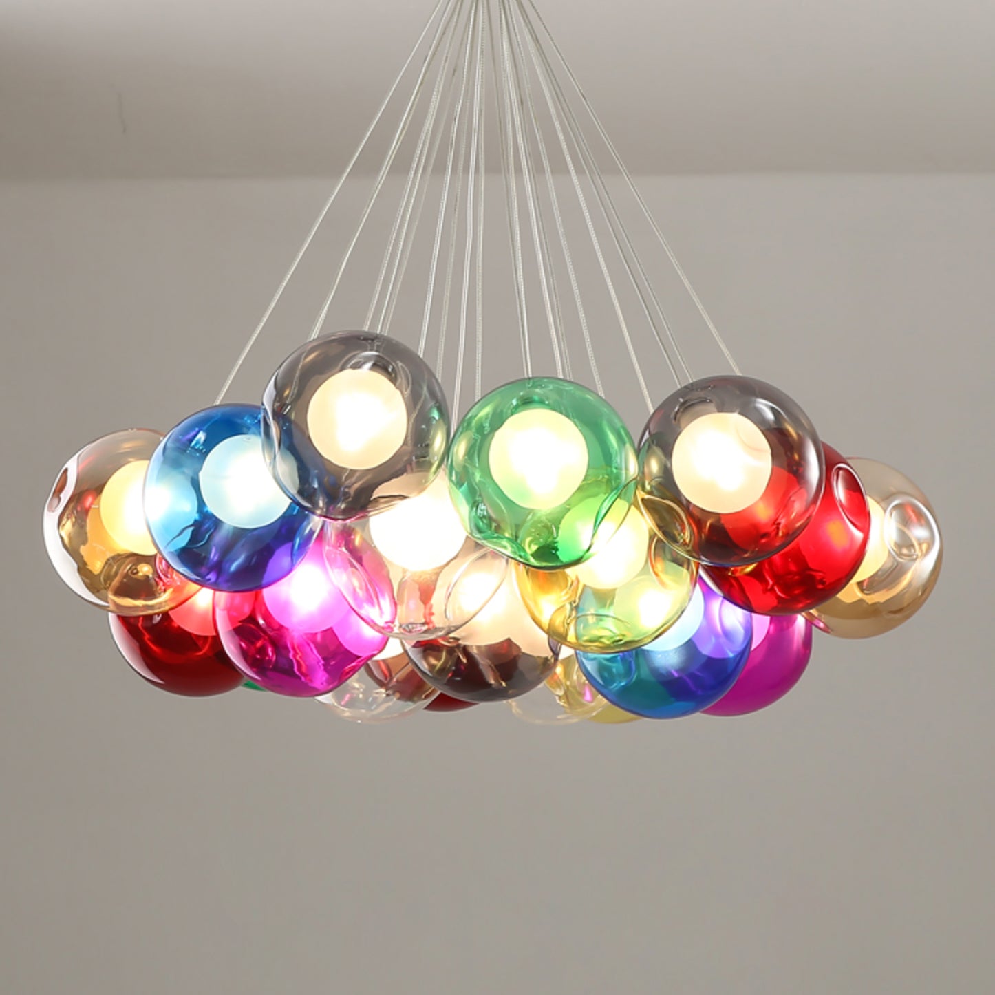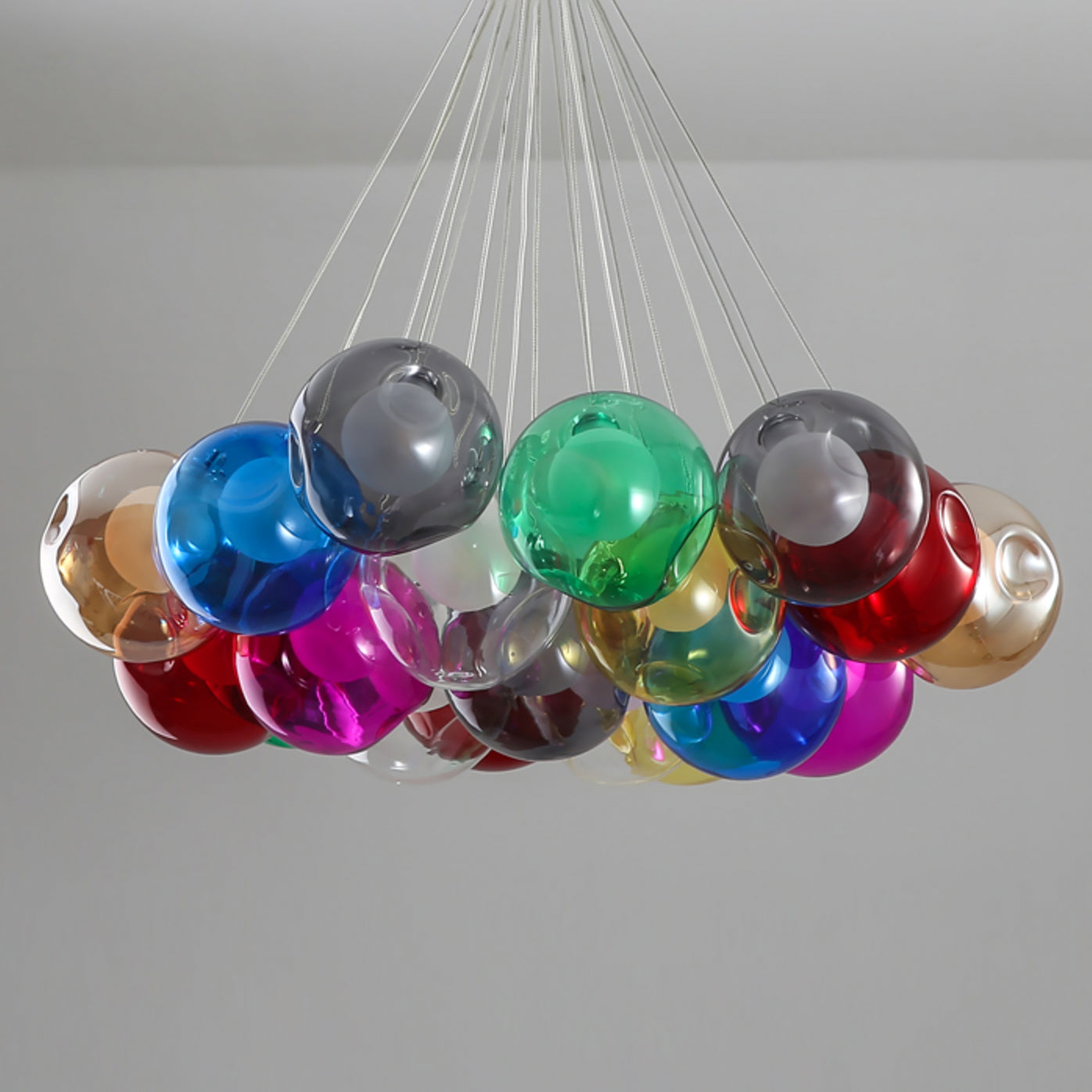 Explore the artistic allure of the 28 Multiple Colour Chandelier - Cluster – a stunning multi-light fixture that transforms any space into a contemporary design masterpiece. Each hand-blown glass sphere boasts a unique internal landscape, thanks to innovative airflow control technology that seamlessly blends natural beauty with meticulous engineering. Adjustable to your aesthetic preferences, it creates captivating patterns of light and shadow depending on its installation location.