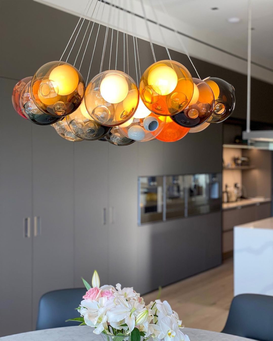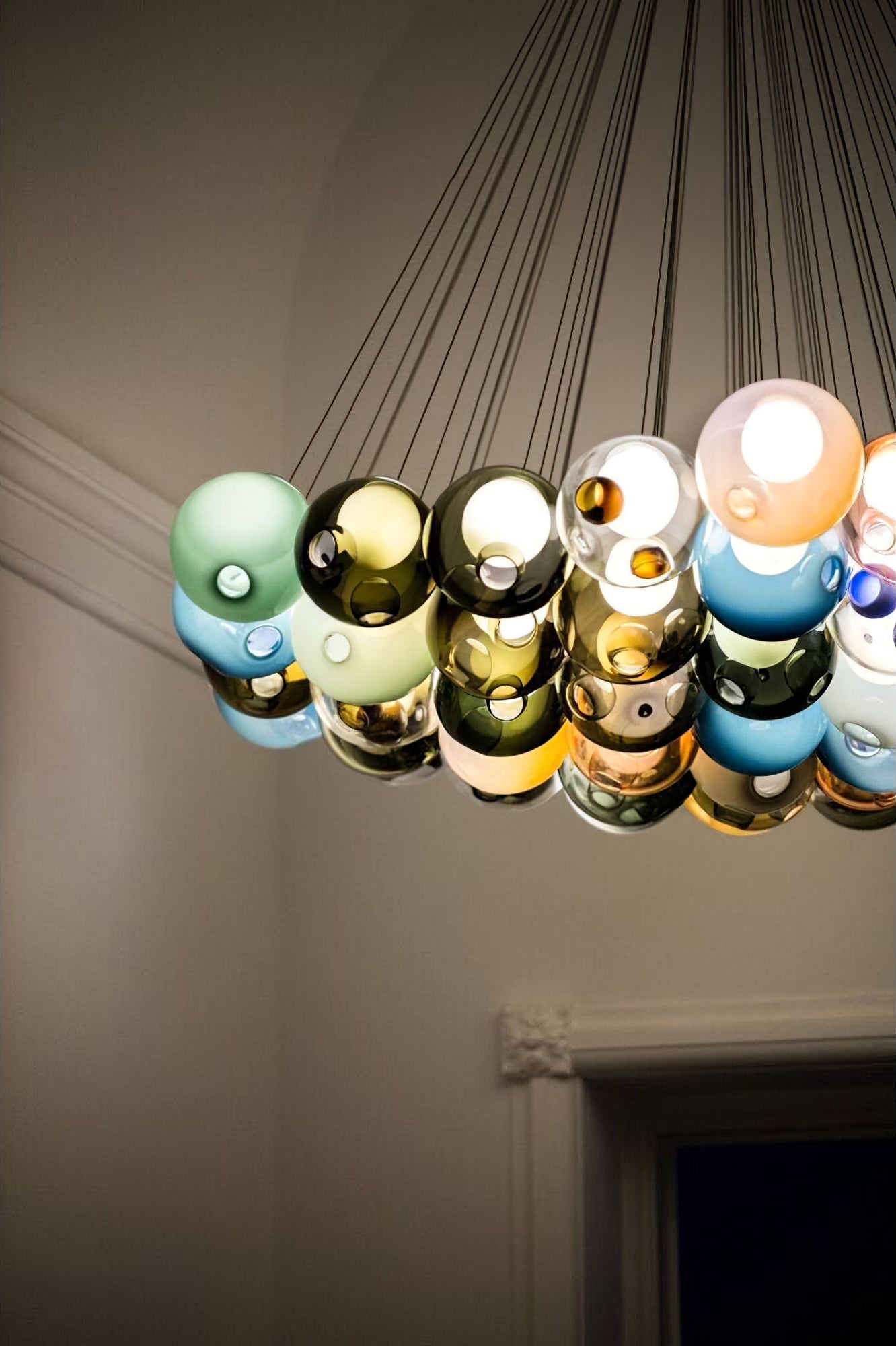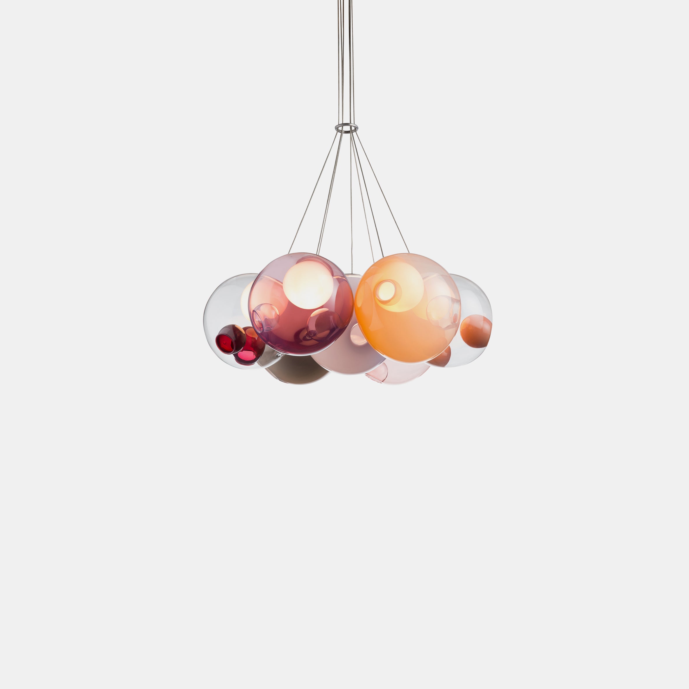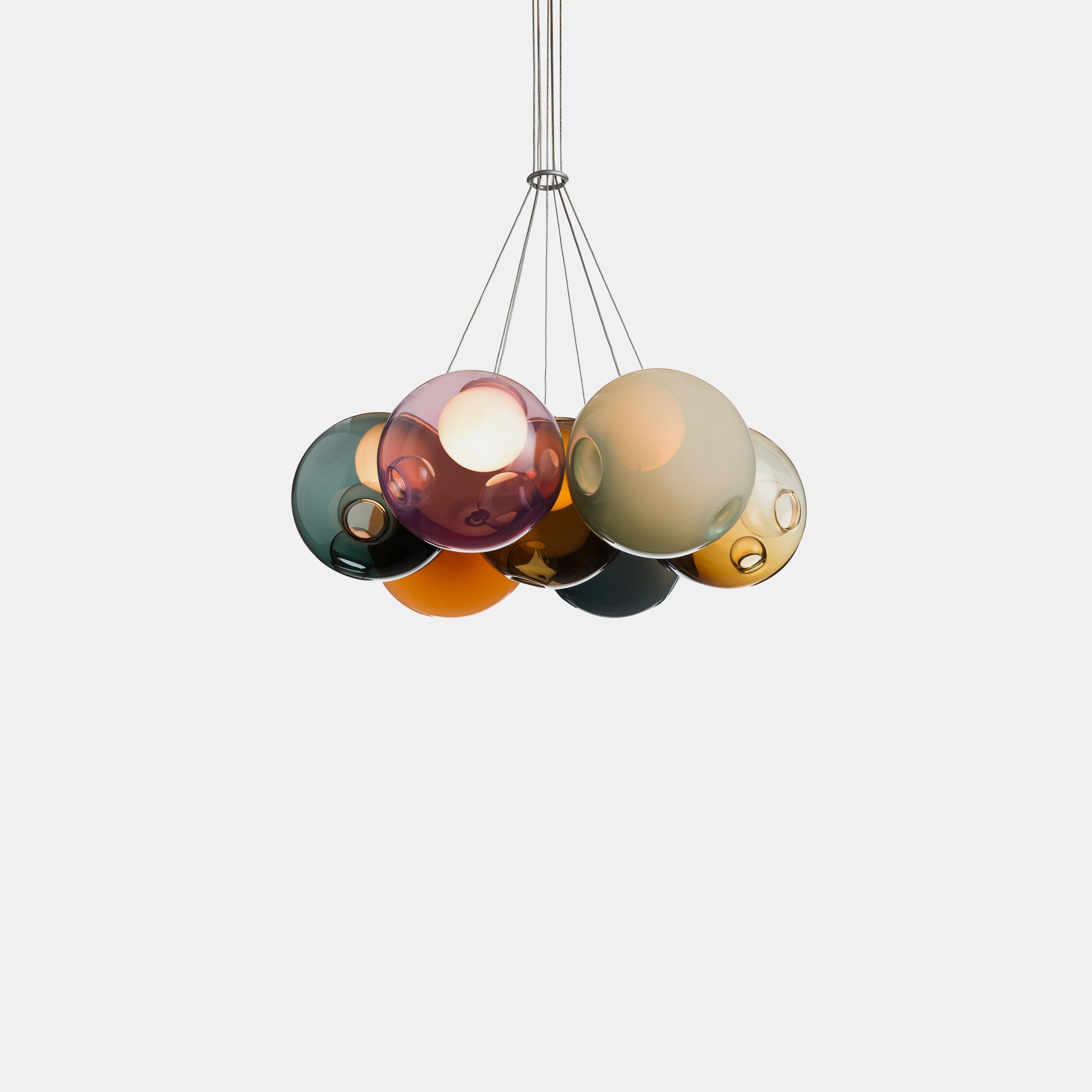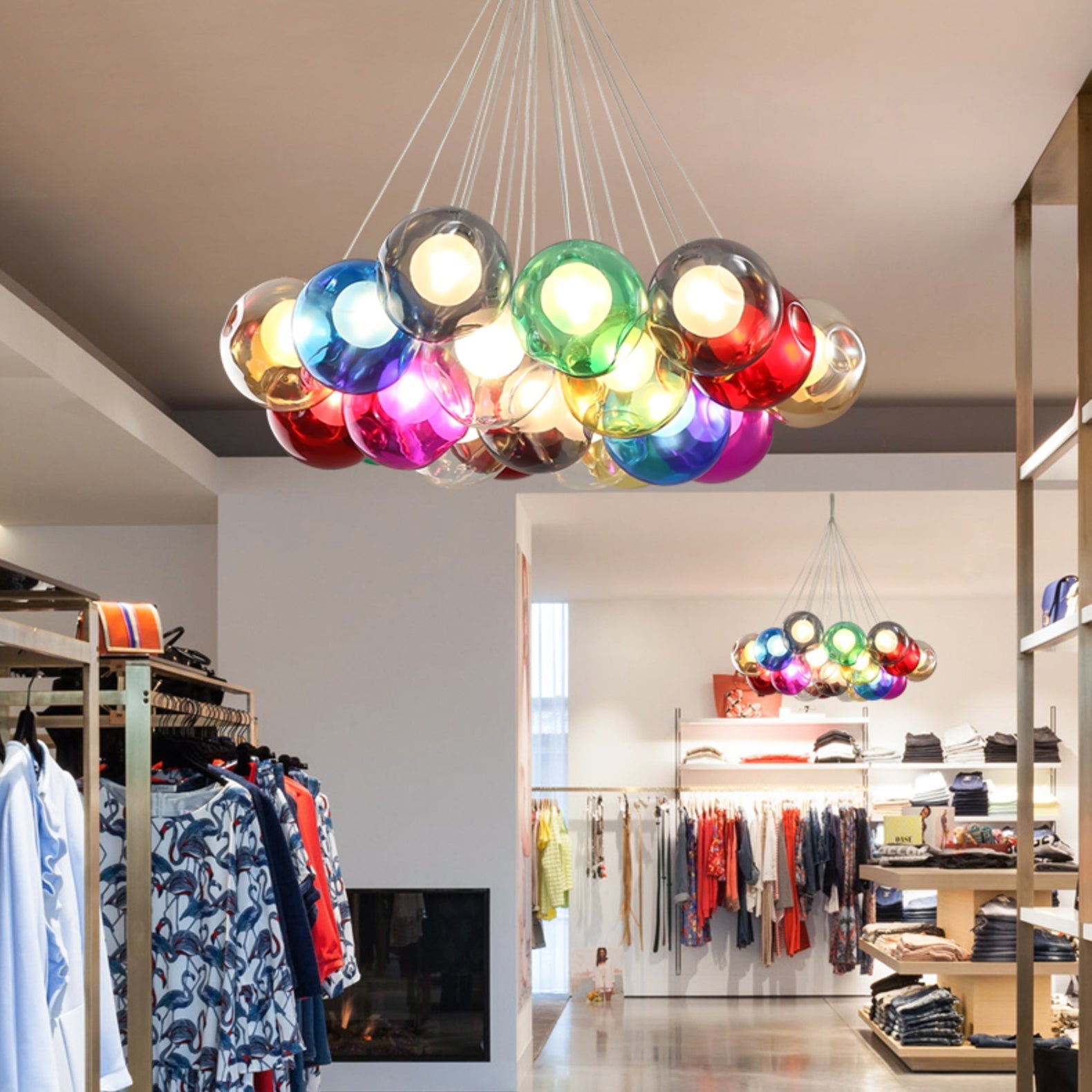 Explore the artistic allure of the 28 Multiple Colour Chandelier - Cluster – a stunning multi-light fixture that transforms any space into a contemporary design masterpiece. Each hand-blown glass sphere boasts a unique internal landscape, thanks to innovative airflow control technology that seamlessly blends natural beauty with meticulous engineering. Adjustable to your aesthetic preferences, it creates captivating patterns of light and shadow depending on its installation location.