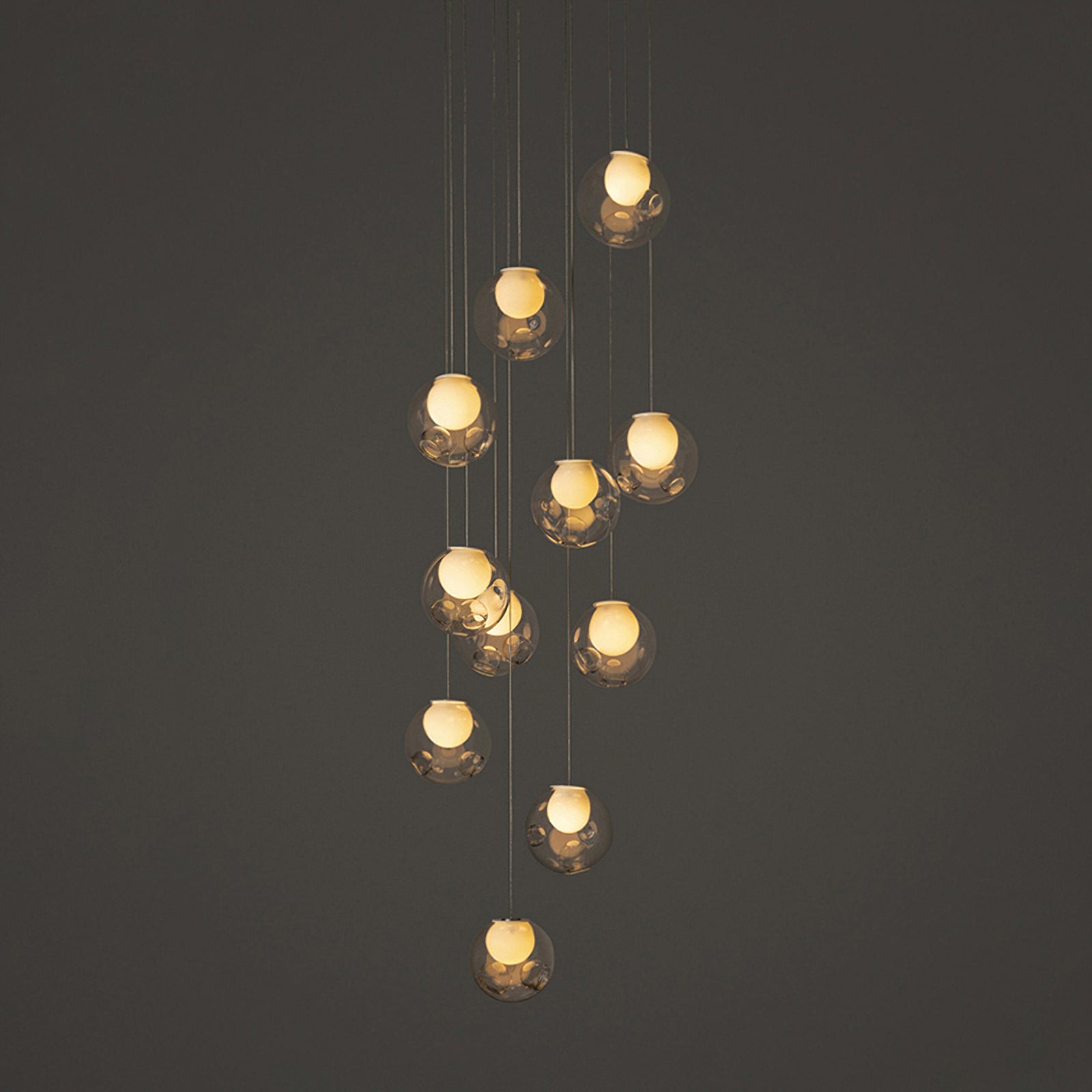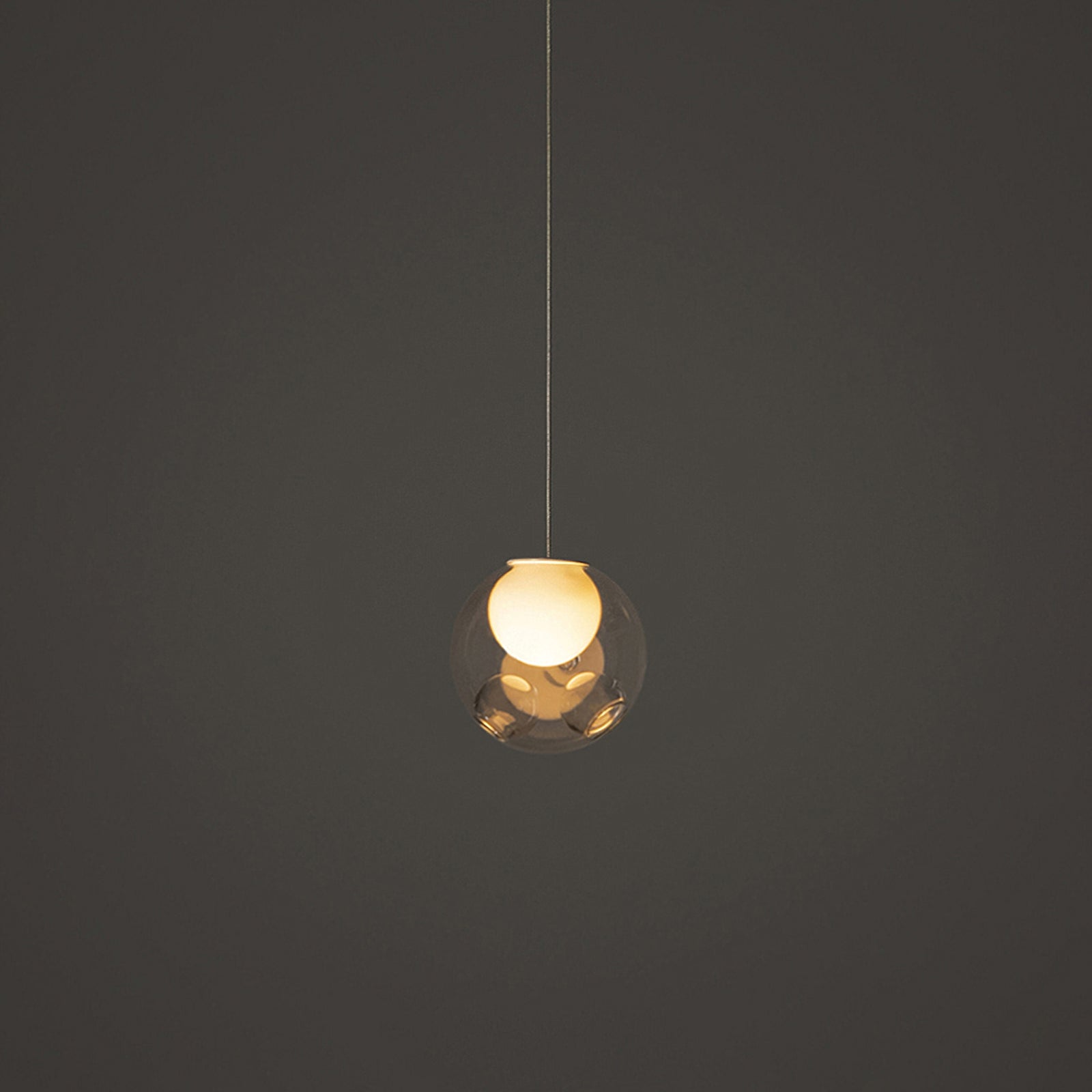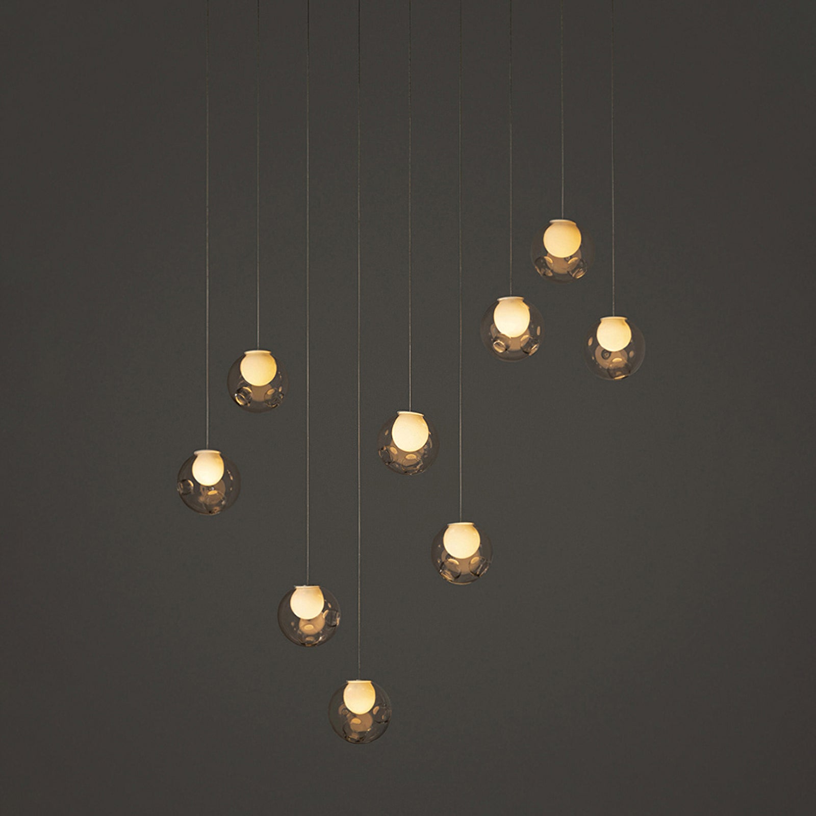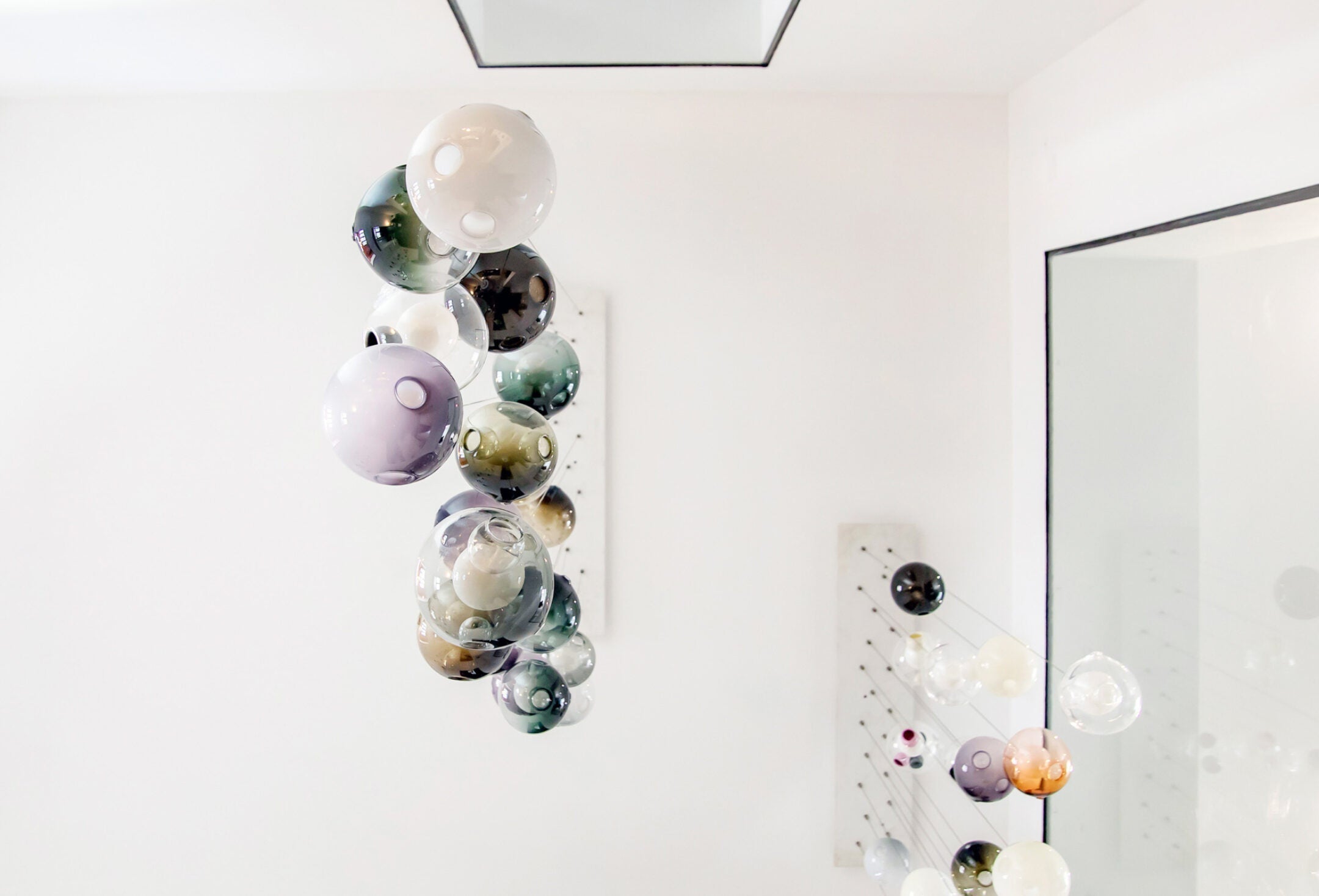 28 is an exploration of specificity in manufacturing. Instead of designing form itself, here the intent was to design a system of making that yields form. Individual 28 pendants result from a complex glass blowing technique whereby air pressure is intermittently introduced into and then removed from a glass matrix which is intermittently heated and then rapidly cooled. The result is a distorted spherical shape with a composed collection of imploded inner shapes, one of which acts as a shade for a low voltage (12V, 20W) xenon or LED light source. 28's are possible with infinite versatility in color compositions, sizes and shapes. Each sphere contains an interior landscape of satellite shapes, including an opaque milk glass diffuser.