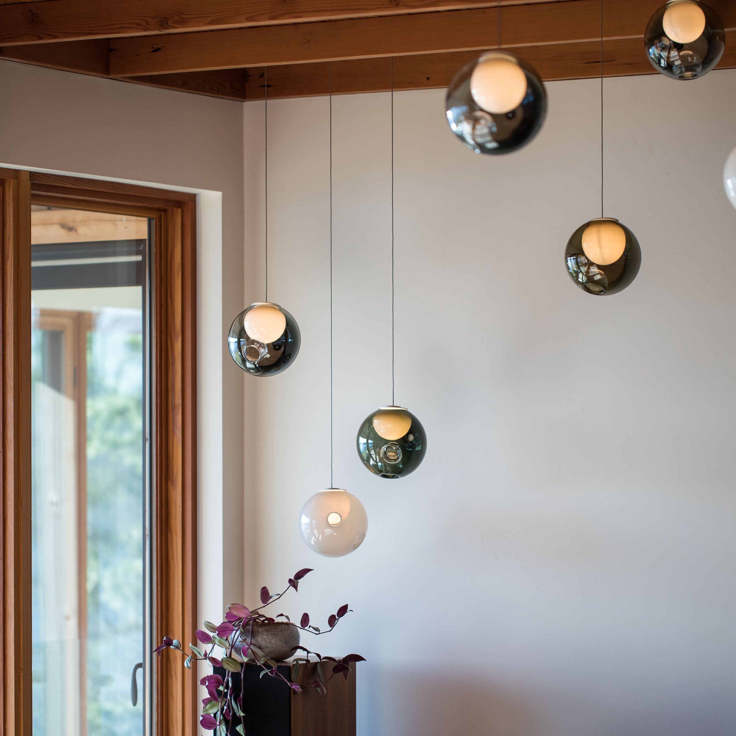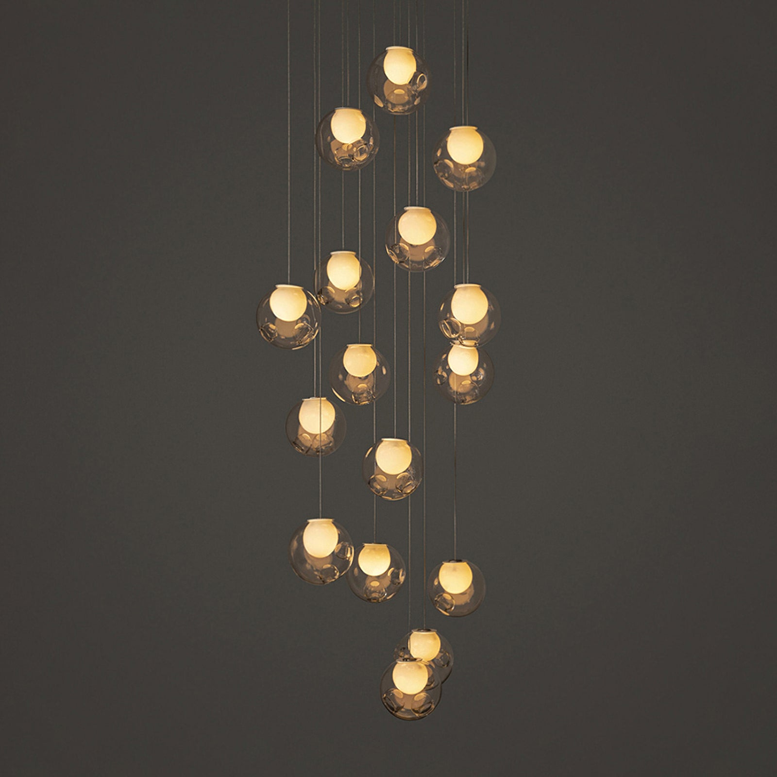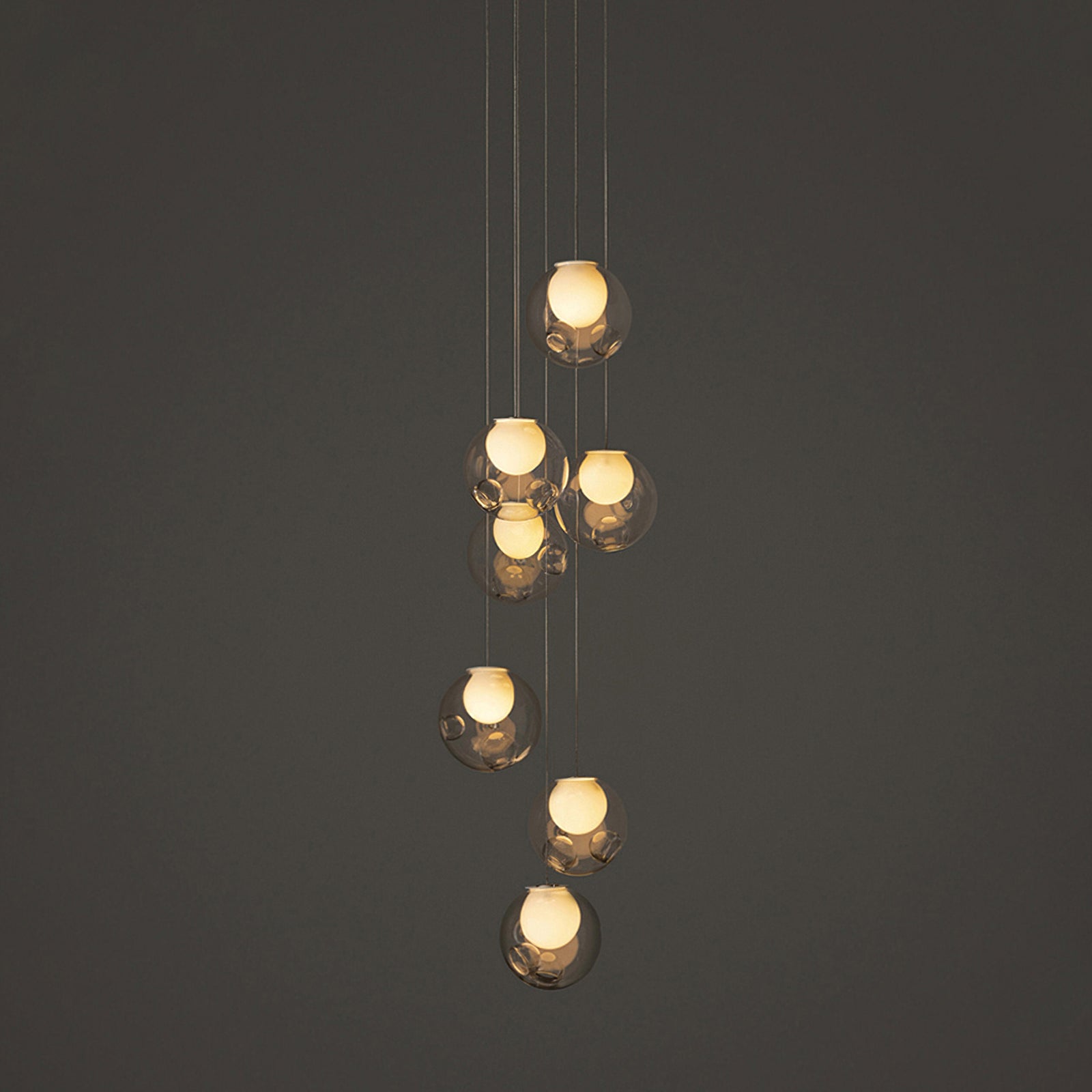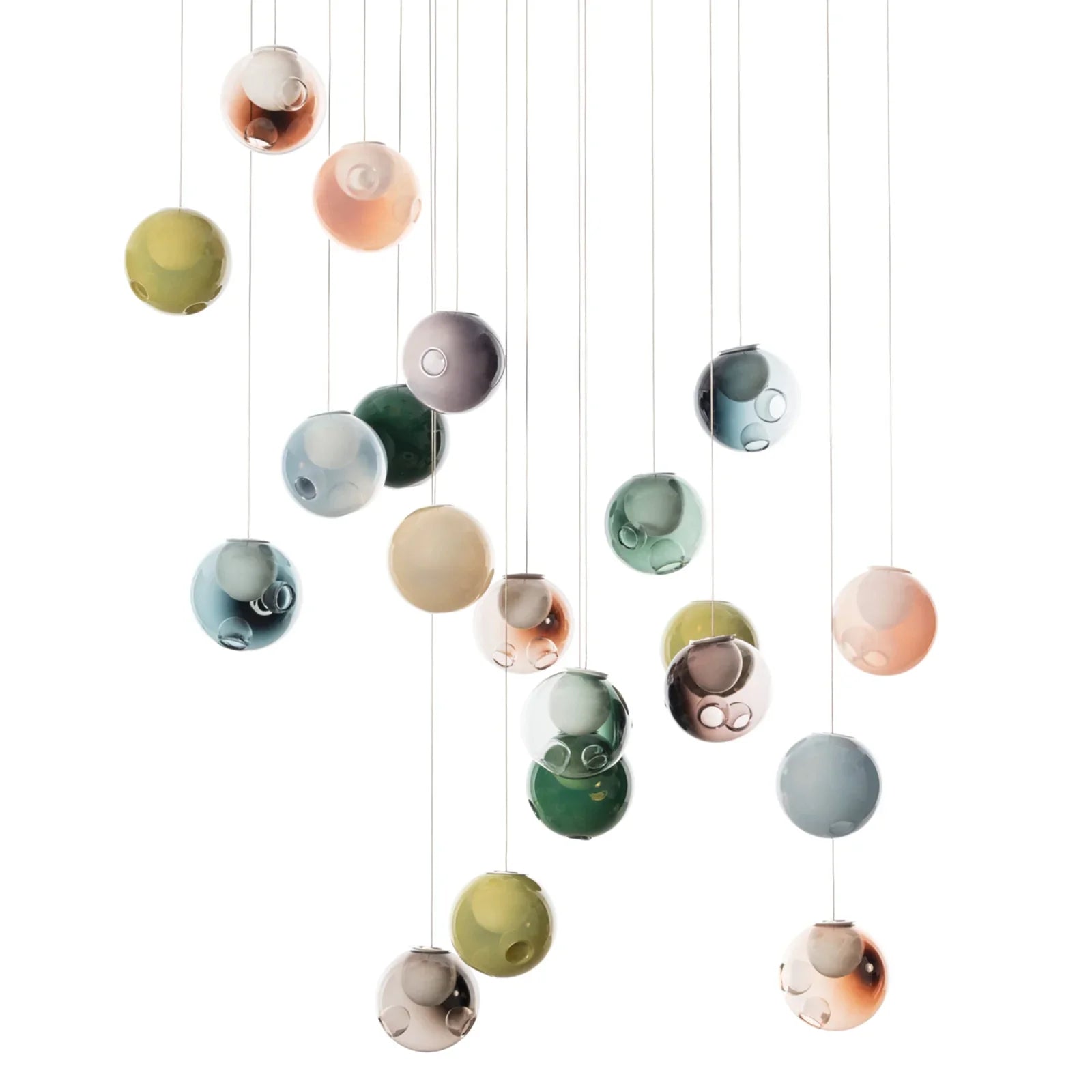 28 is an exploration of specificity in manufacturing. Instead of designing form itself, here the intent was to design a system of making that yields form. Individual 28 pendants result from a complex glass blowing technique whereby air pressure is intermittently introduced into and then removed from a glass matrix which is intermittently heated and then rapidly cooled. The result is a distorted spherical shape with a composed collection of imploded inner shapes, one of which acts as a shade for a low voltage (12V, 20W) xenon or LED light source. 28's are possible with infinite versatility in color compositions, sizes and shapes. Each sphere contains an interior landscape of satellite shapes, including an opaque milk glass diffuser.