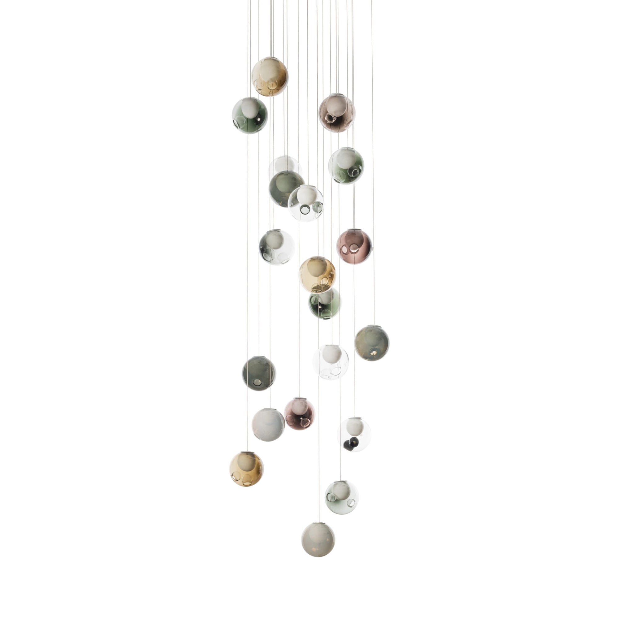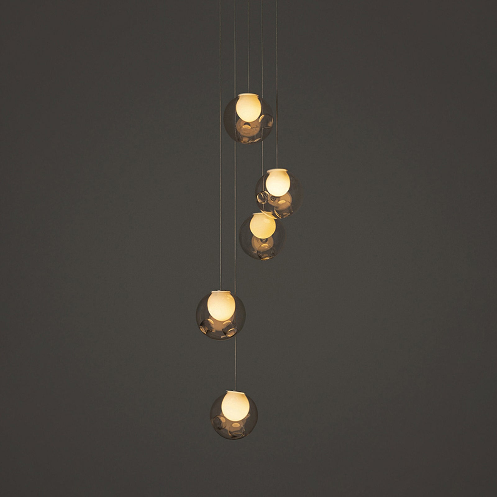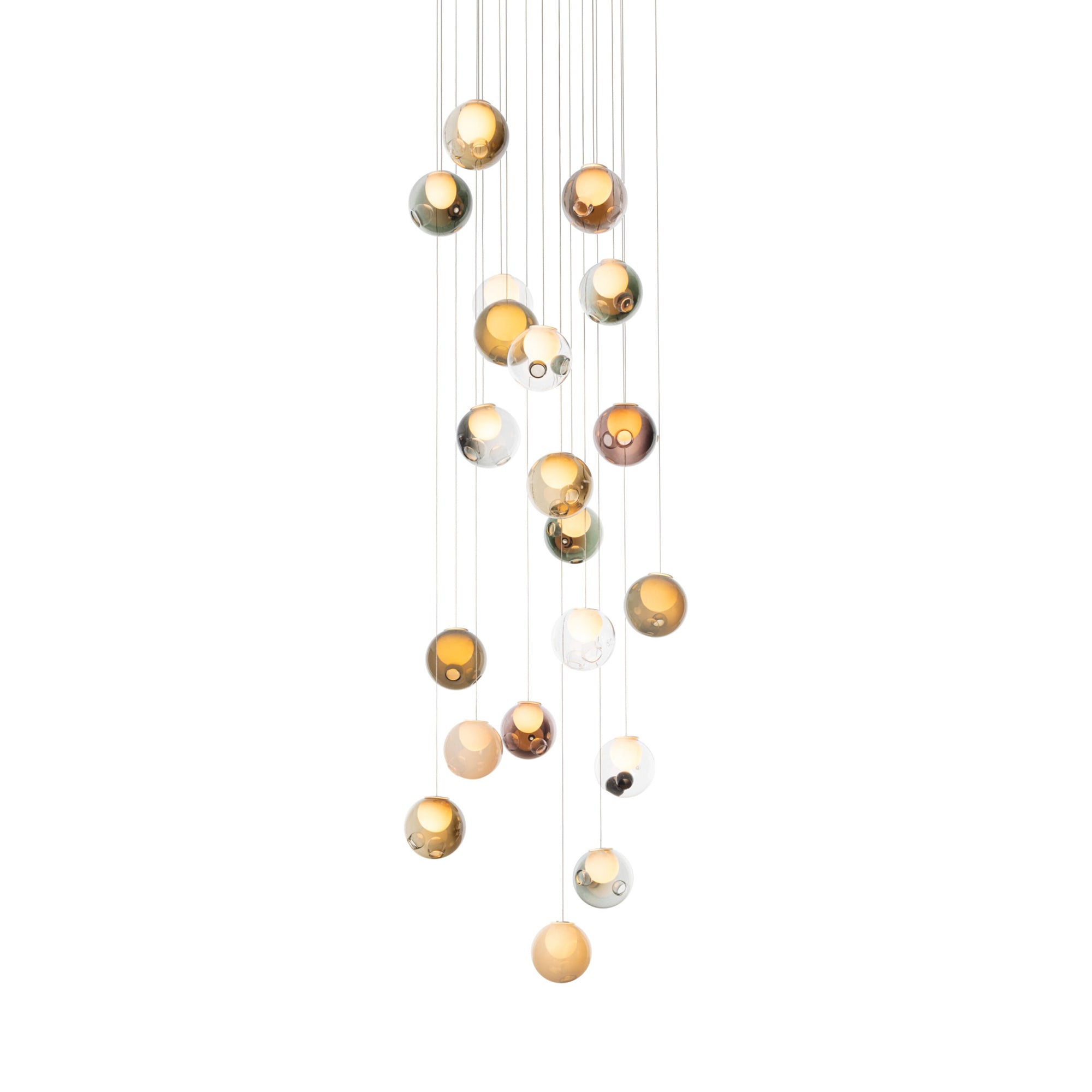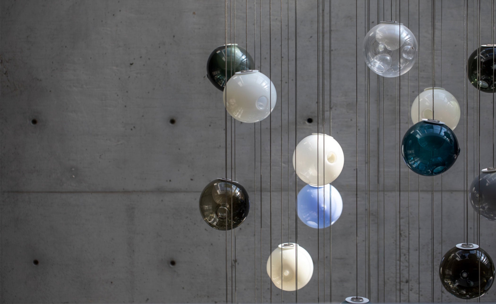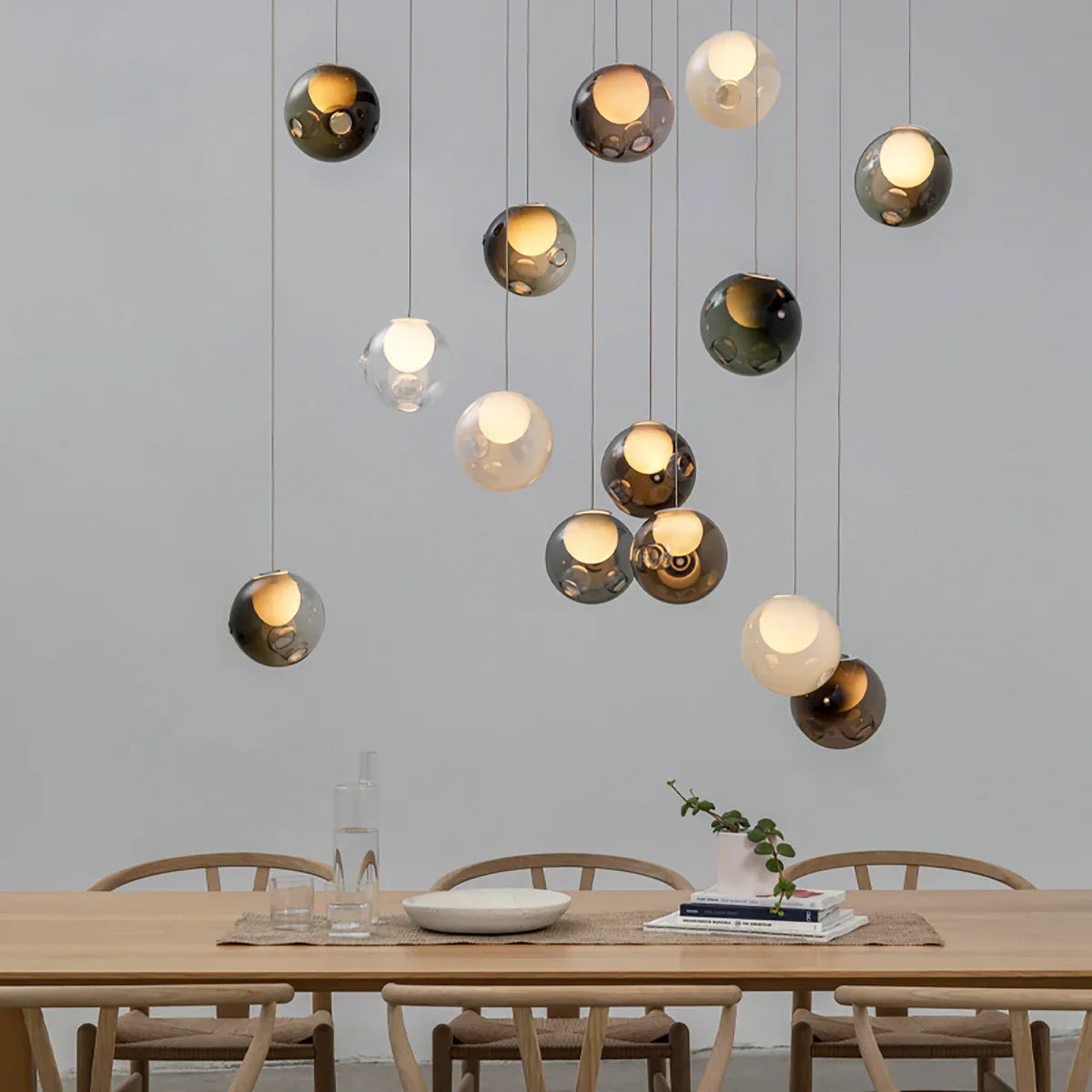 28 is an exploration of specificity in manufacturing. Instead of designing form itself, here the intent was to design a system of making that yields form. Individual 28 pendants result from a complex glass blowing technique whereby air pressure is intermittently introduced into and then removed from a glass matrix which is intermittently heated and then rapidly cooled. The result is a distorted spherical shape with a composed collection of imploded inner shapes, one of which acts as a shade for a low voltage (12V, 20W) xenon or LED light source. 28's are possible with infinite versatility in color compositions, sizes and shapes. Each sphere contains an interior landscape of satellite shapes, including an opaque milk glass diffuser.