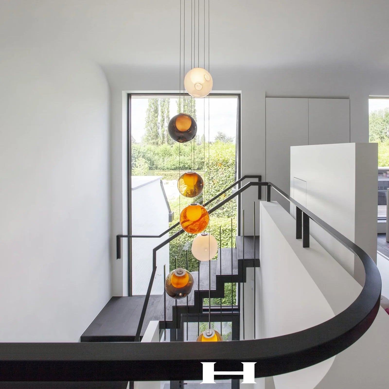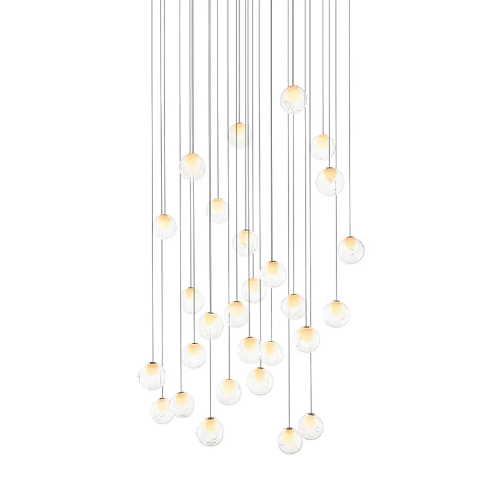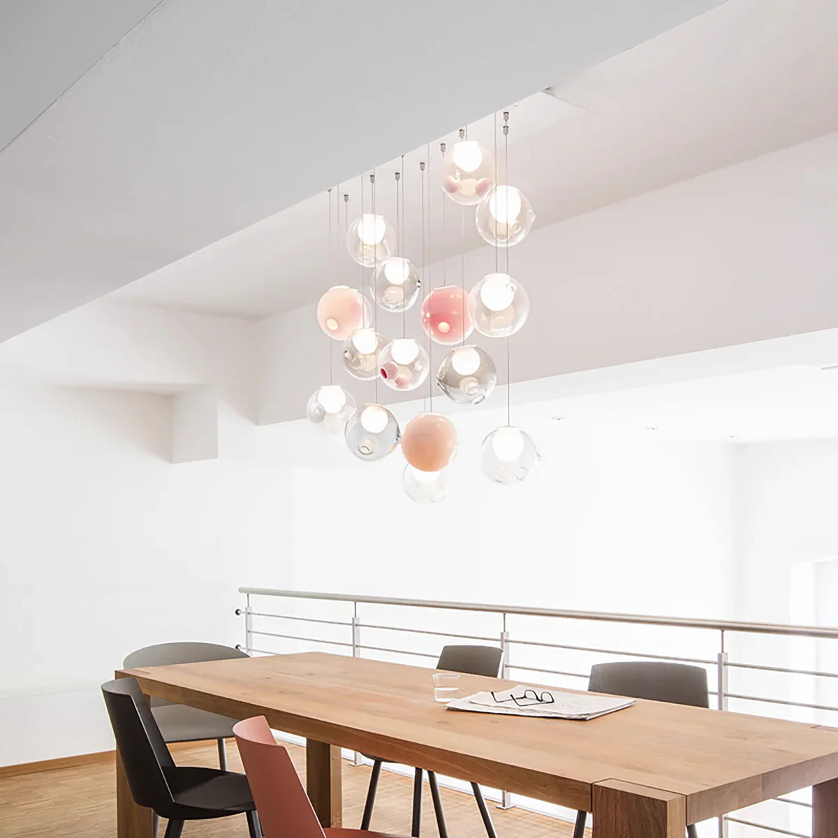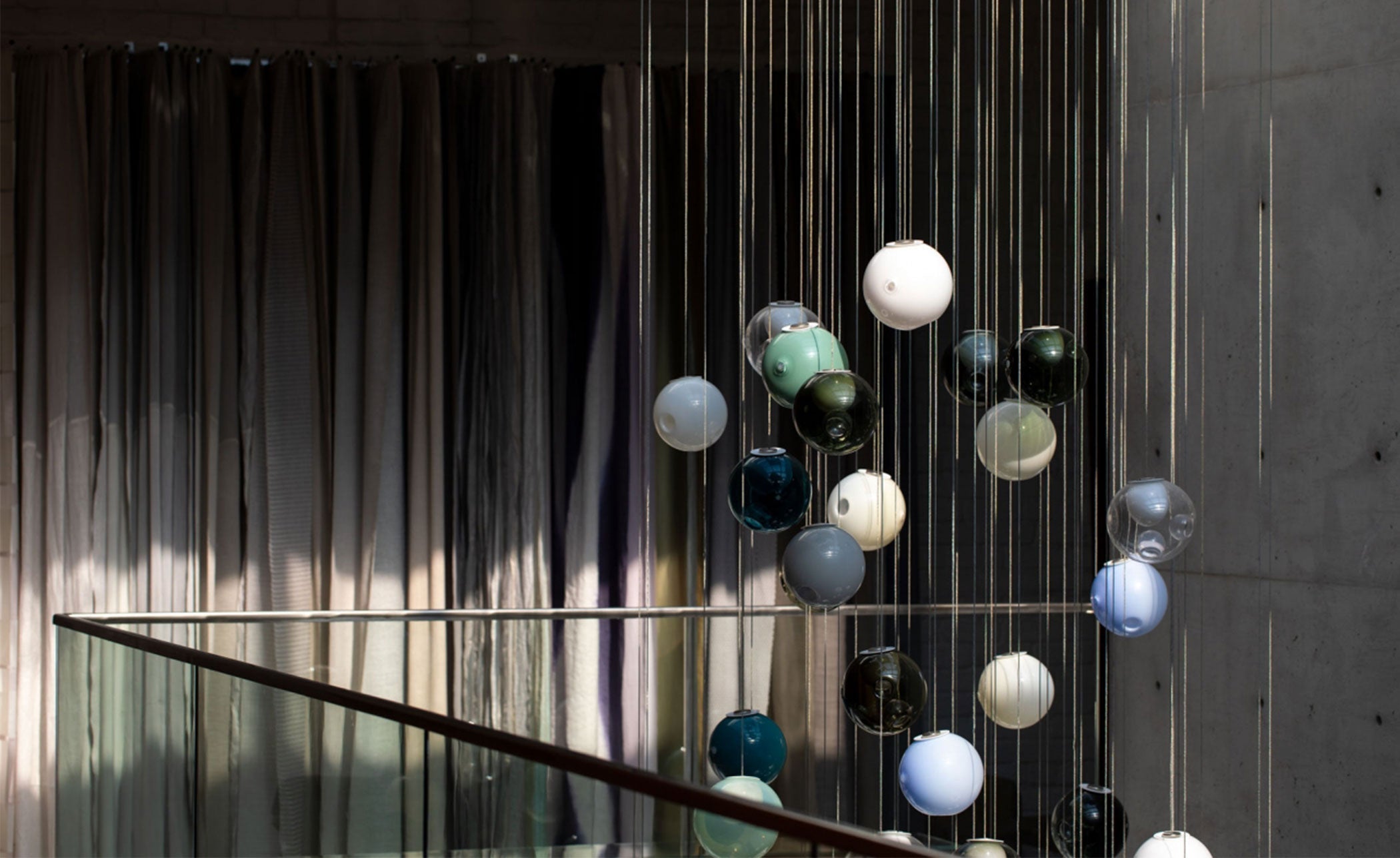 28 is an exploration of specificity in manufacturing. Instead of designing form itself, here the intent was to design a system of making that yields form. Individual 28 pendants result from a complex glass blowing technique whereby air pressure is intermittently introduced into and then removed from a glass matrix which is intermittently heated and then rapidly cooled. The result is a distorted spherical shape with a composed collection of imploded inner shapes, one of which acts as a shade for a low voltage (12V, 20W) xenon or LED light source. 28's are possible with infinite versatility in color compositions, sizes and shapes. Each sphere contains an interior landscape of satellite shapes, including an opaque milk glass diffuser.