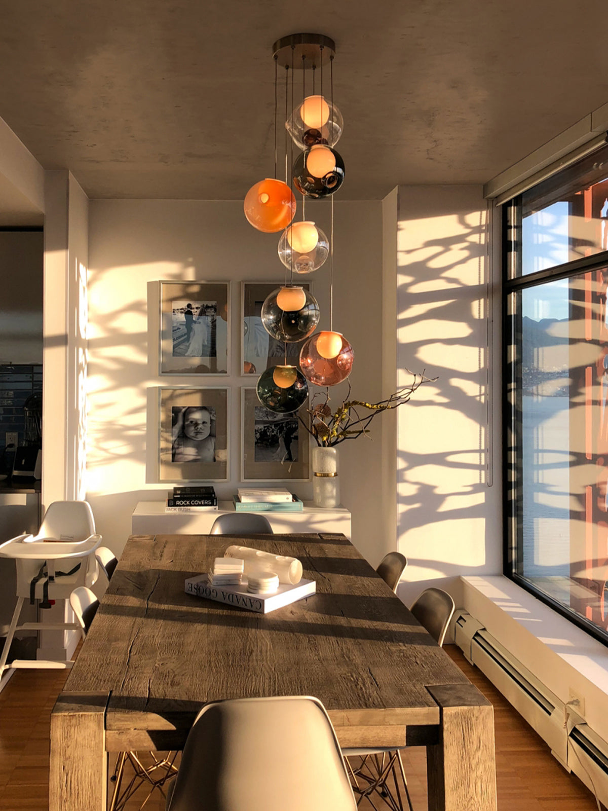 Brings that clean, crisp look to our space, the acrylic spheres soften the light so it's not glaring. Provides excellent lighting while still being a stunning decorative piece. I'm very happy with this purchase.