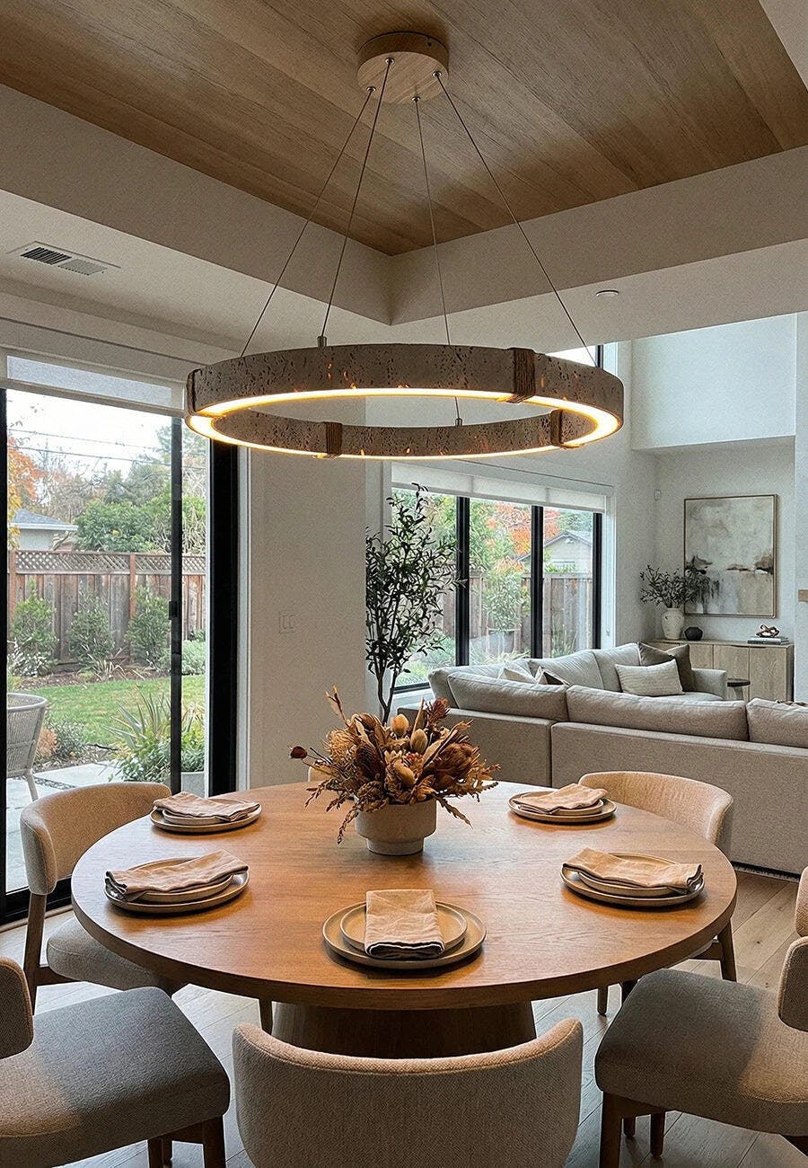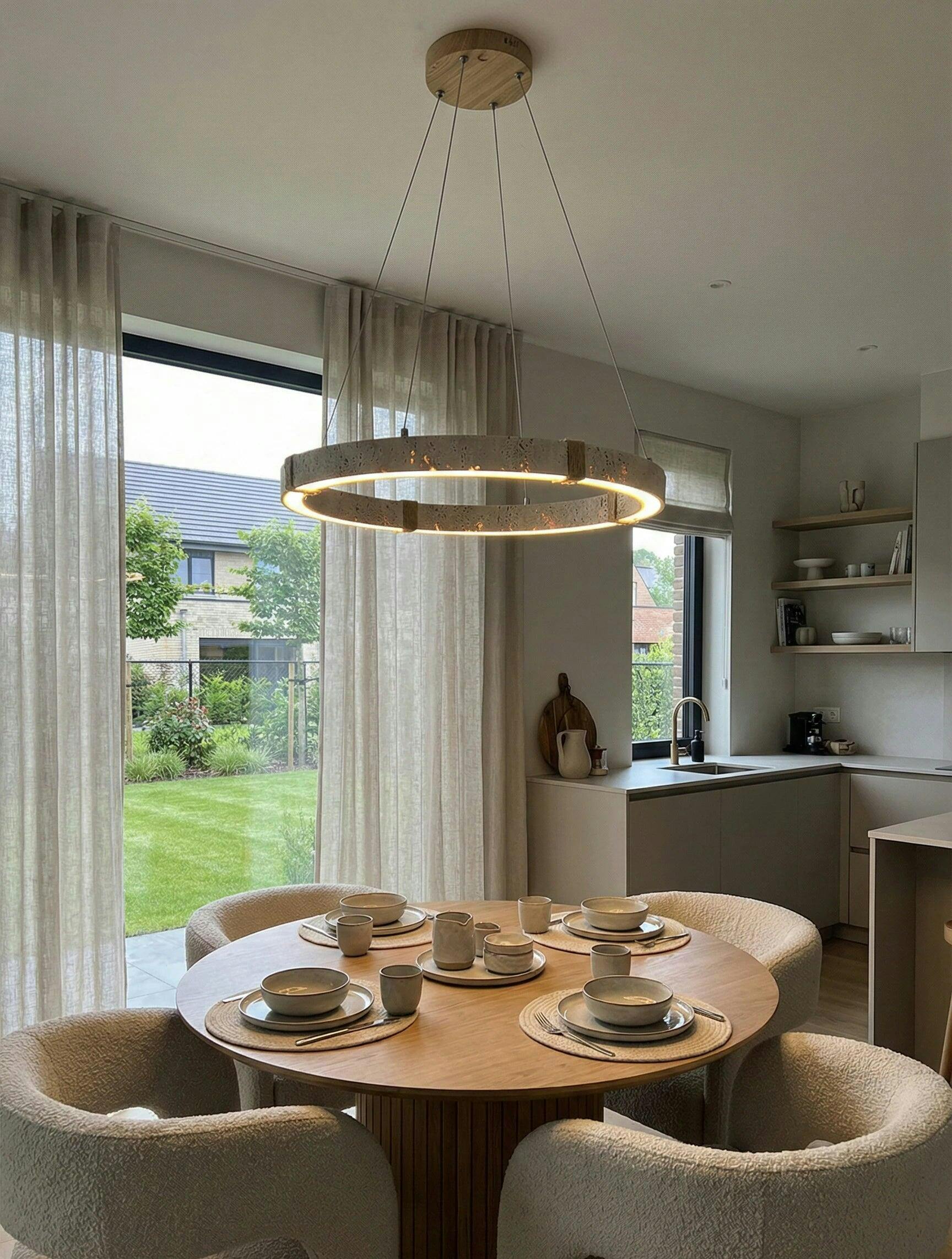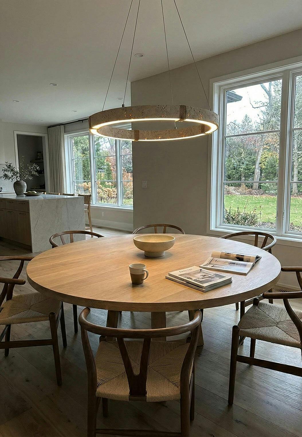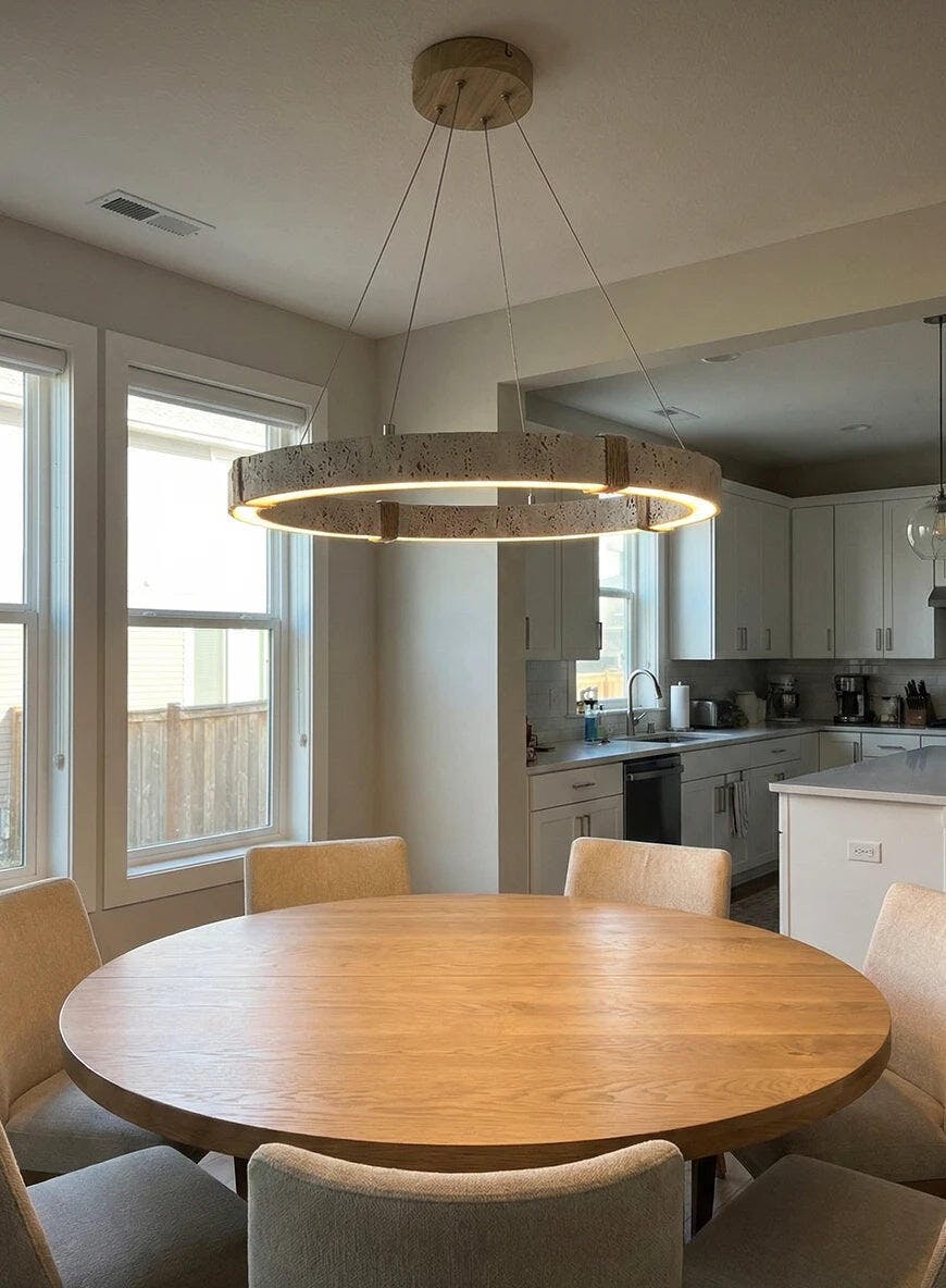 Discover understated elegance with the Round Travertine Dainolite Chandelier. This striking fixture marries contemporary design with the organic warmth of natural stone, featuring a circular travertine frame suspended by delicate cables. The illuminated ring accentuates the stone's rich texture, casting a sophisticated glow that transforms any space. Perfect for those seeking a lighting solution that balances artistic presence with functional illumination, this chandelier makes a refined statement in modern interiors.