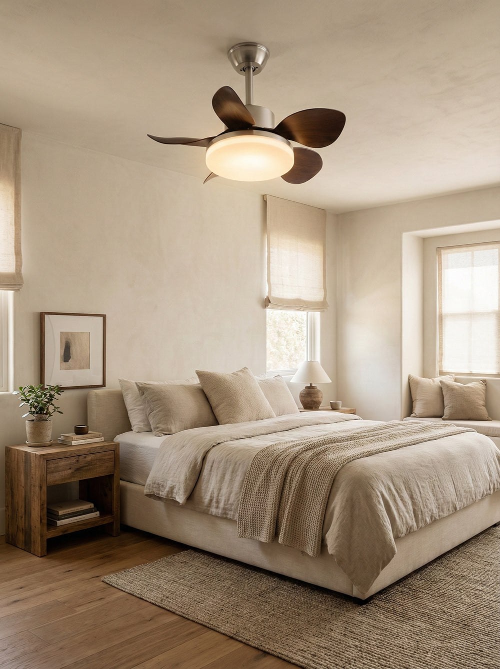 Featuring classic dark walnut blades and a meticulously crafted body with an exquisite, sculpted design, its handcrafted furniture-like quality makes it a perfect match for warm, earthy interior palettes. The five-blade design ensures exceptional balance and powerful airflow. Combined with a wide, frosted LED diffuser, it provides efficient cooling while emitting a soft, dawn-like ambient light. It supports forward rotation for cooling in summer and reverse rotation for air circulation in winter, effectively promoting indoor air movement.