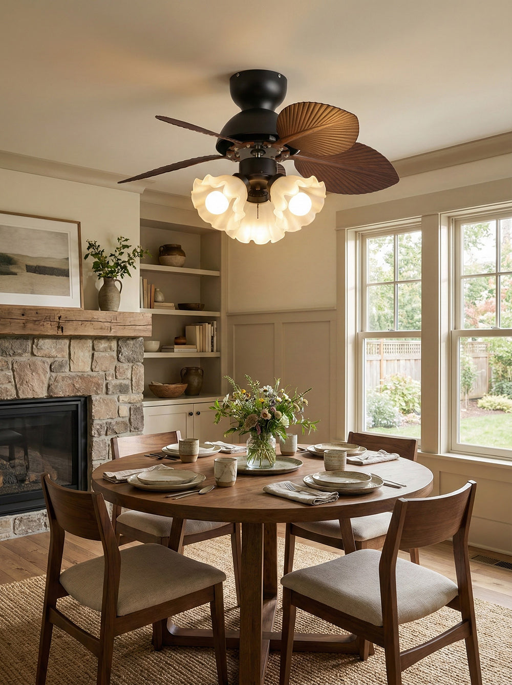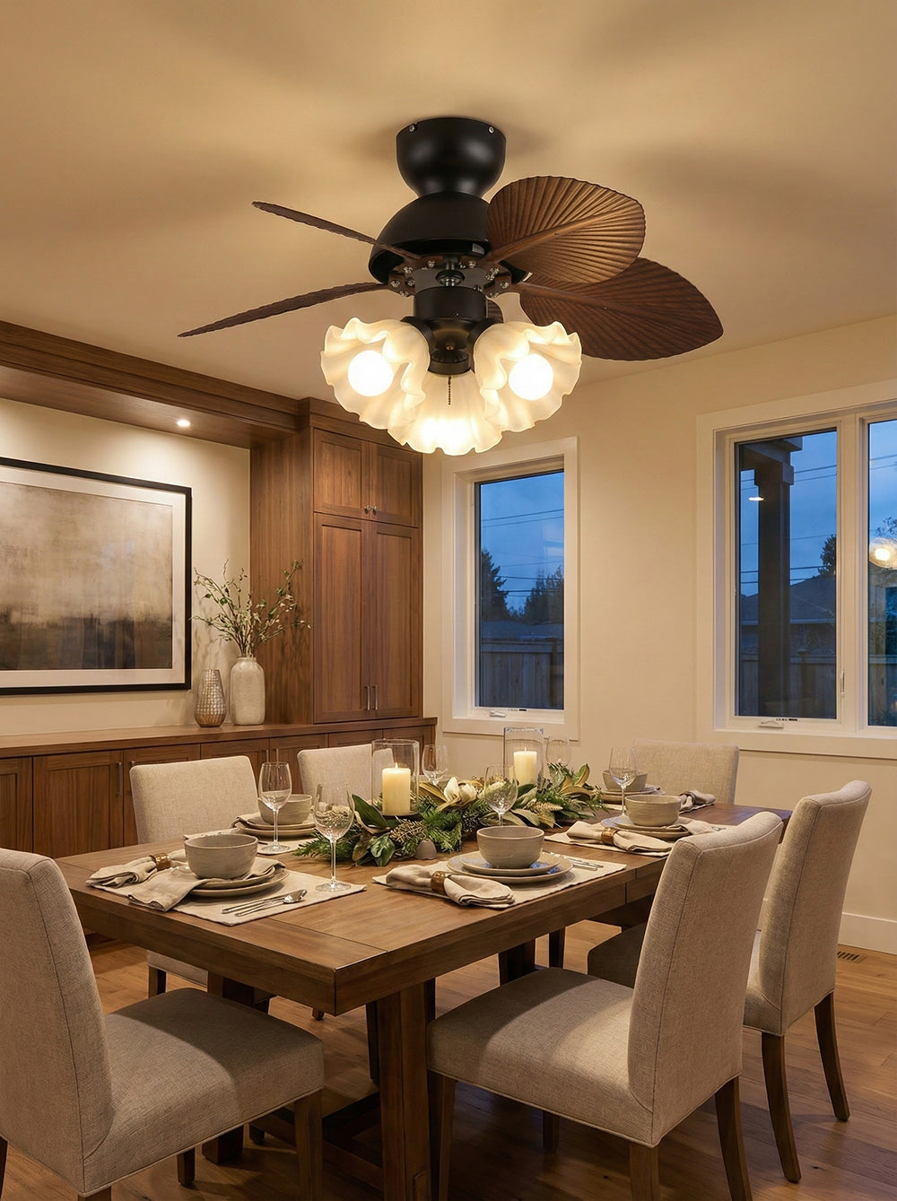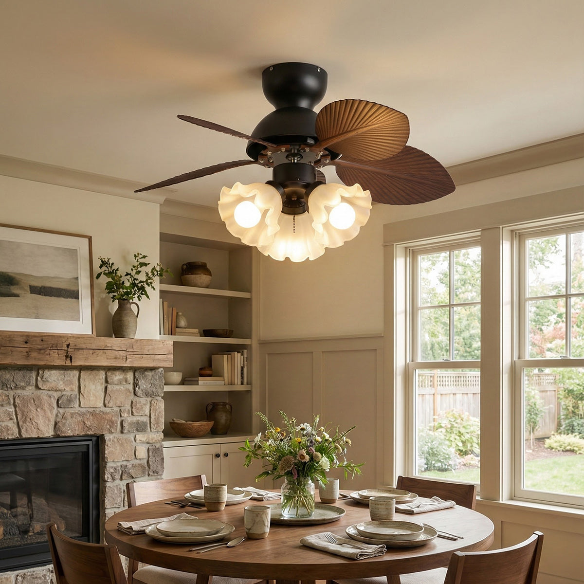 Let the beauty of nature blossom indoors. The Palm Leaves Flower Shape Ceiling Fan Light perfectly blends the vibrant charm of plants with a vintage, elegant silhouette, creating a highly distinctive, artistic home appliance. It provides soft ambient lighting while ensuring powerful yet quiet airflow. Whether it's an American vintage, French country, or nature-inspired study, it serves as a visual centerpiece that elevates the soul of the space.