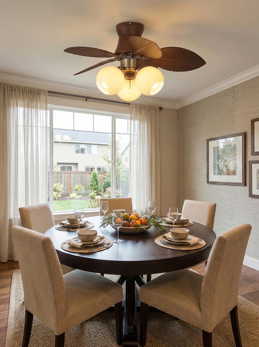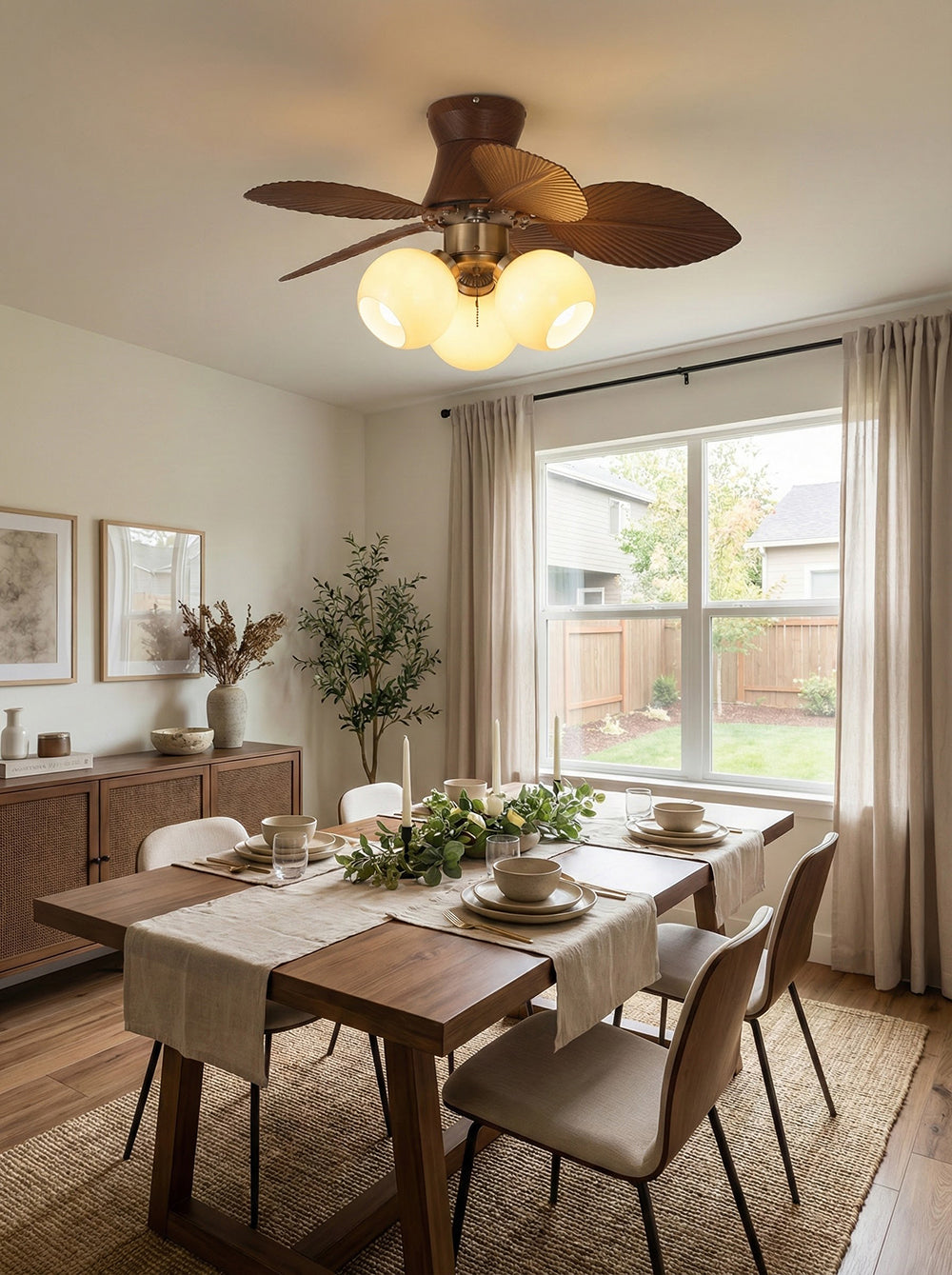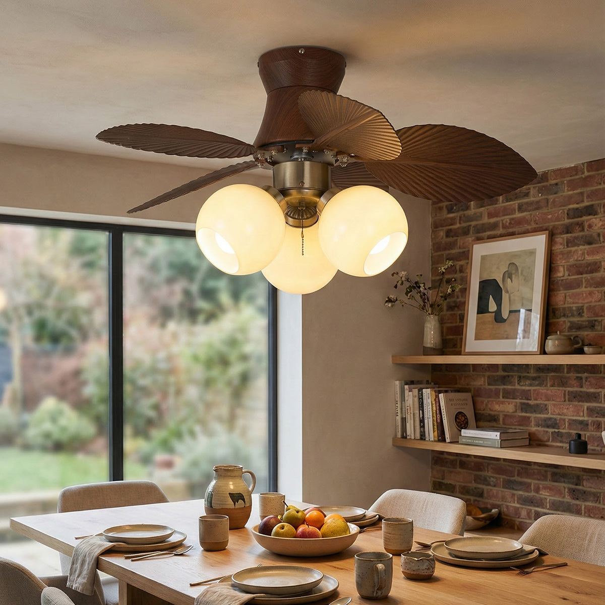 The dark wood-grain motor housing complements the vintage bronze bracket, perfectly suiting natural-themed decor, sunrooms, French vintage, or Southeast Asian styles. The three glass globe lampshades at the bottom provide soft and even lighting, creating a warm and inviting atmosphere. It achieves a perfect balance of natural aesthetics, vintage charm, and modern airflow technology.