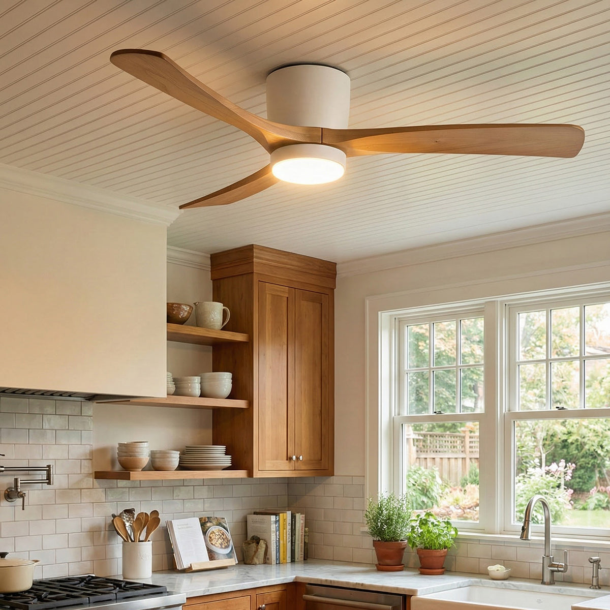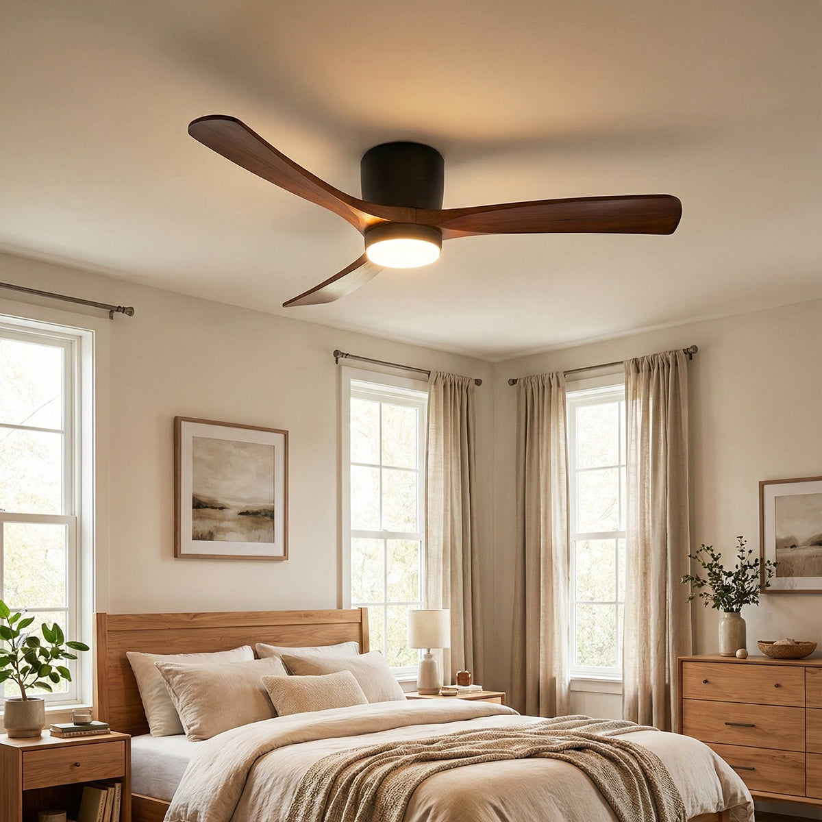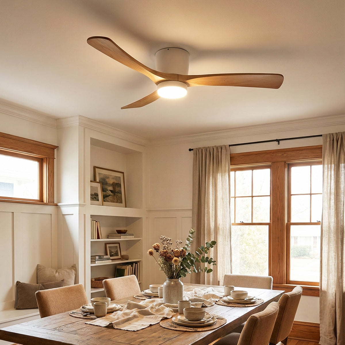 Featuring selected solid wood blades, the streamlined three-blade design showcases a clean, minimalist Nordic silhouette. The natural wood texture blends perfectly with wood-themed, Japanese Wabi-Sabi, or modern minimalist home decor styles, adding a touch of natural elegance to the room. It ensures balanced airflow coverage and just the right visual proportions, whether in a cozy bedroom or a spacious living room. Equipped with an advanced motor, it operates smoothly and efficiently, providing a quiet and cool experience. The built-in integrated LED light source provides soft, non-glaring light, creating a warm and relaxing home atmosphere.