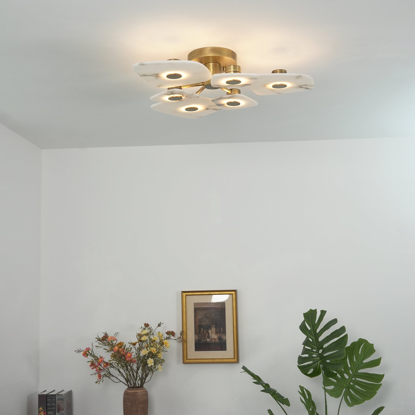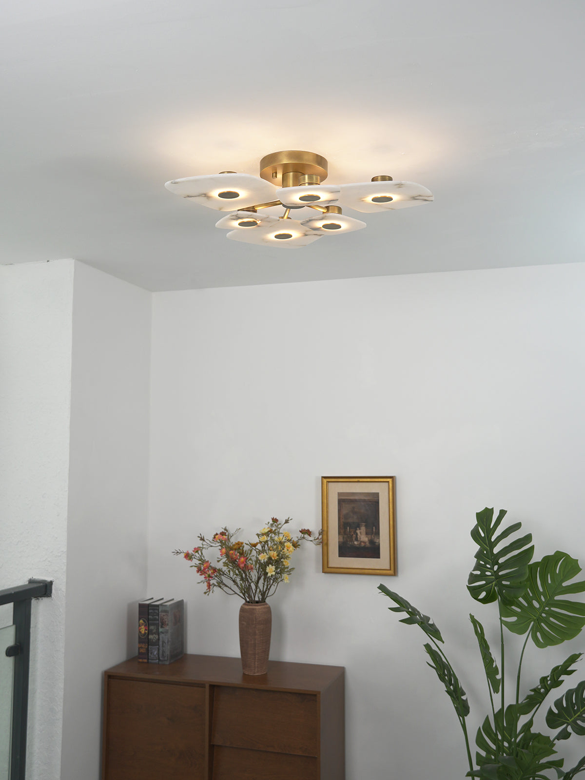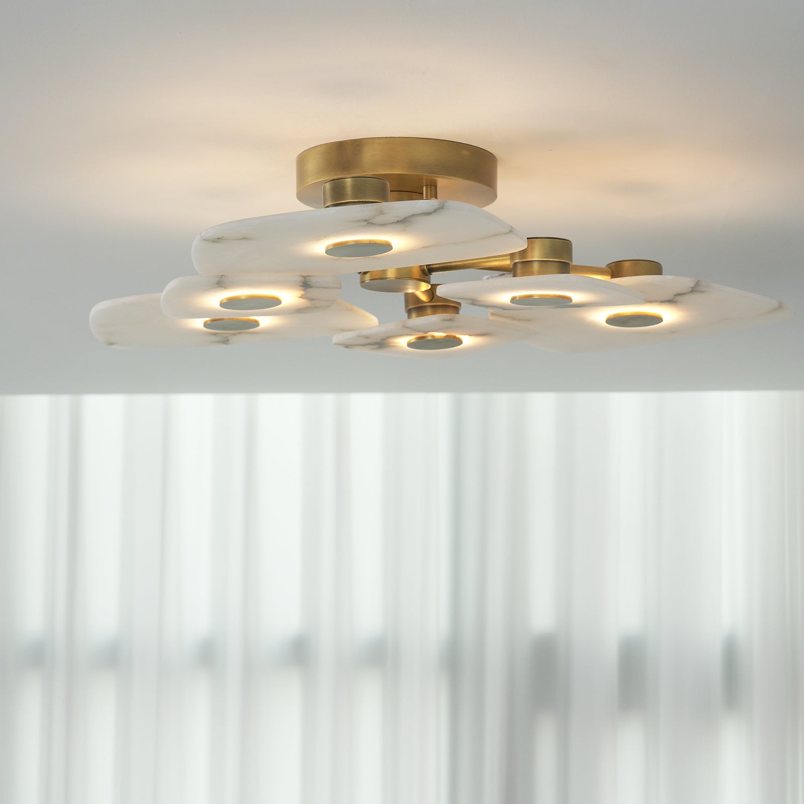 Fusing creative craftsmanship with modern LED lighting, this captivating fixture features natural alabaster slabs that glow beautifully. Set within a refined Aged Brass frame, each alabaster piece is uniquely shaped, emphasizing the custom-made quality. Available as a sconce or semi-flush mount in two sizes, the Alabaster Holmdel Ceiling Lamp is a prized example of contemporary design.