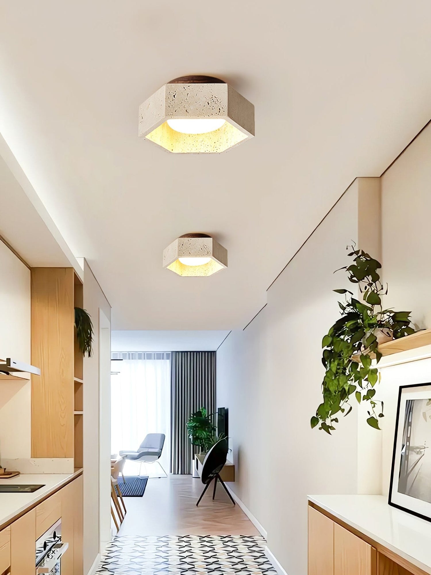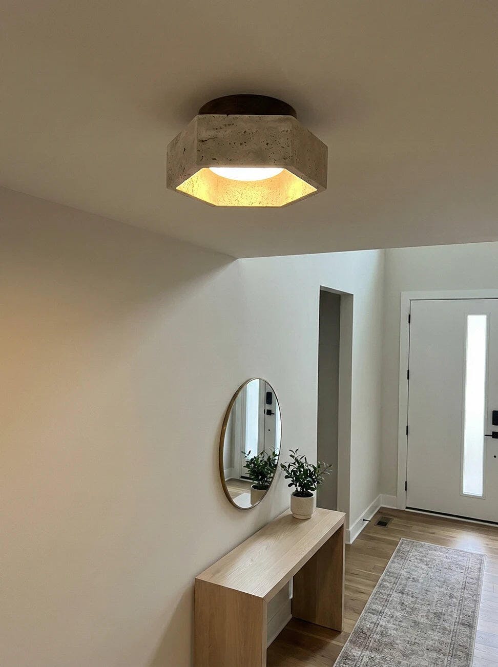 Make a striking architectural statement with the Hexagon Travertine Hexa Core Ceiling Light. This sculptural fixture harnesses natural travertine's distinctive texture and warmth, shaped into a commanding hexagonal form that anchors any space. The downward-directed glow accentuates the stone's organic character while delivering focused illumination perfect for entryways, kitchens, and hallways. Minimalist yet bold, it's the ideal choice for design-forward homes that demand both visual impact and functional elegance.