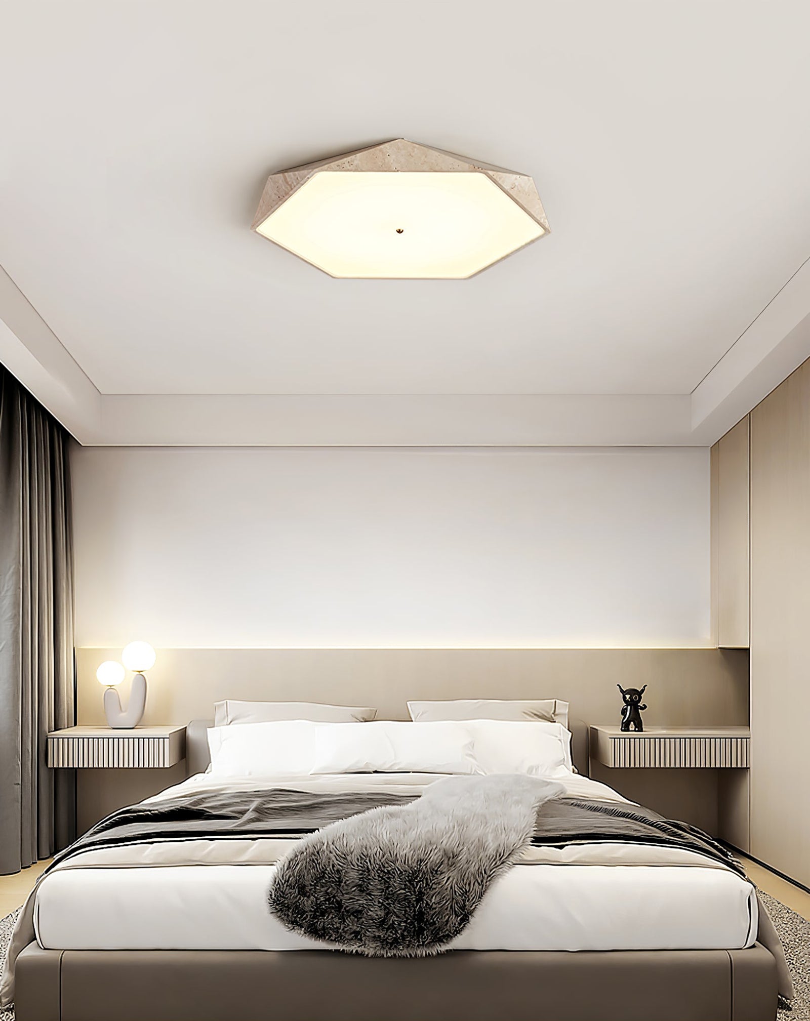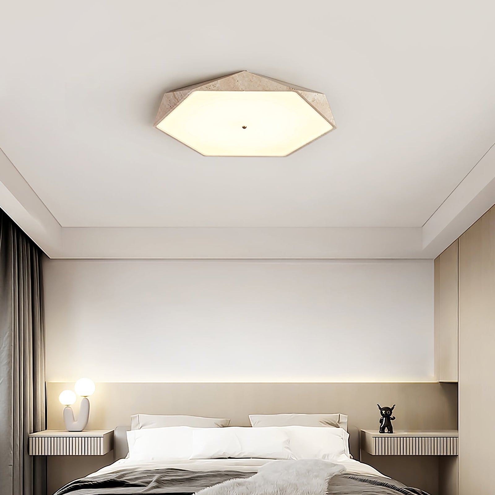 The Hexagonal Travertine Lunarc Stone Ceiling Lamp brings gallery-worthy design to your home. Featuring a sculptural travertine frame paired with a soft hexagonal glass diffuser, this fixture creates an inviting warm glow that complements modern aesthetics. The geometric silhouette draws inspiration from natural crystal formations, while its compact flush-mount profile fits seamlessly into any ceiling. Perfect for discerning homeowners who refuse to compromise between style and substance—this is lighting that makes a statement without demanding attention.