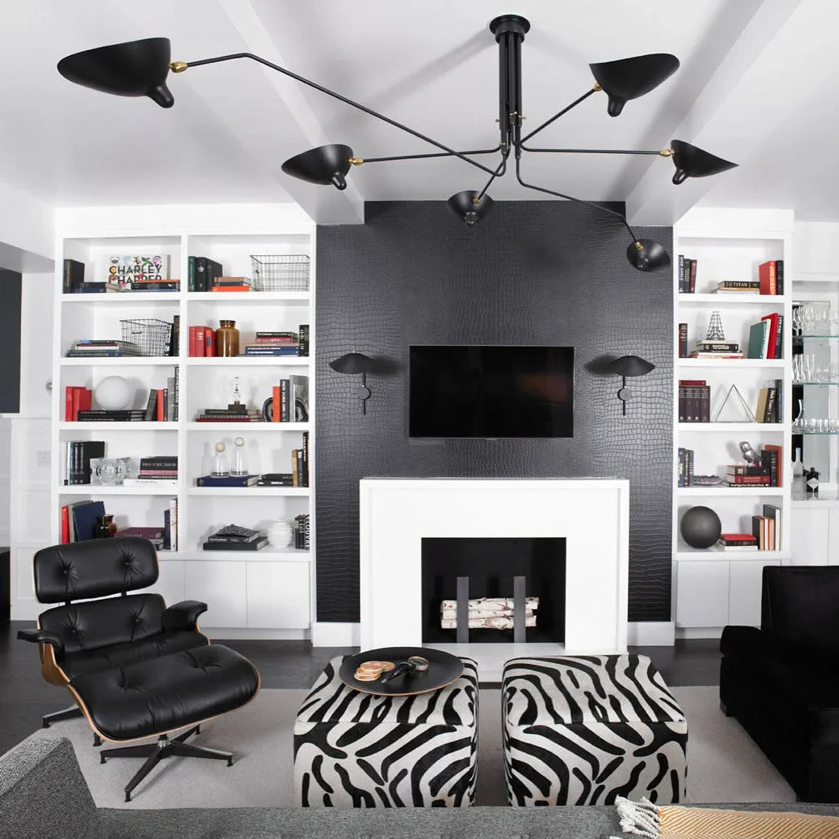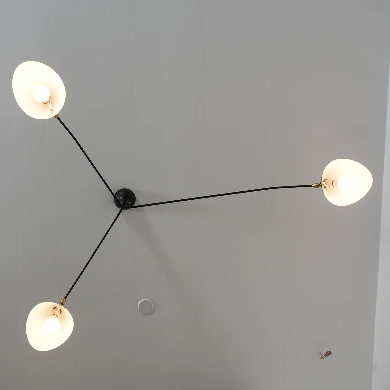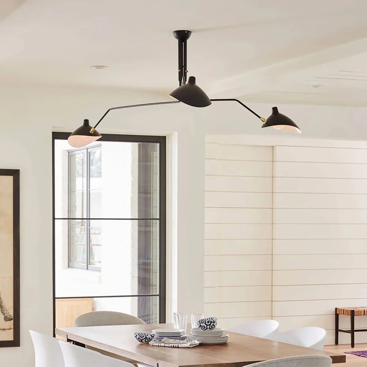 Serge Mouille Ceiling Light A, Command your lighting with this sculptural ceiling fixture that merges form and function seamlessly. Three articulated arms with pivoting shades rotate on a 360° pole, giving you precision control over illumination angles and coverage. Whether you're setting the mood in a living room, brightening a dining space, or powering a productive workspace, this fixture adapts to your needs. Its iconic mid-century modern design elevates any room while its intelligent engineering ensures light reaches exactly where you want it—style and substance in perfect balance.