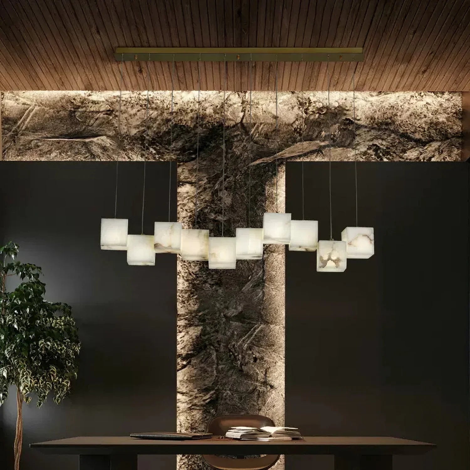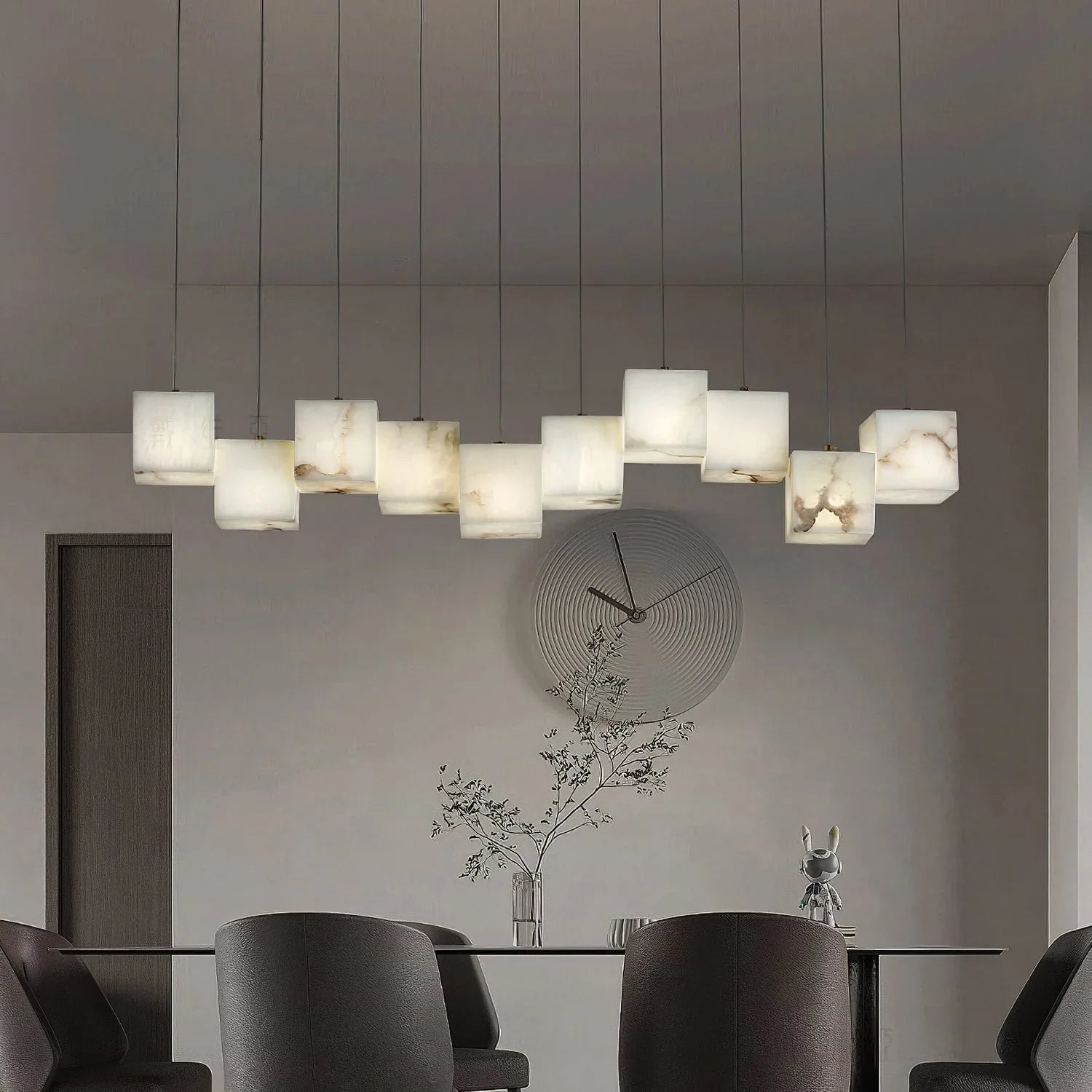 This chandelier features a minimalist design and versatile style that perfectly captures a romantic ambiance. Crafted from natural alabaster sourced from Spain, each hand-made stone showcases its inherent texture and softness, creating a beautiful, natural look. The emphasis on texture highlights the stone's exquisite qualities, resulting in a pure and understated aesthetic.