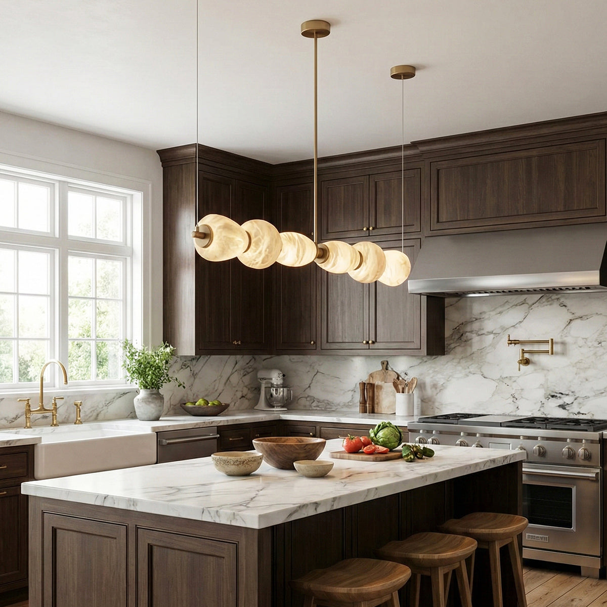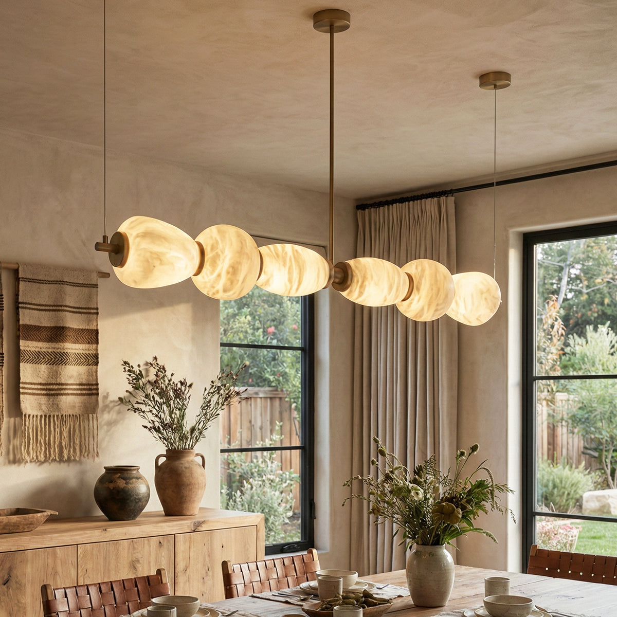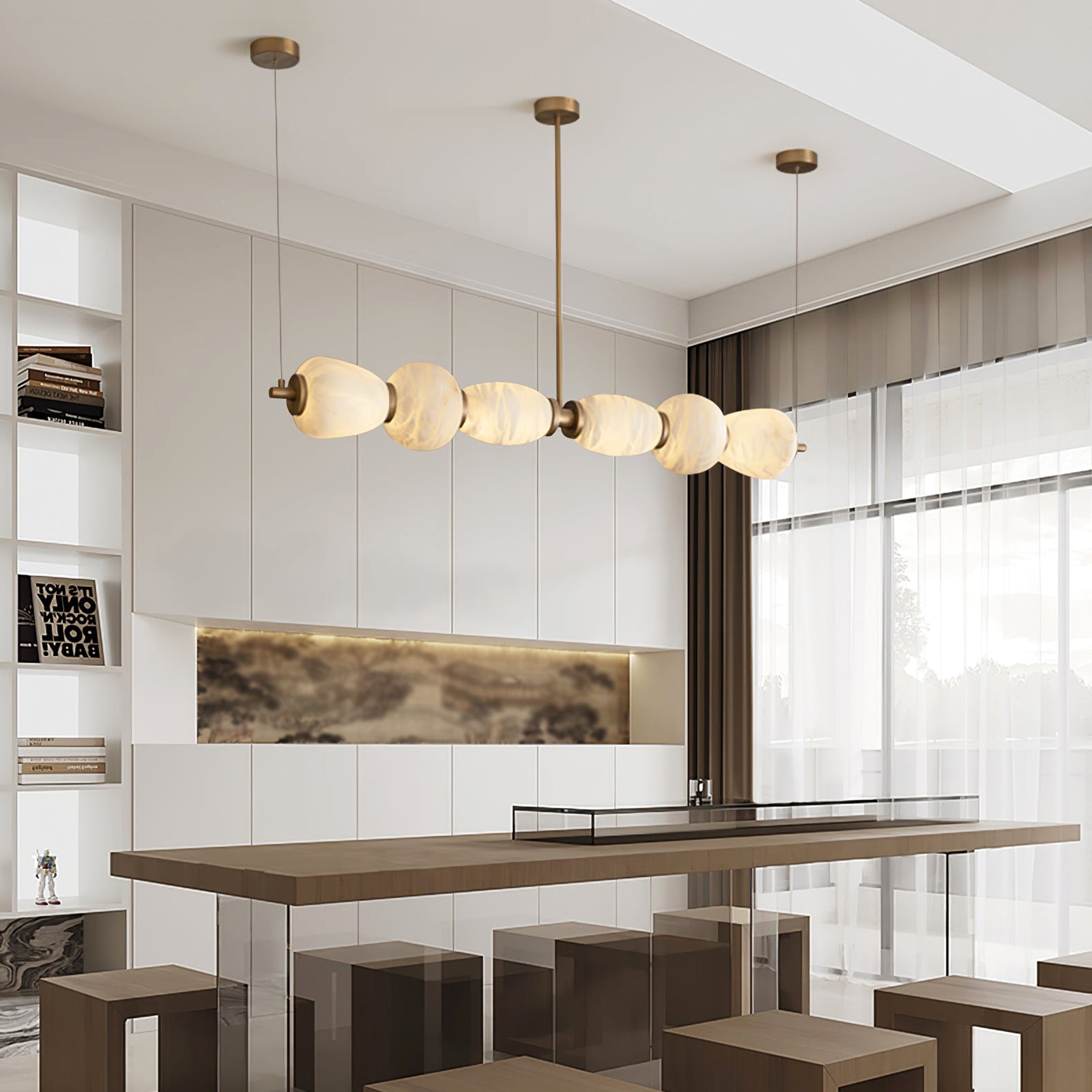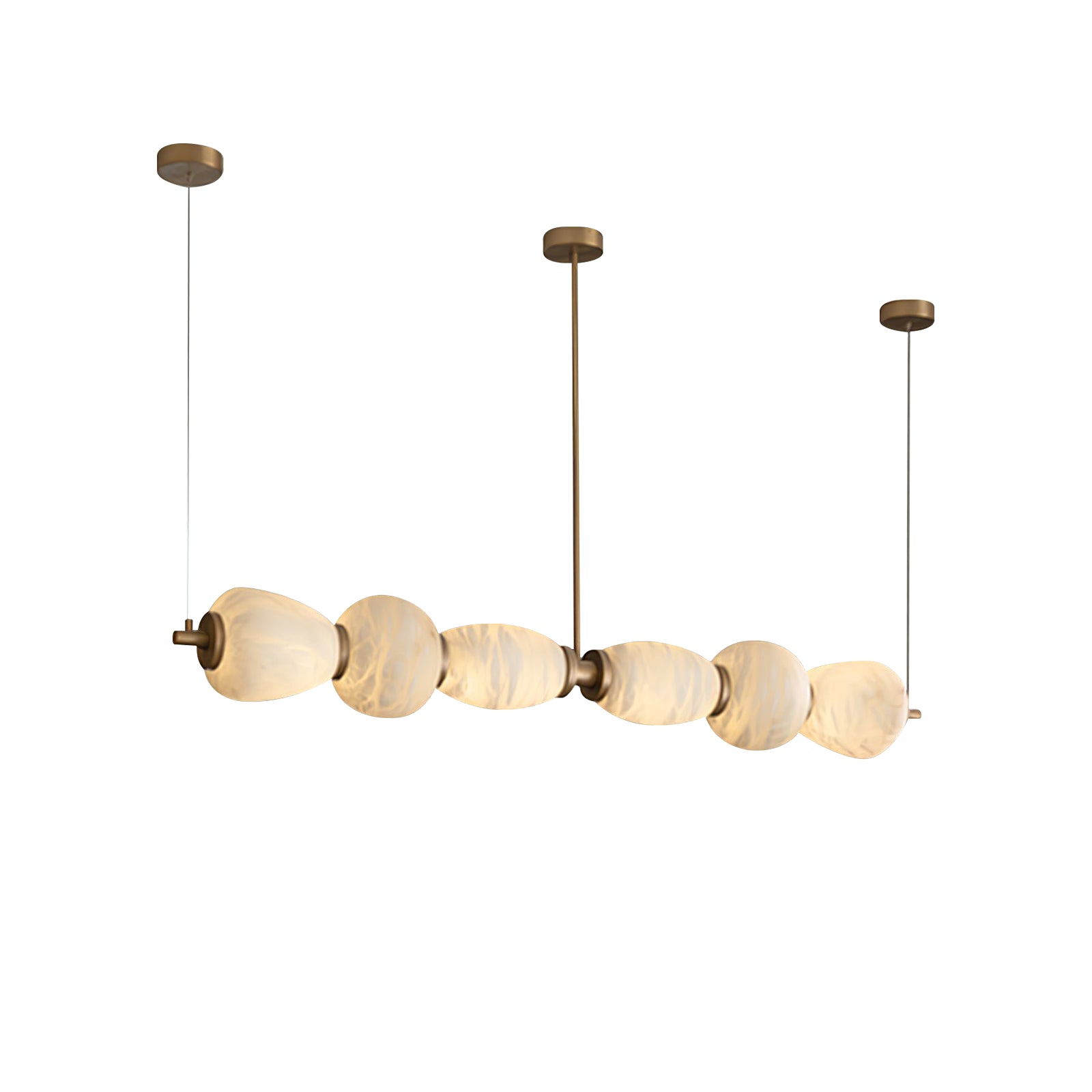 The Alabaster Pebble Linear Chandelier is a fusion of organic natural forms and modern industrial design, bringing a tranquil, river-like ambiance to your interior space. With its linear arrangement, it's an ideal choice for dining tables, kitchen islands, or large art installations.
