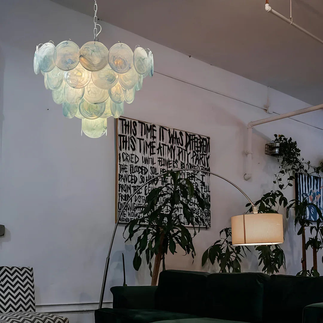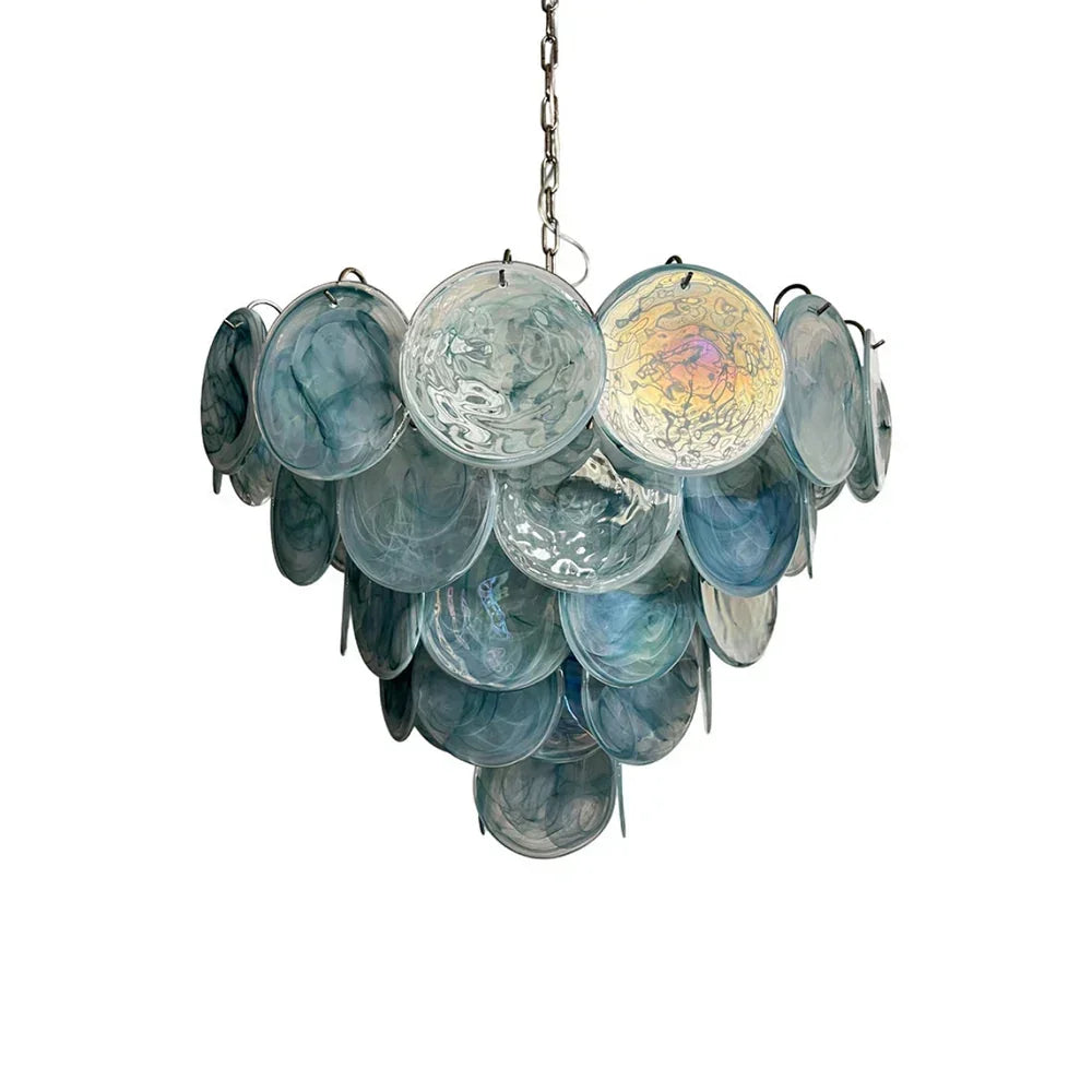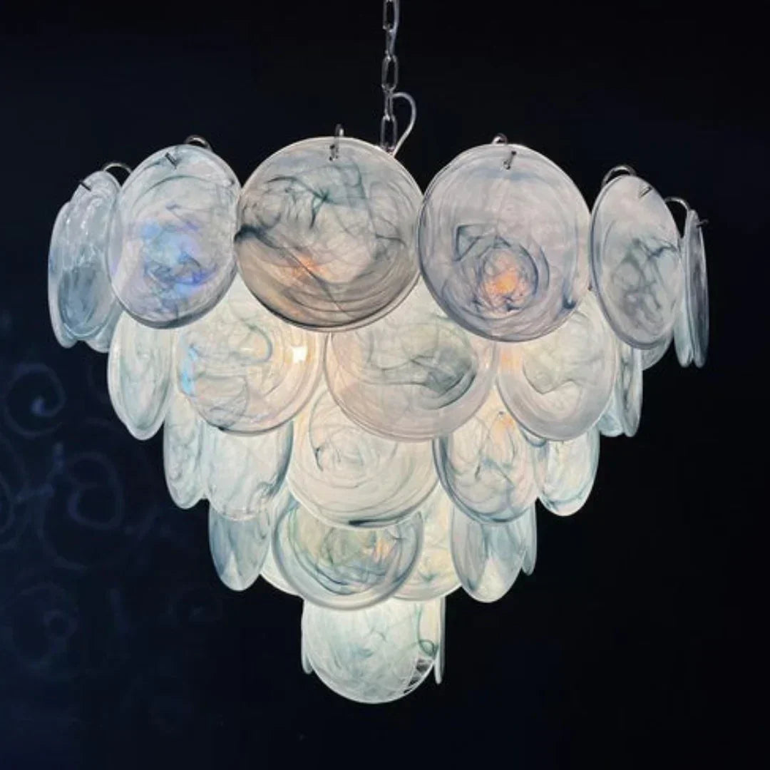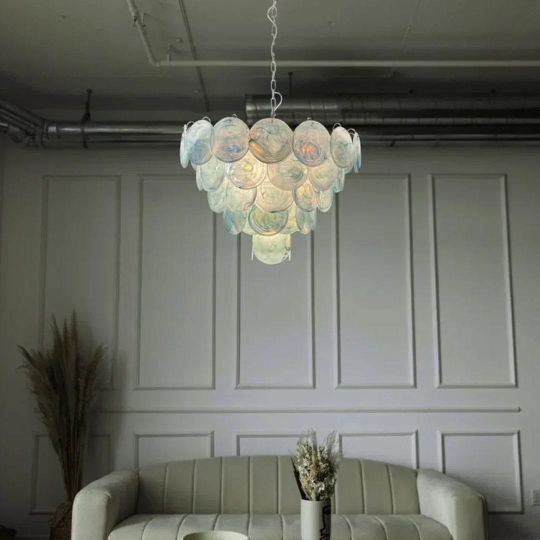This Blue Disk Glass Round Chandelier, composed of glass discs, transforms any space into a play of light and shadow. Each disc captures and reflects different colors, creating a constantly changing visual feast that adds brilliance to your interior design. For those who appreciate exquisite craftsmanship and timeless elegance, this is undoubtedly a striking work of art.