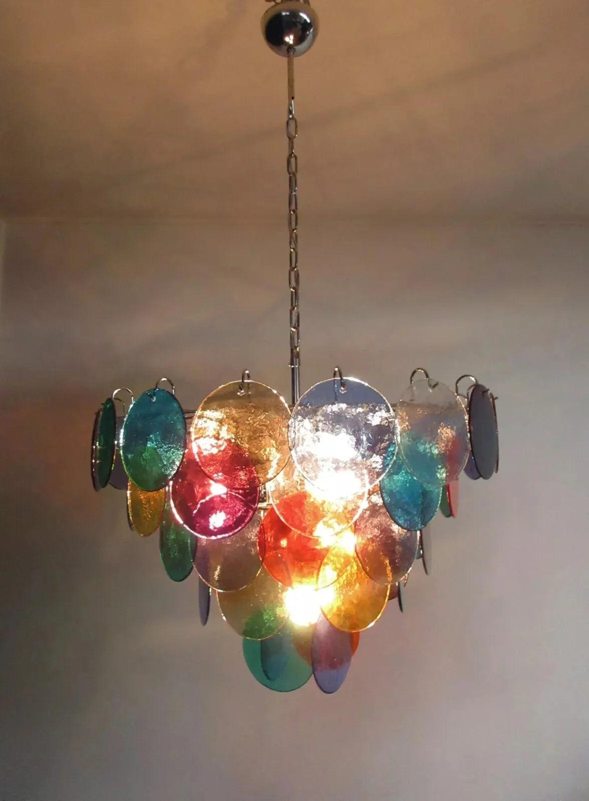 This stunning Colorful Disk Glass Round Chandelier boasts multicolored glass disks handcrafted, creating a truly unique and mesmerizing piece. The finish adds a touch of vintage charm, while the intricate design reflects a gorgeous array of colors. This chandelier is a true masterpiece.