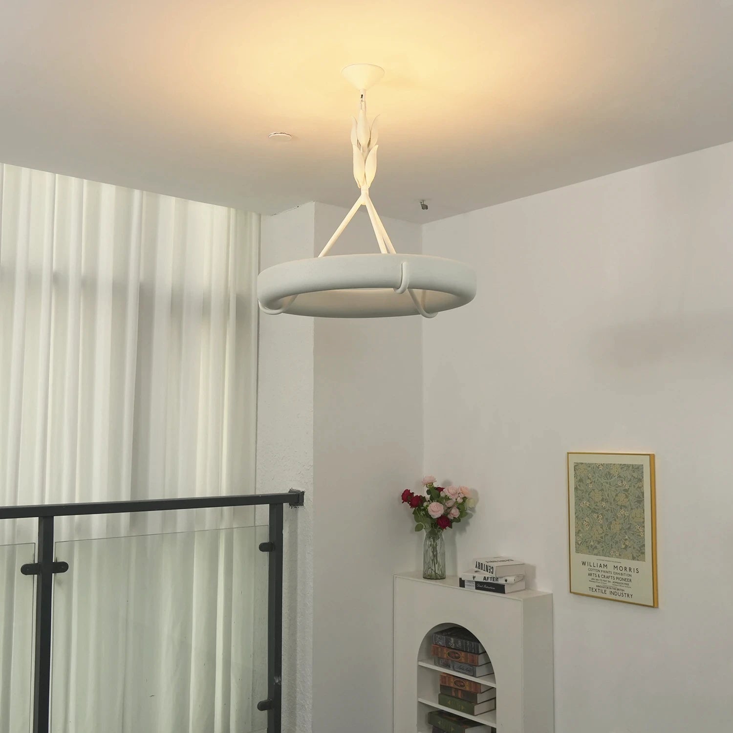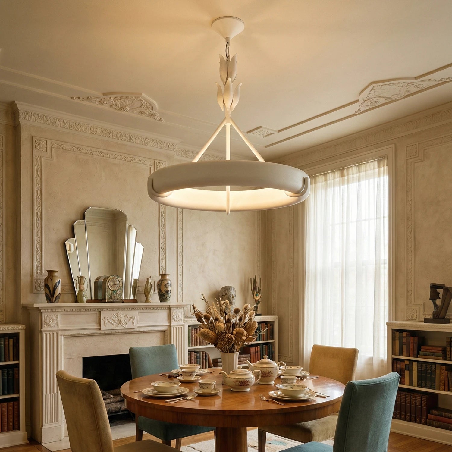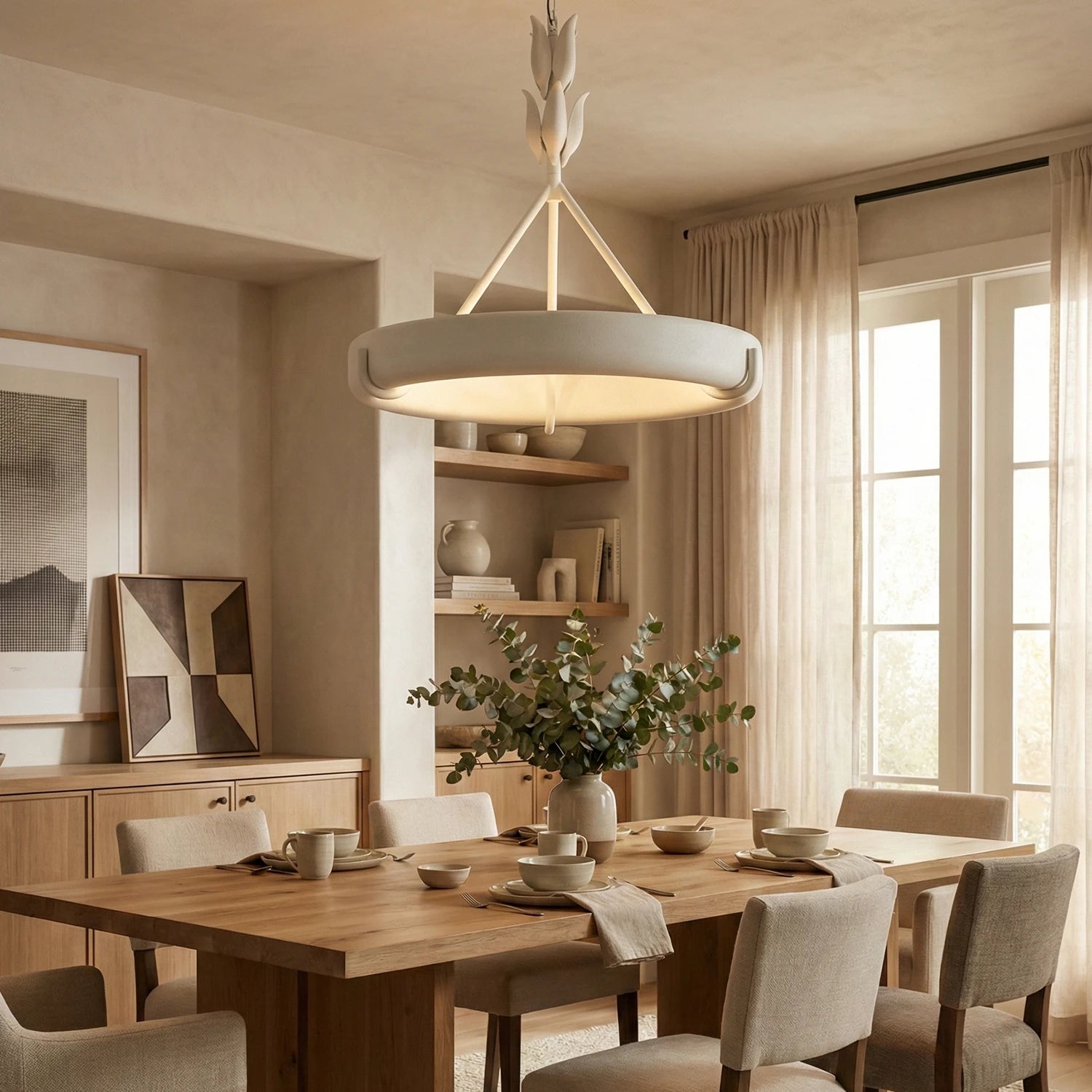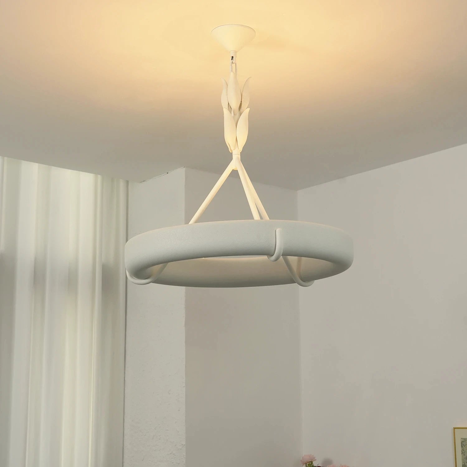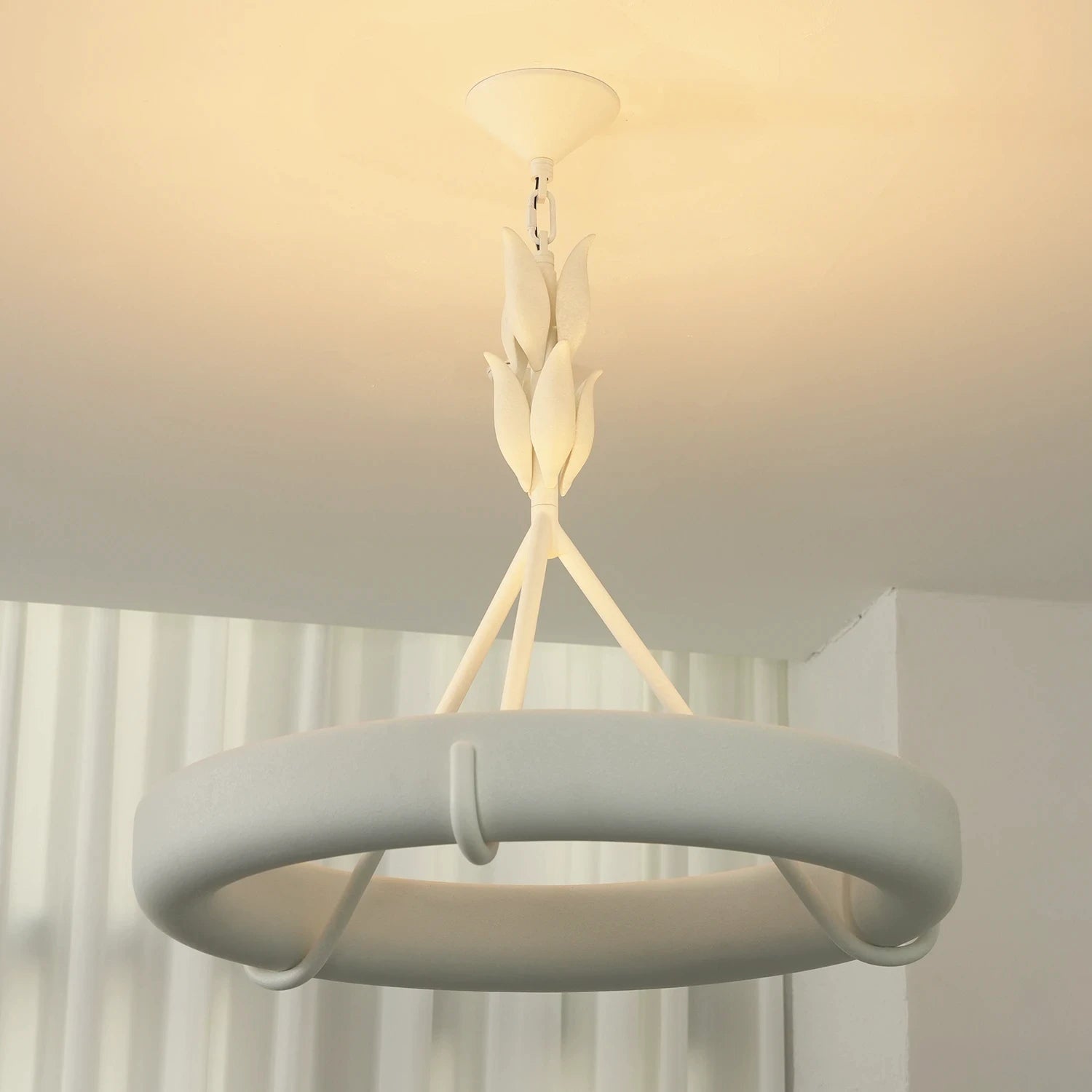 The Elodie Plaster Petal Ring Chandelier is a high-end masterpiece that perfectly blends the purity of architectural structure with the delicate artistry of handcrafted design. It is not merely a lighting fixture, but a large-scale plaster sculpture within the space. Whether suspended in a living room, an artistic dining room, or a minimalist bedroom, its extraordinary sense of proportion elevates the overall interior design.