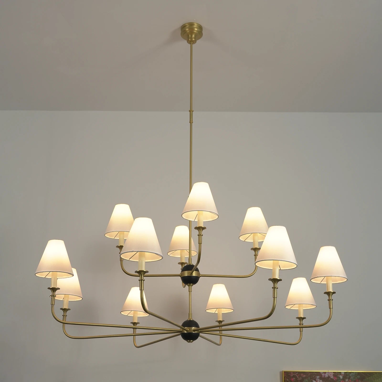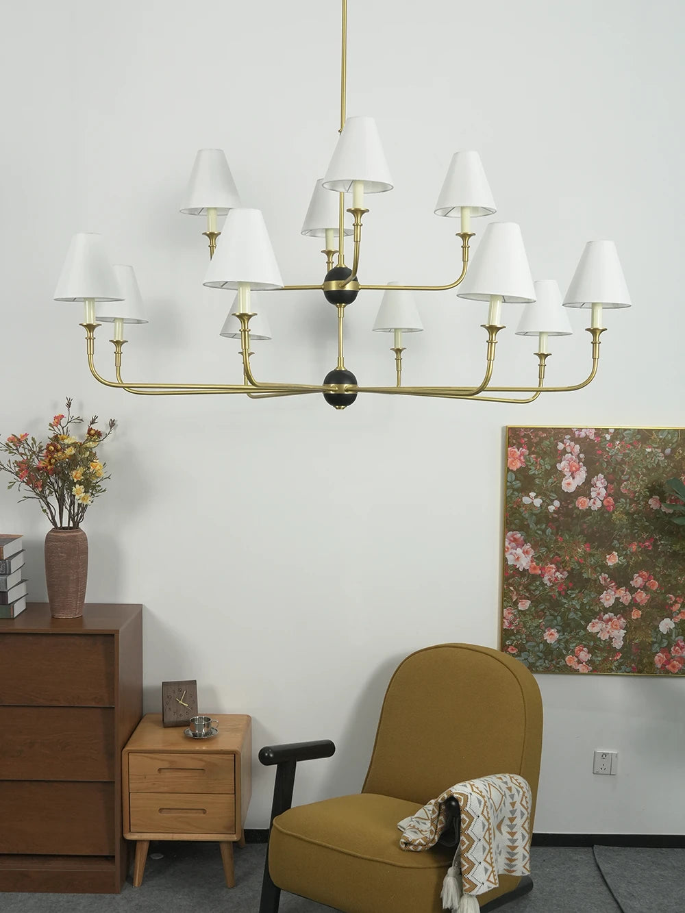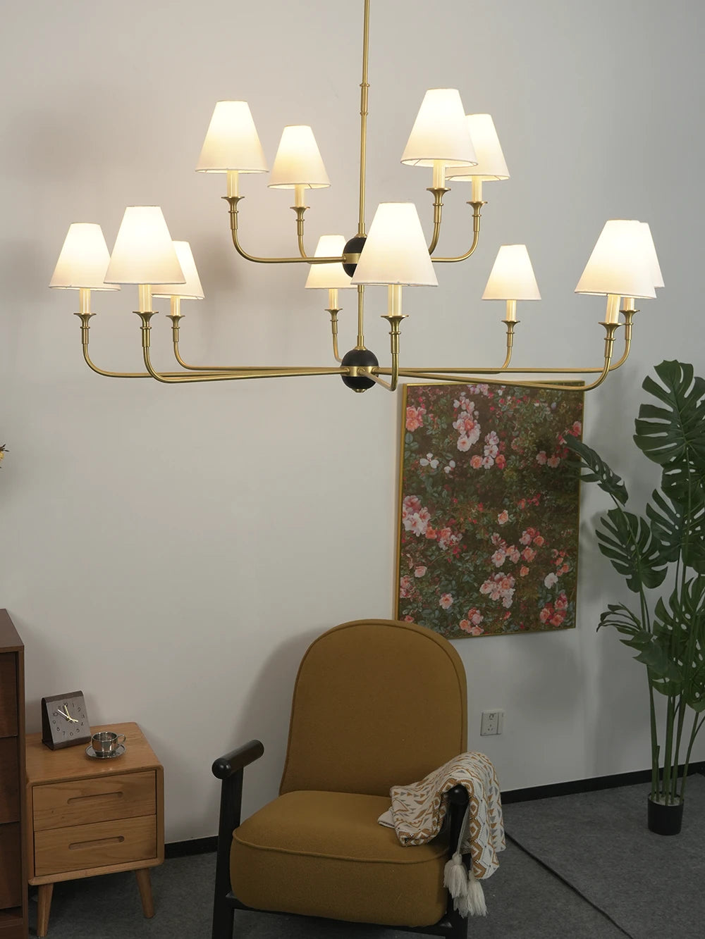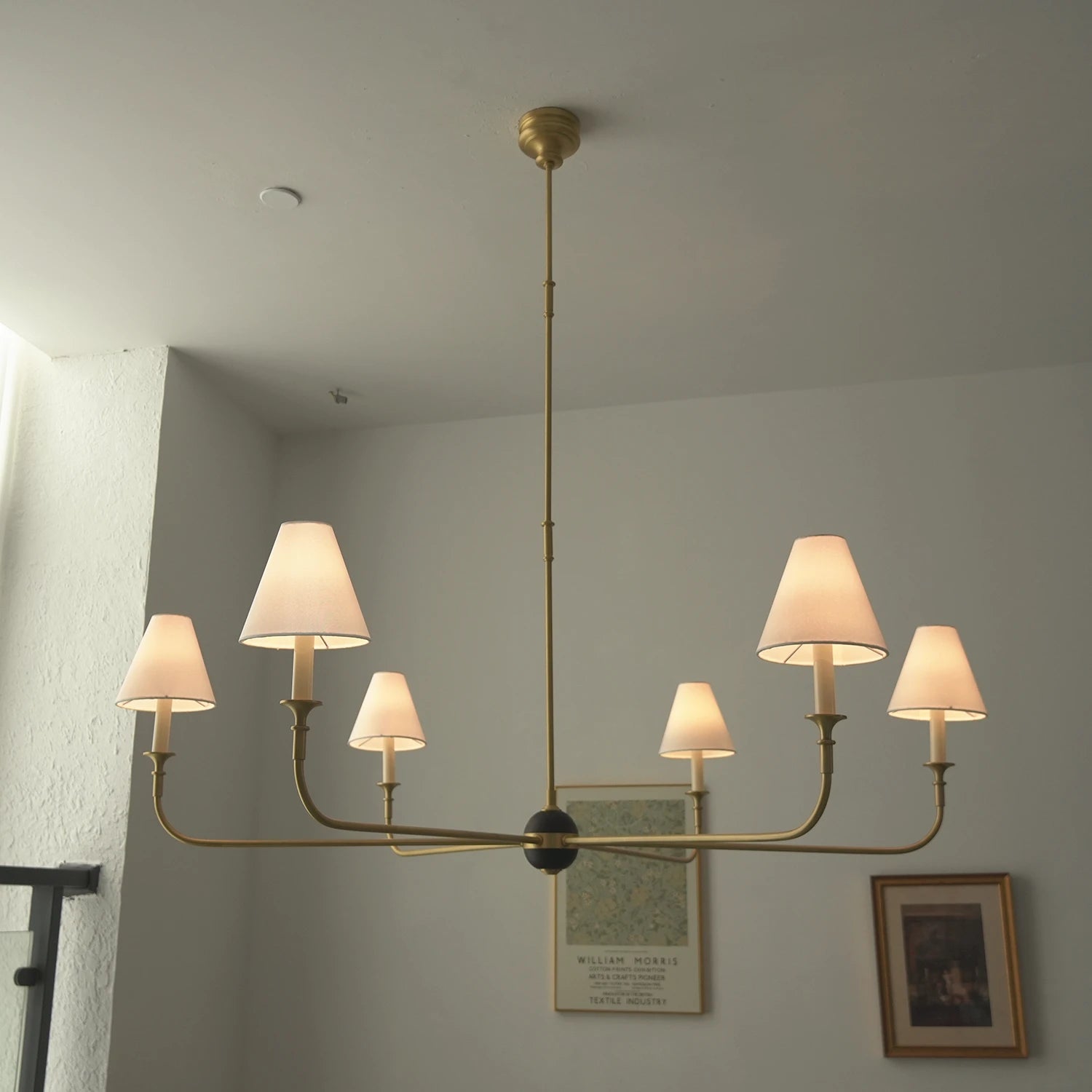 The slender, extended suspension arms complement the elegant candlestick-shaped design, achieving a perfect balance of classic charm and contemporary simplicity. The conical fabric lampshades create a captivating contrast with the sturdy brass frame. It is not merely a lighting fixture, but a profound interpretation of classic aesthetics and modern high-quality living.