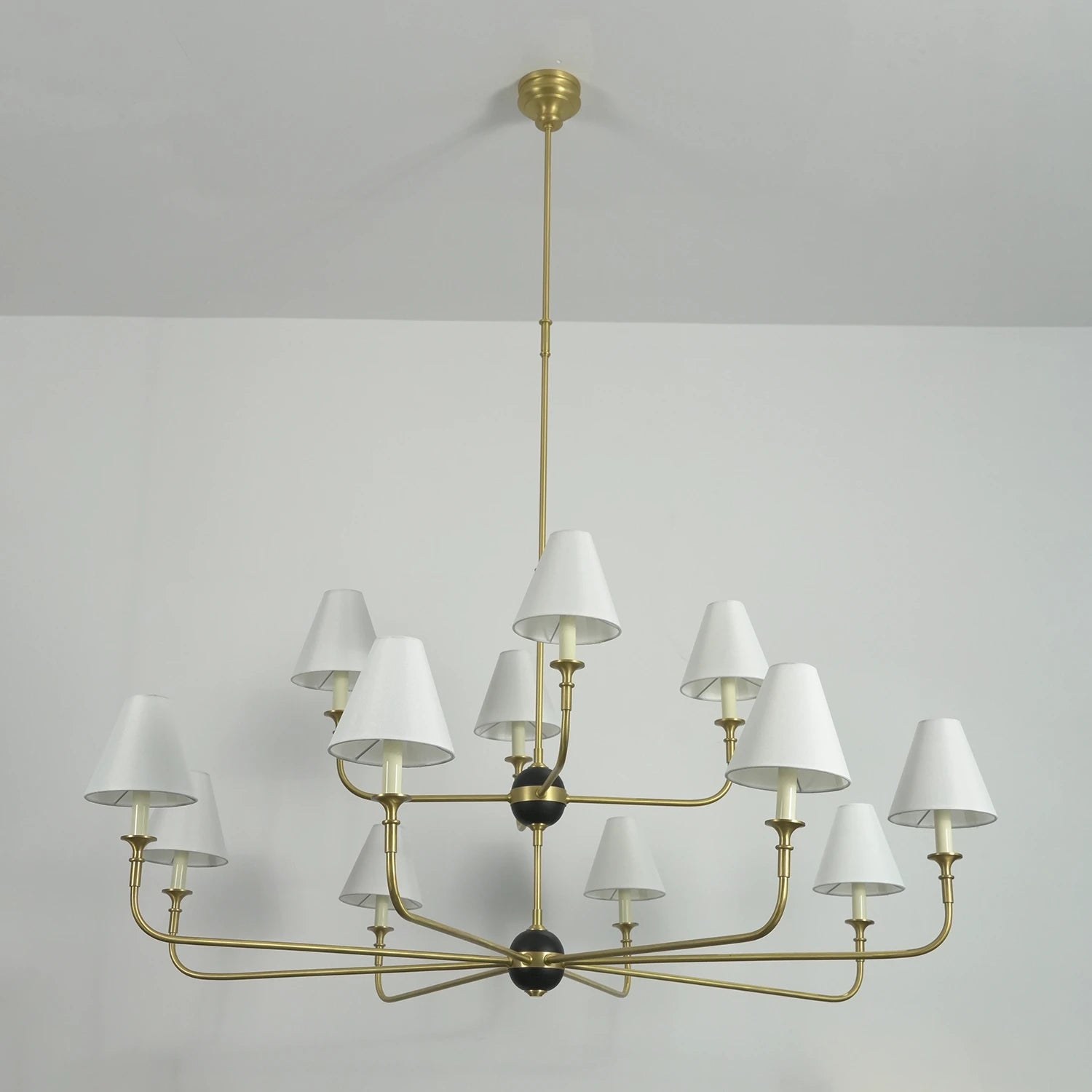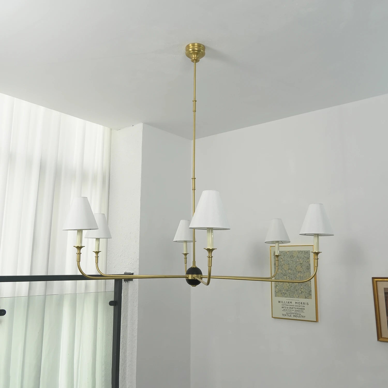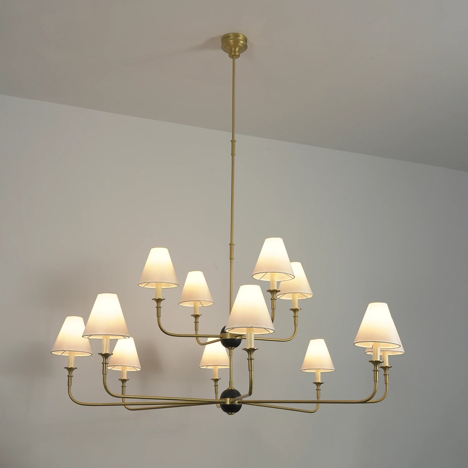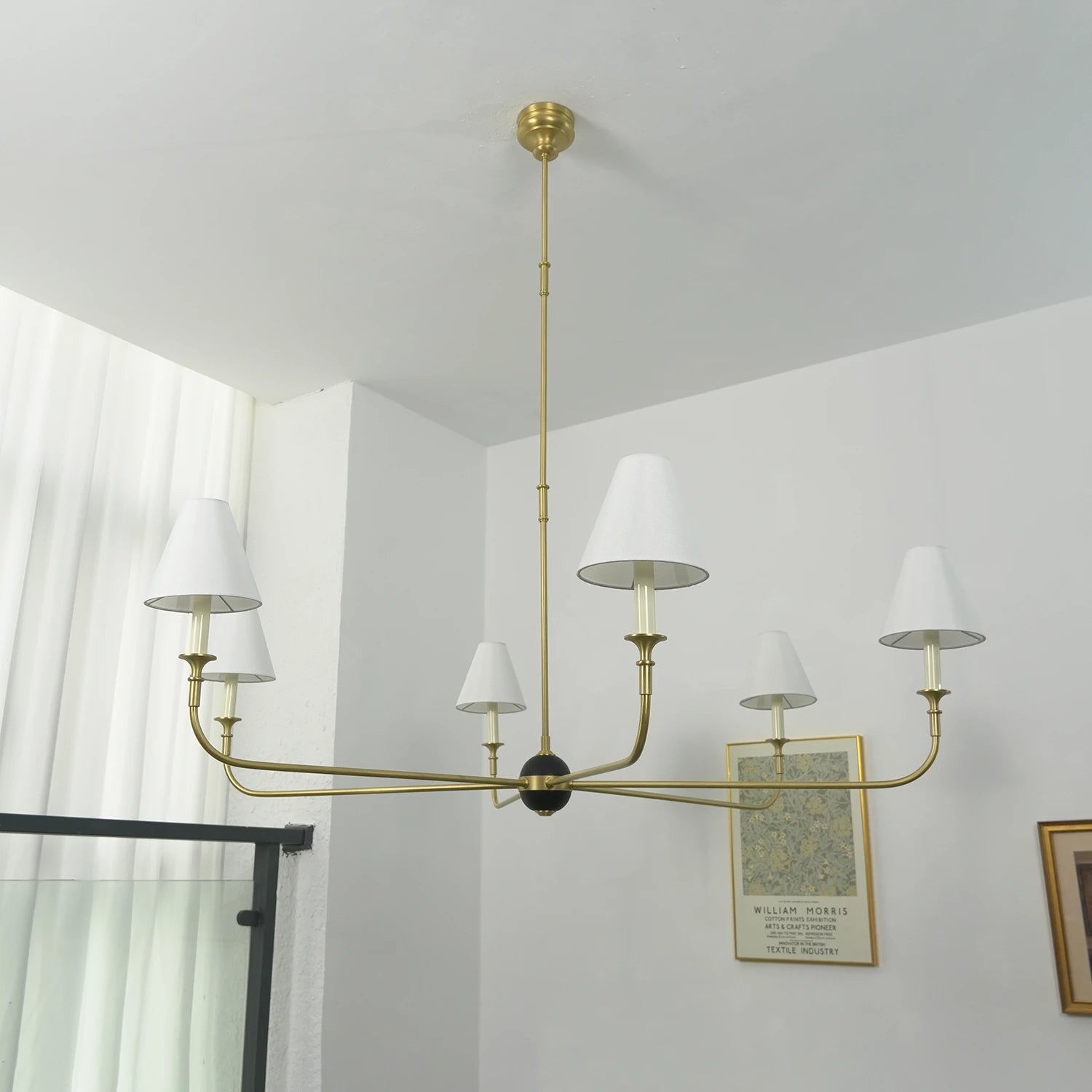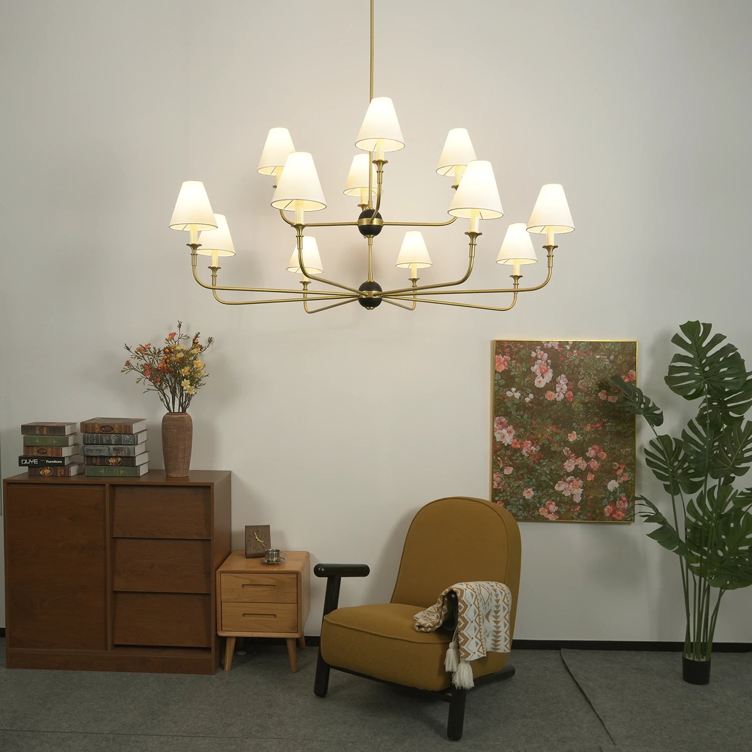 The slender, extended suspension arms complement the elegant candlestick-shaped design, achieving a perfect balance of classic charm and contemporary simplicity. The conical fabric lampshades create a captivating contrast with the sturdy brass frame. It is not merely a lighting fixture, but a profound interpretation of classic aesthetics and modern high-quality living.