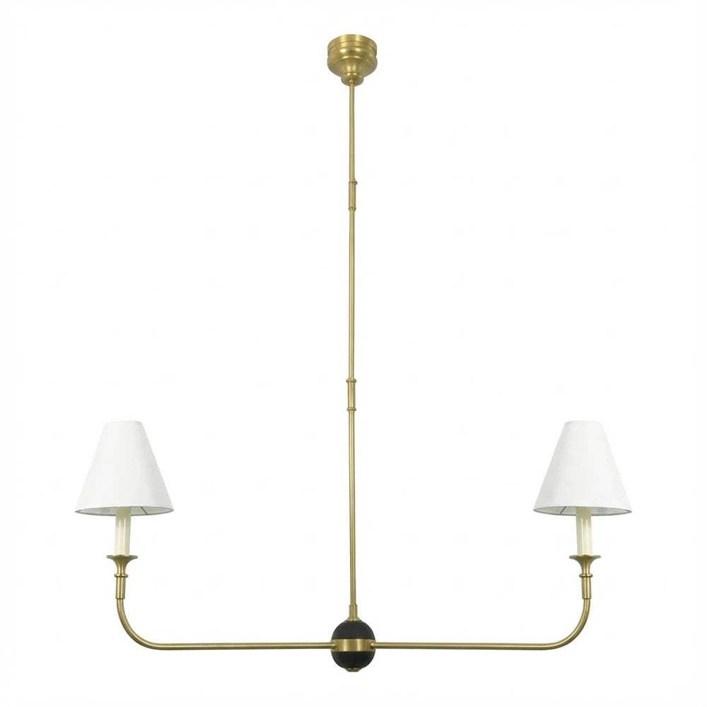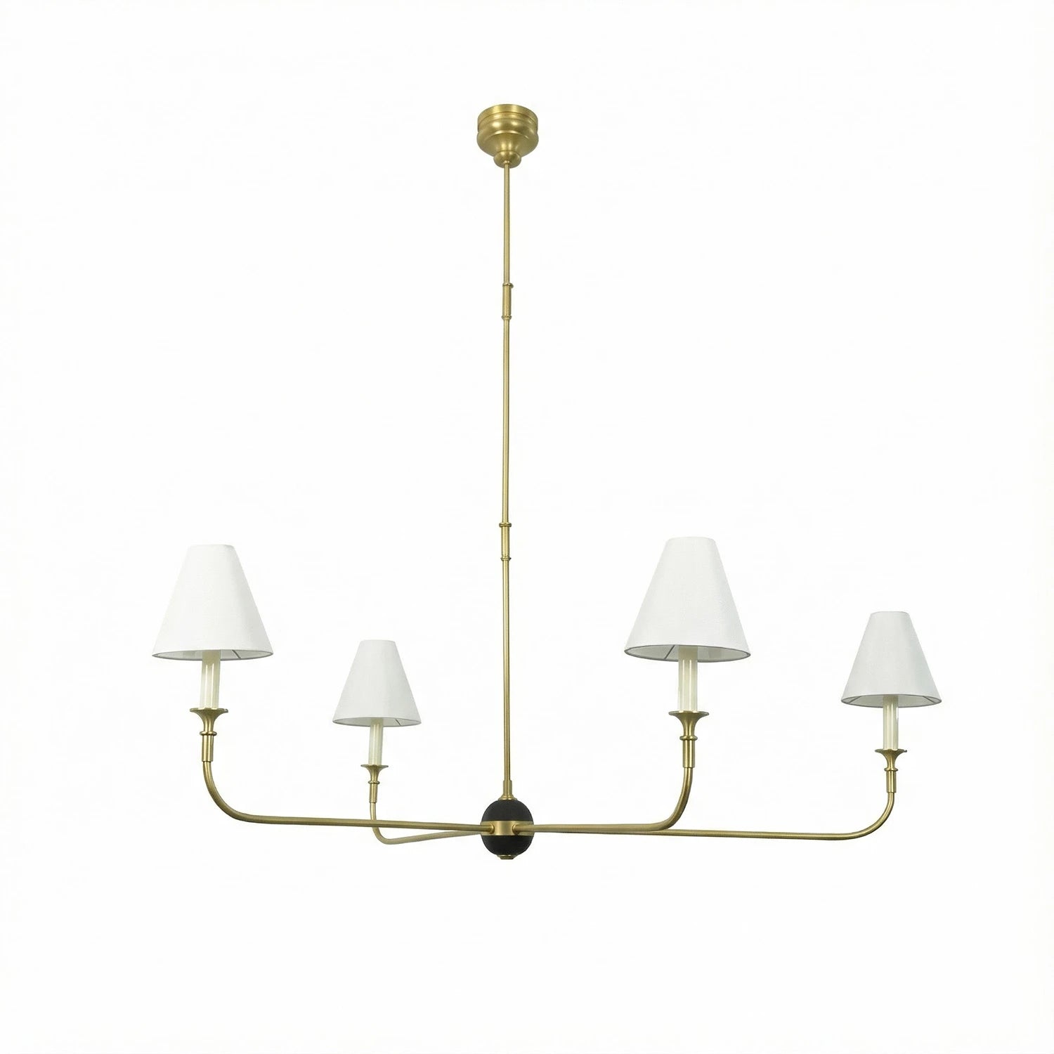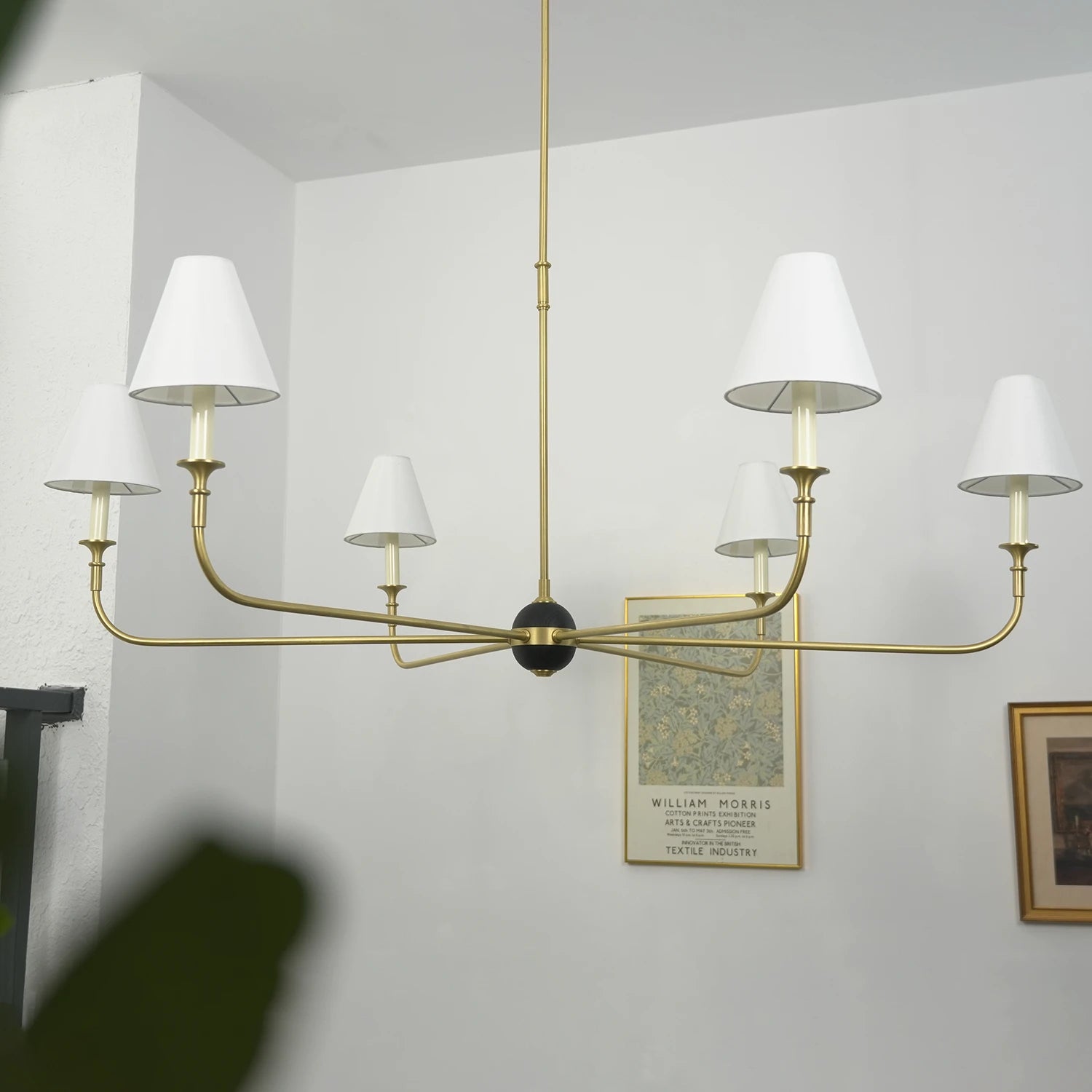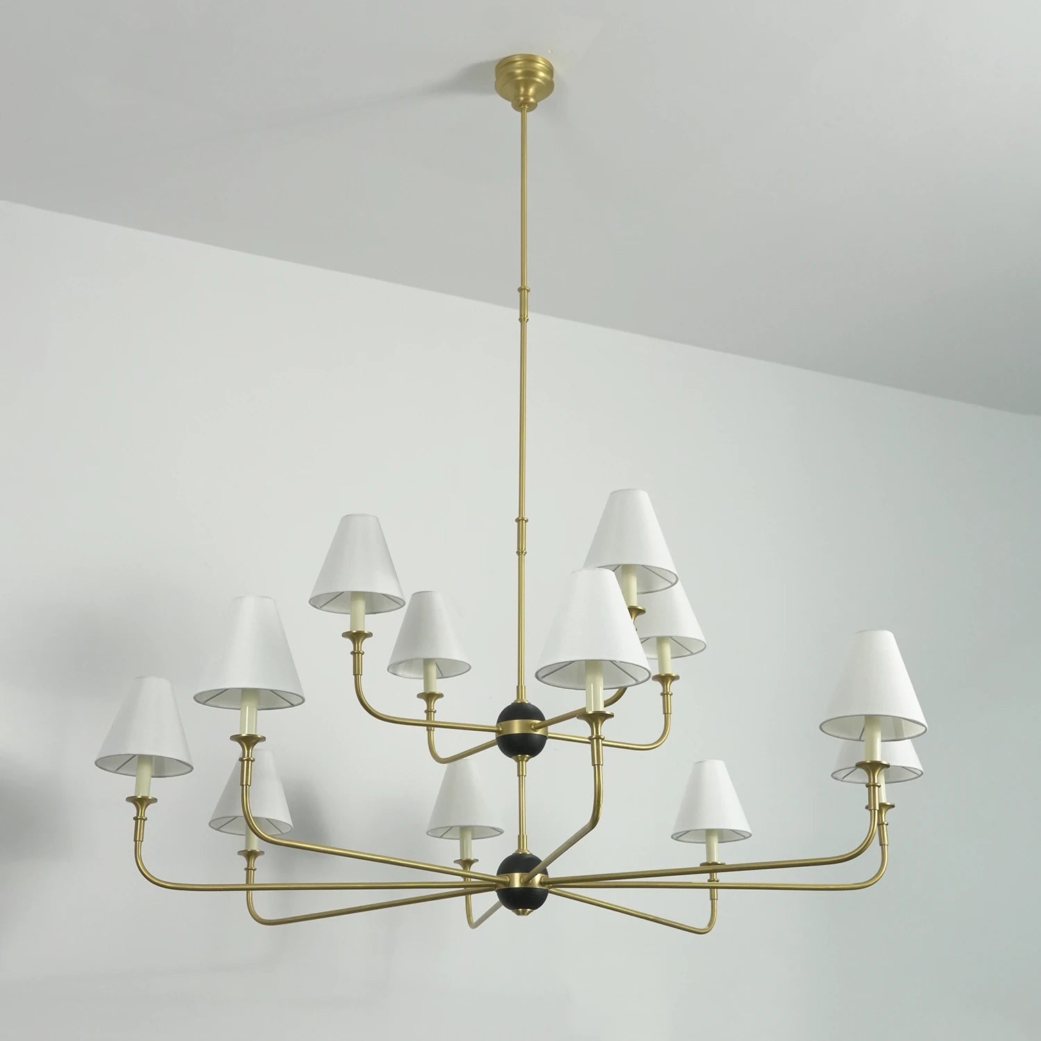 The slender, extended suspension arms complement the elegant candlestick-shaped design, achieving a perfect balance of classic charm and contemporary simplicity. The conical fabric lampshades create a captivating contrast with the sturdy brass frame. It is not merely a lighting fixture, but a profound interpretation of classic aesthetics and modern high-quality living.