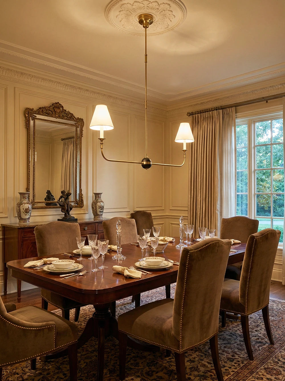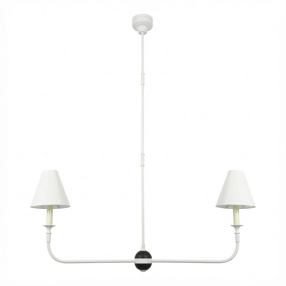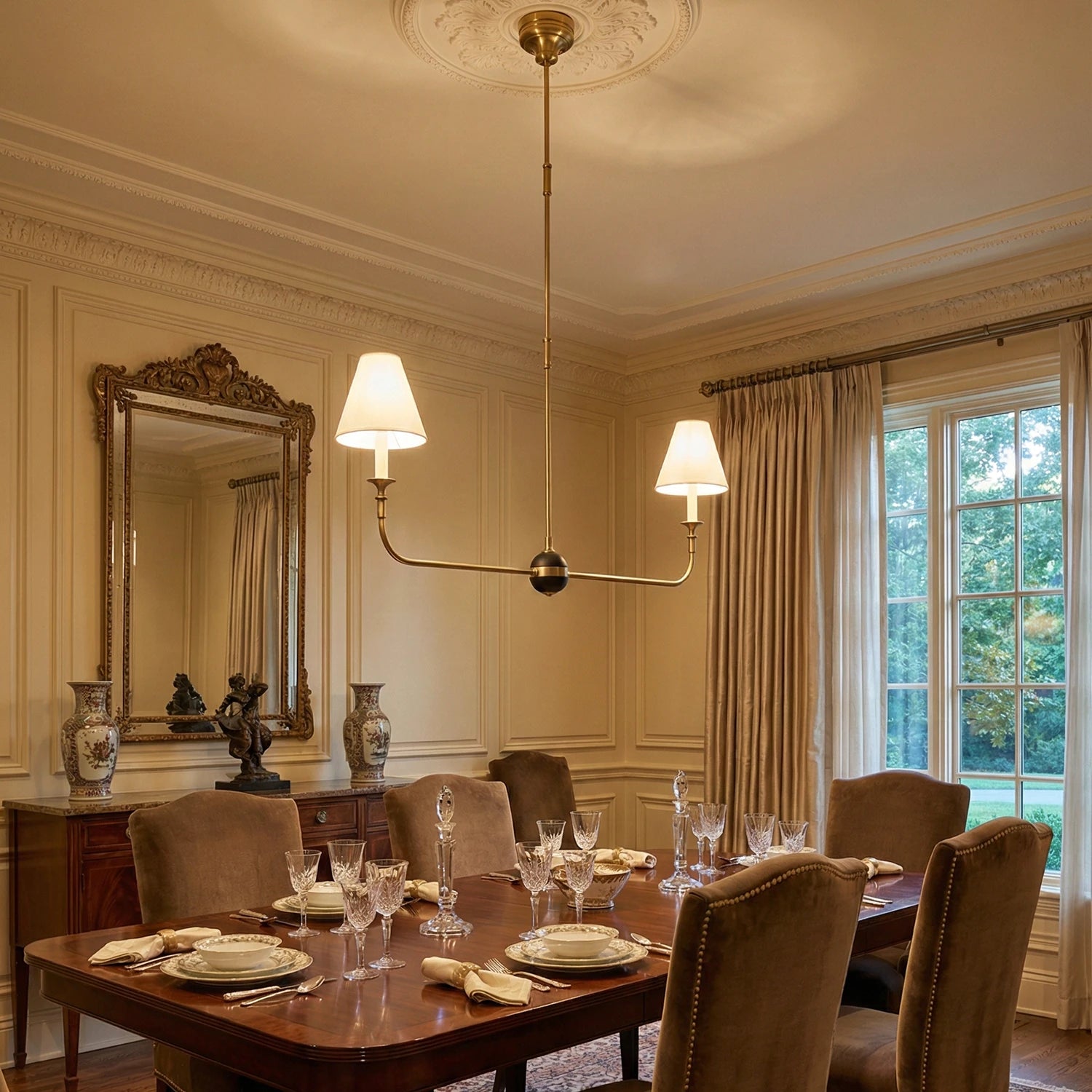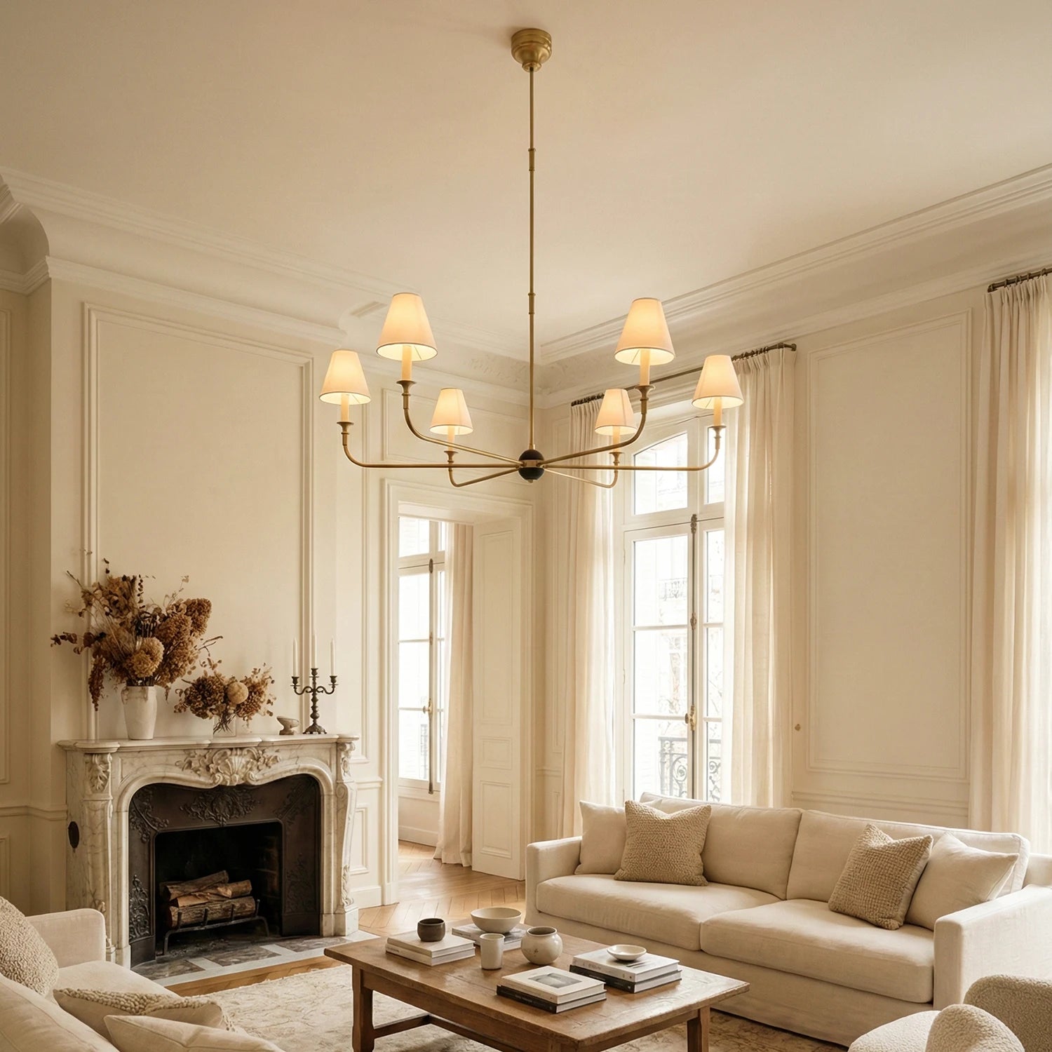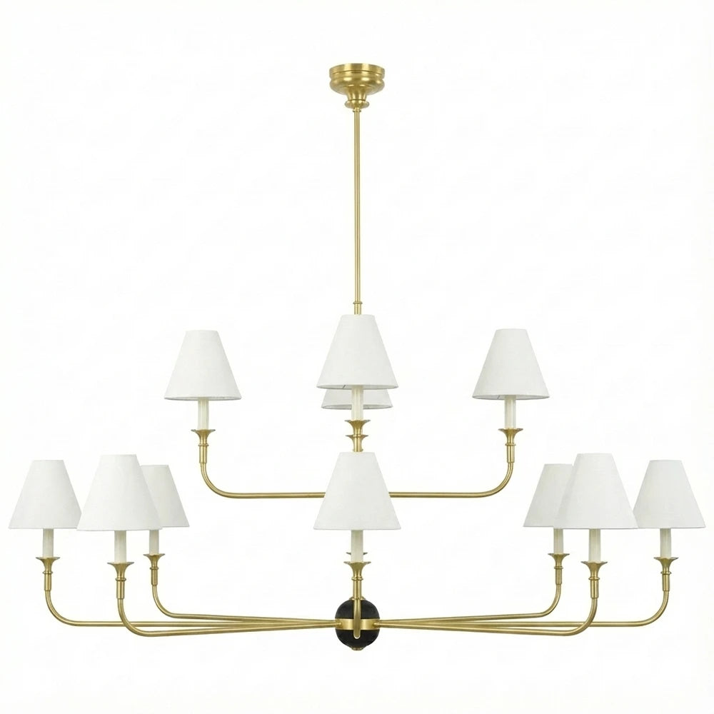 The slender, extended suspension arms complement the elegant candlestick-shaped design, achieving a perfect balance of classic charm and contemporary simplicity. The conical fabric lampshades create a captivating contrast with the sturdy brass frame. It is not merely a lighting fixture, but a profound interpretation of classic aesthetics and modern high-quality living.