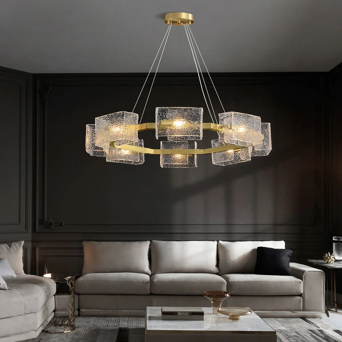 Water ripple Glass? Chandelier brings a chic, modern style to your living room, bedroom, or kitchen. while adding elegance to the interior decoration. Its finish is made of high-quality brass and creative round water ripple transparent geometric glass lampshade combination design, creating a luxurious and fashionable feeling. There are 8 small lamps under the transparent glass lampshade, which can project soft light in your whole family space.
