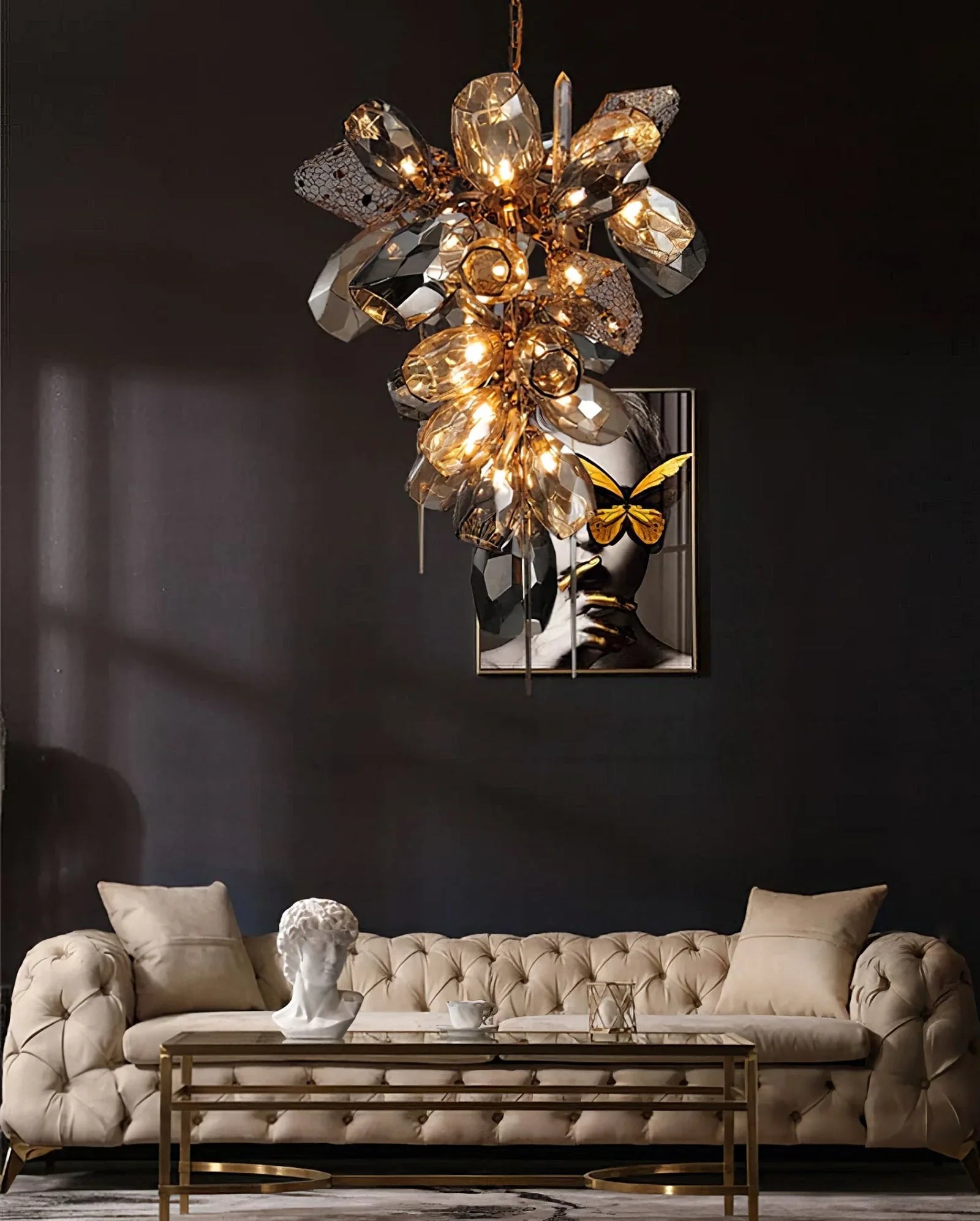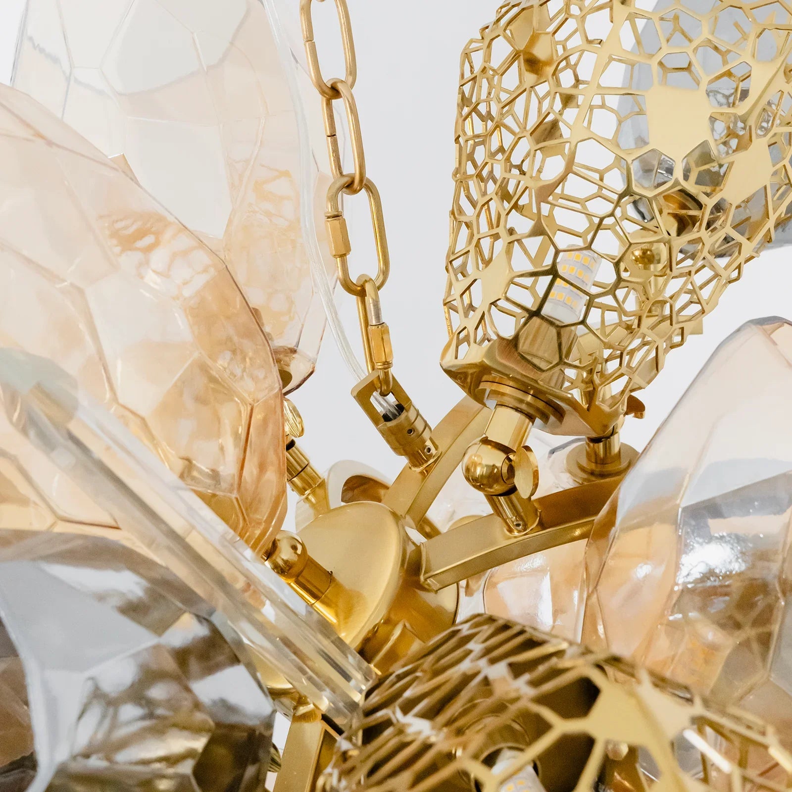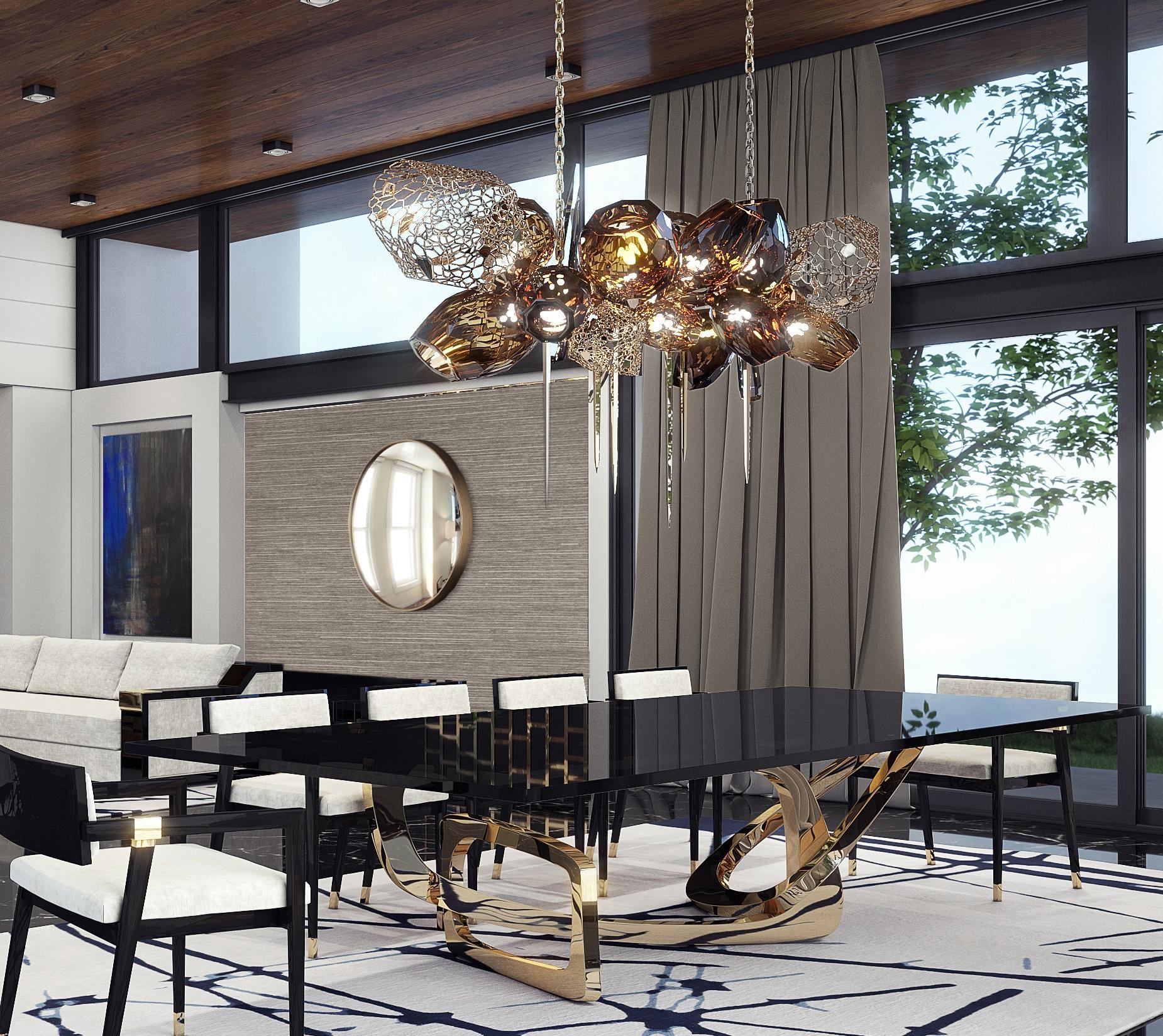 Transferring traditional Murano glassware design and craftsmanship into a contemporary work of art, the Britannica Chandelier offers a modern approach to illumination. It features a myriad of components, including hand-blown faceted Murano glass globes, bronze honeycomb spheres, glass spears, and bronze shards, creating a striking and sculptural lighting statement.