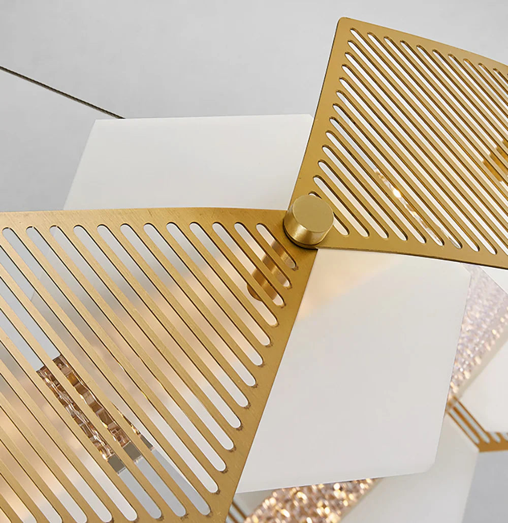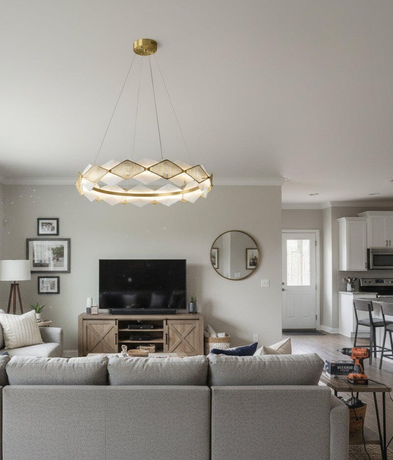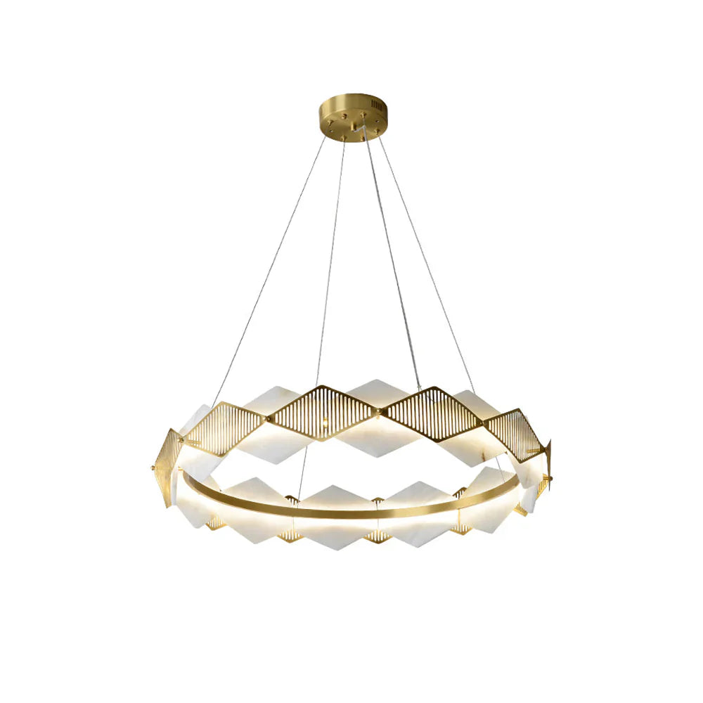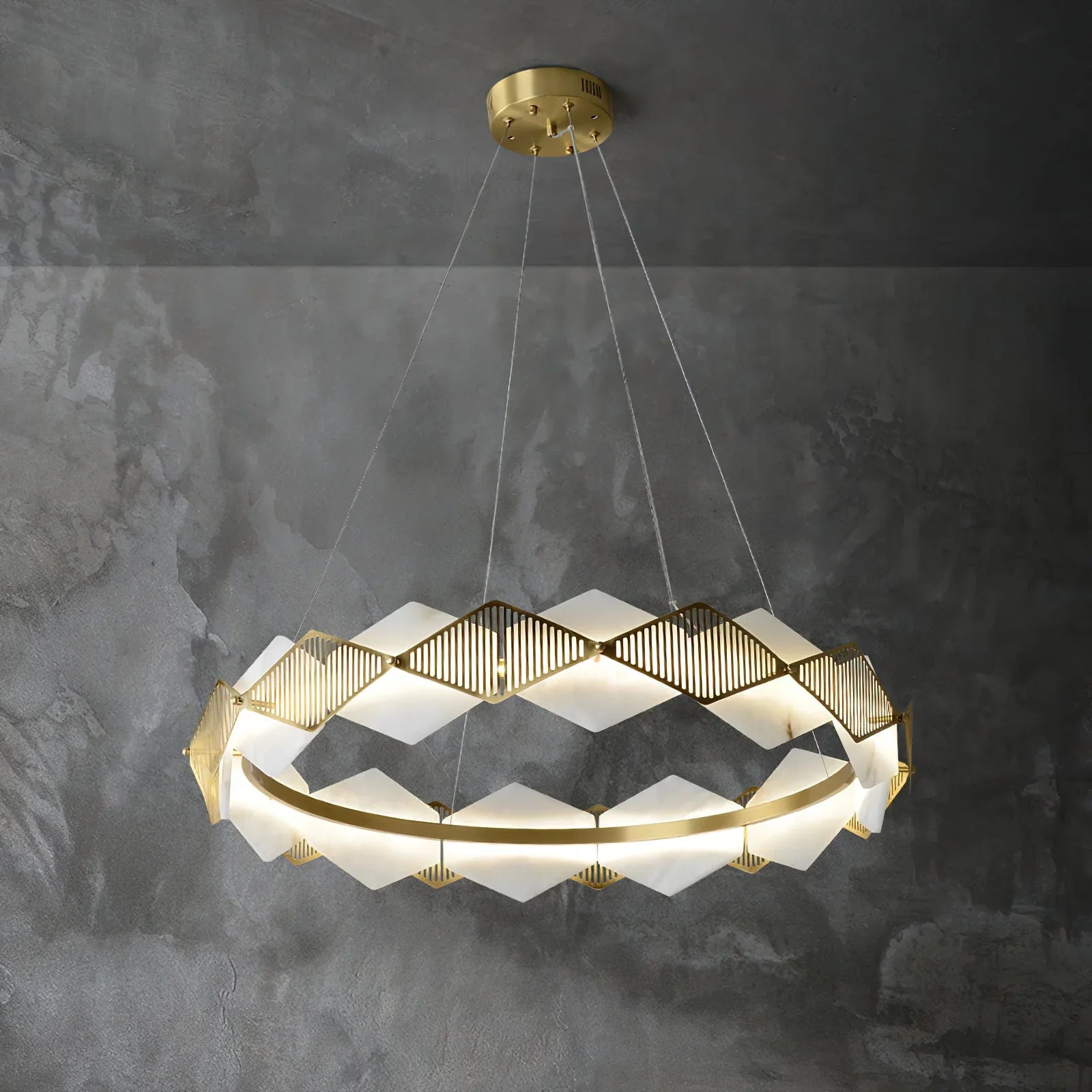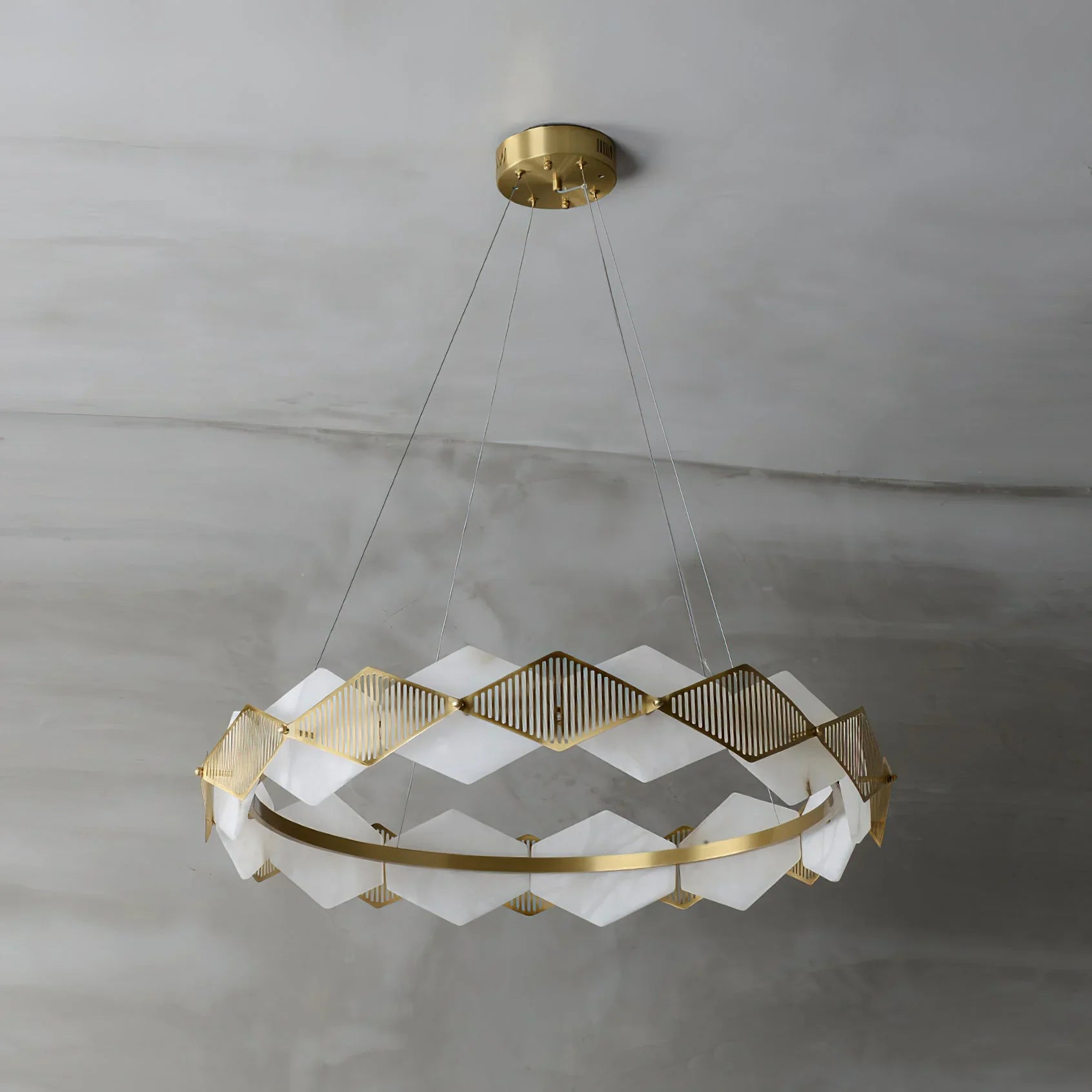 This Circular Rote Alabaster Diamond Chandelier boasts a stunning geometric shade in brass and white plates, creating a mesmerizing silhouette. The dual-sided light ring offers a soothing yet striking centerpiece. Perfect for adding a touch of luxury and ambiance to any room.