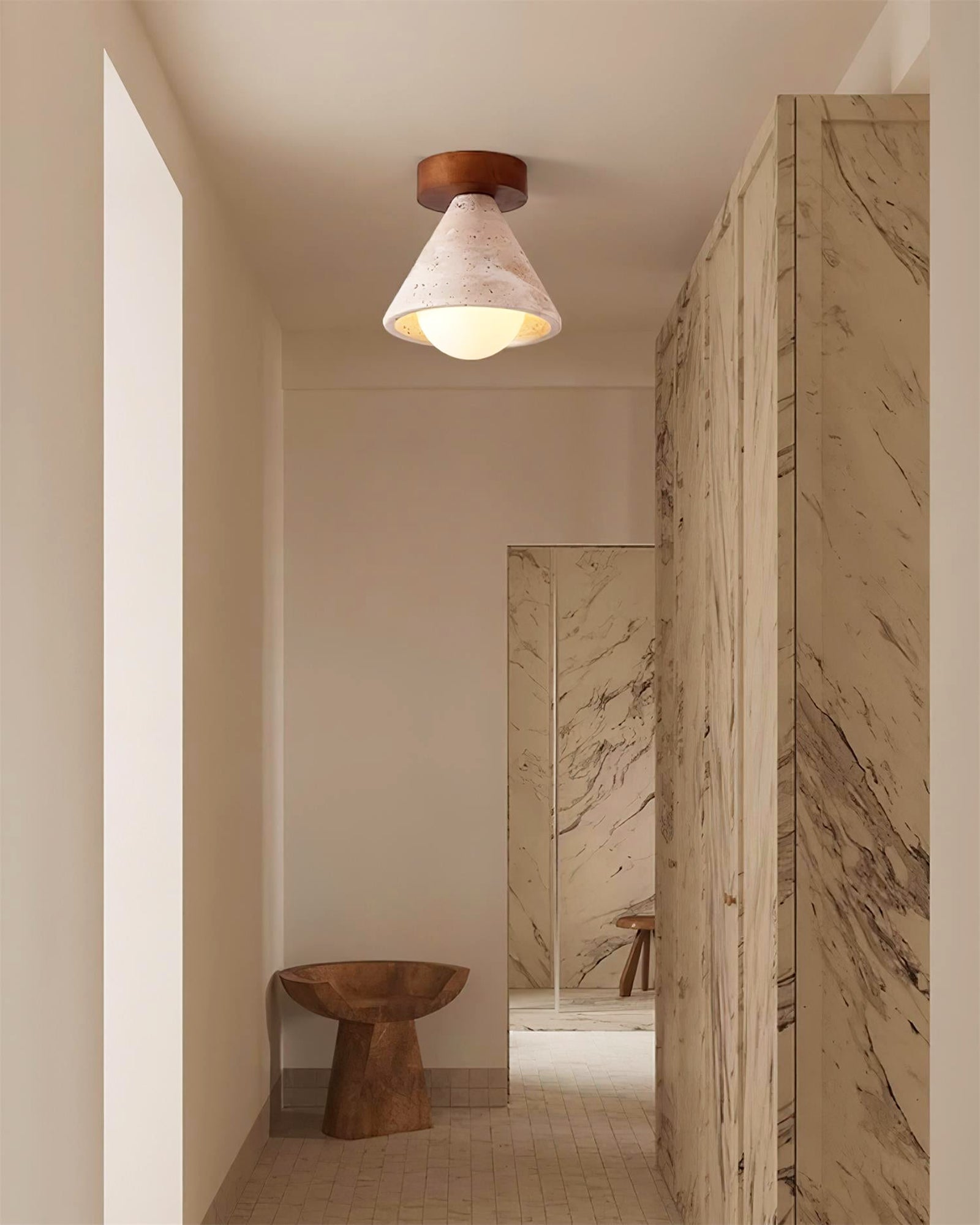 The Kayla ceiling light cleverly blends natural materials with modern design, its tapered travertine shade highlighting its unique texture and natural beauty. A frosted glass diffuser emits a soft glow, creating a warm and inviting atmosphere, while the wooden base adds a touch of refined elegance. This versatile light fixture is ideal for dining rooms, entryways, or living rooms.