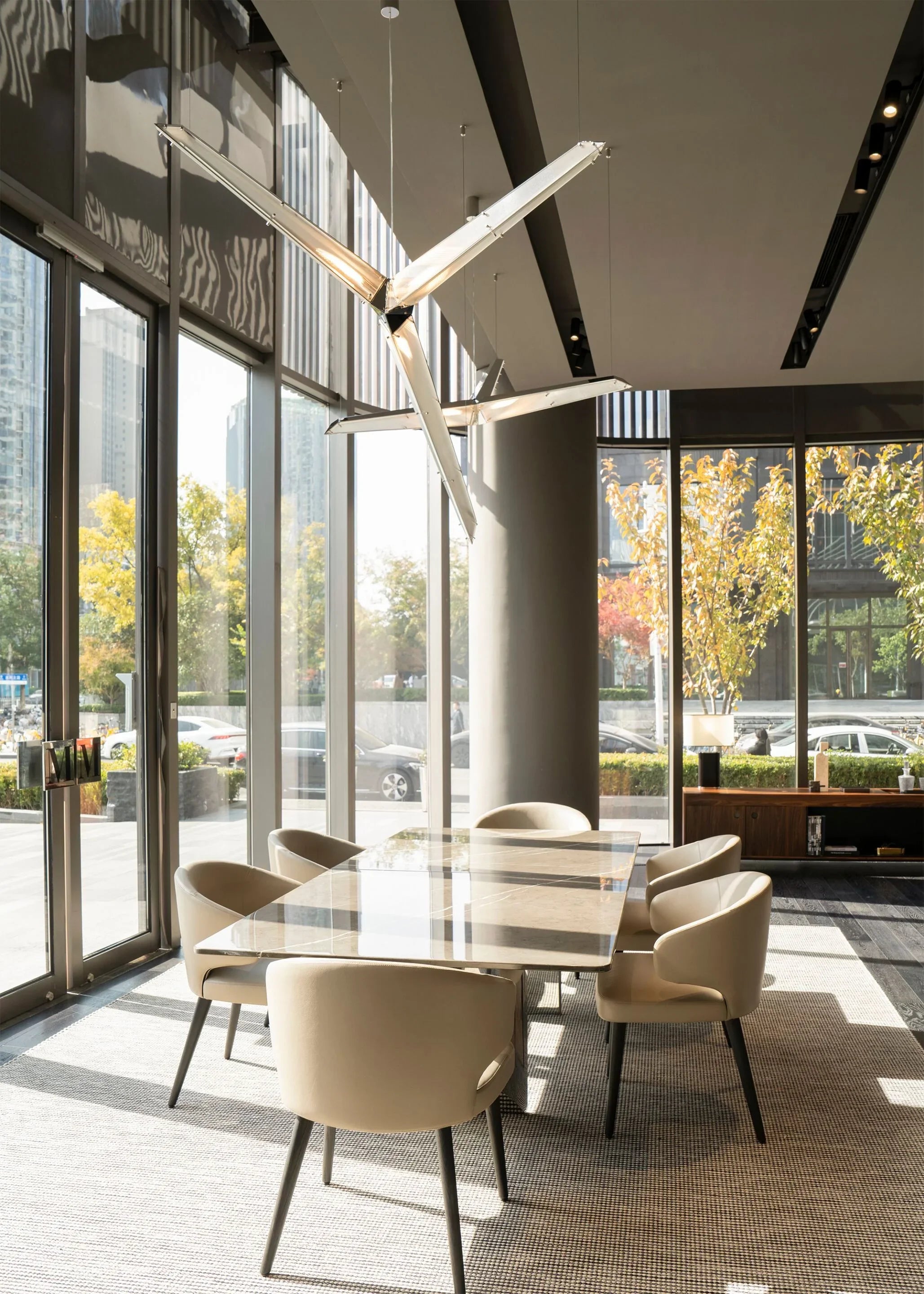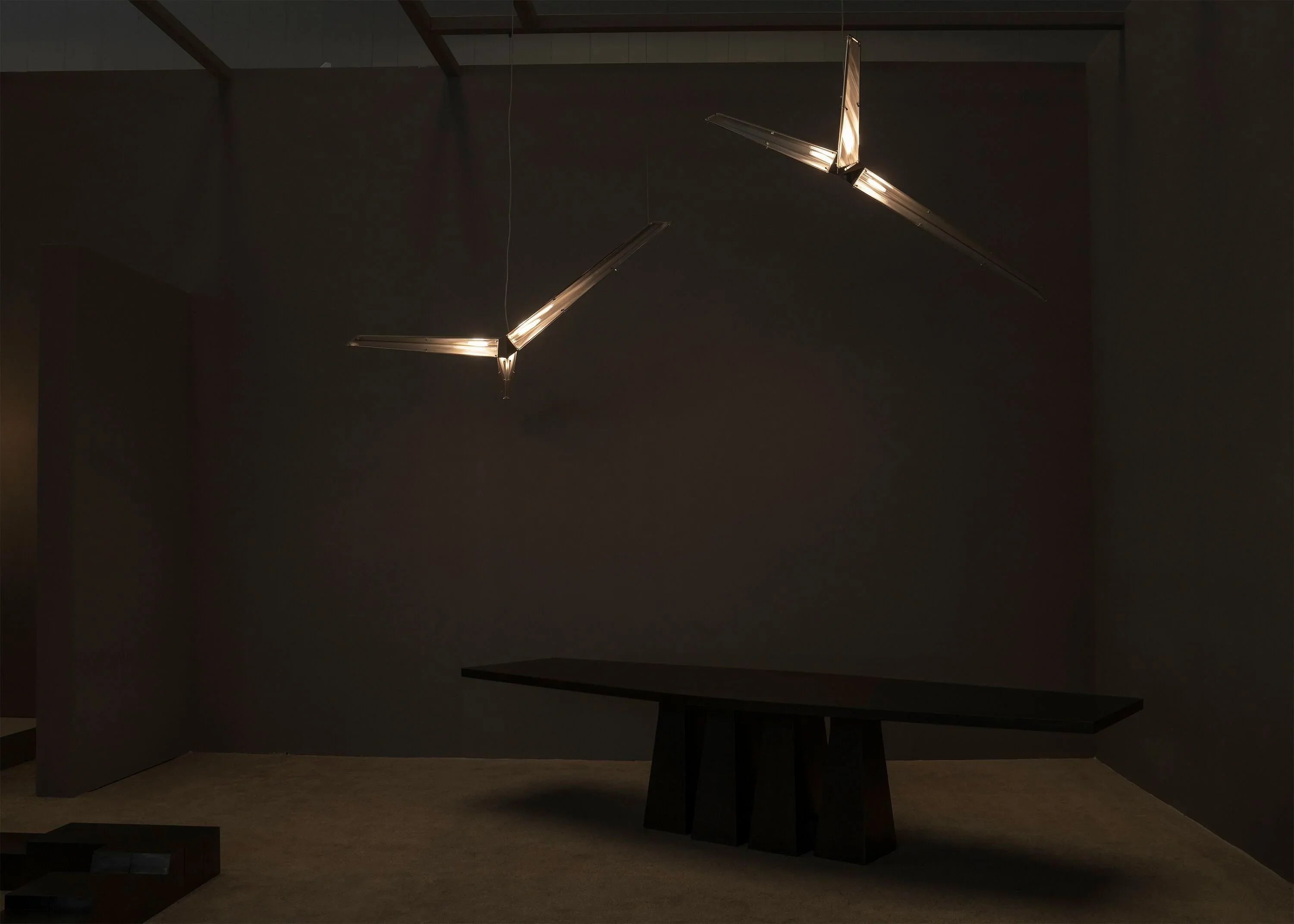 Fragment 10 Pendant Light To explore the balance between the tradition and modern, he fold stainless steel into extremely long cone. through exquisite cutting, acrylic with wavy texture was fixed on the stainless steel frame, deliberately exposing all the components to create a delicate and violent conflict.