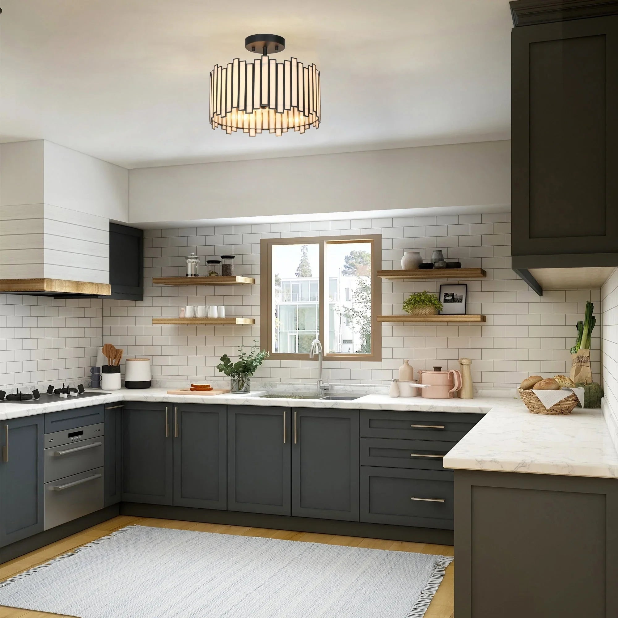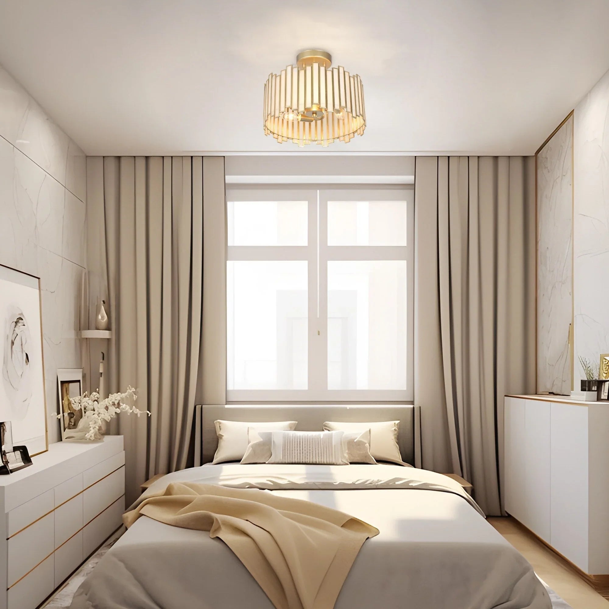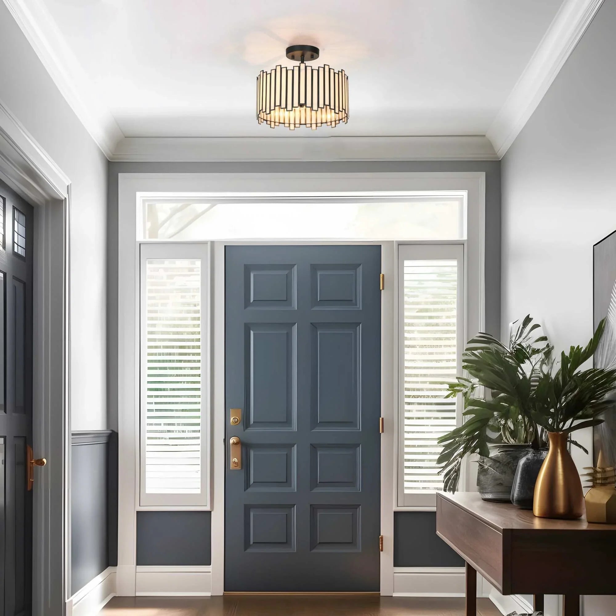 Golden glow fulfilling your indoor spaces as a glamorous art piece, this drum-shaped flush mount shifts the ambiance of your room to a modern and luxurious style. Its distinctive irregular design, coupled with unique glass detailing, imbues your spaces with a heightened sense of sophistication. Crafted of brass, glass, and iron, modern and contemporary flair got the right showcase through its enchanting illumination effects. Whether for the walk-in closet, entryway, hallways, foyer, stairwell, or bedroom, this chandelier is a guaranteed showstopper.