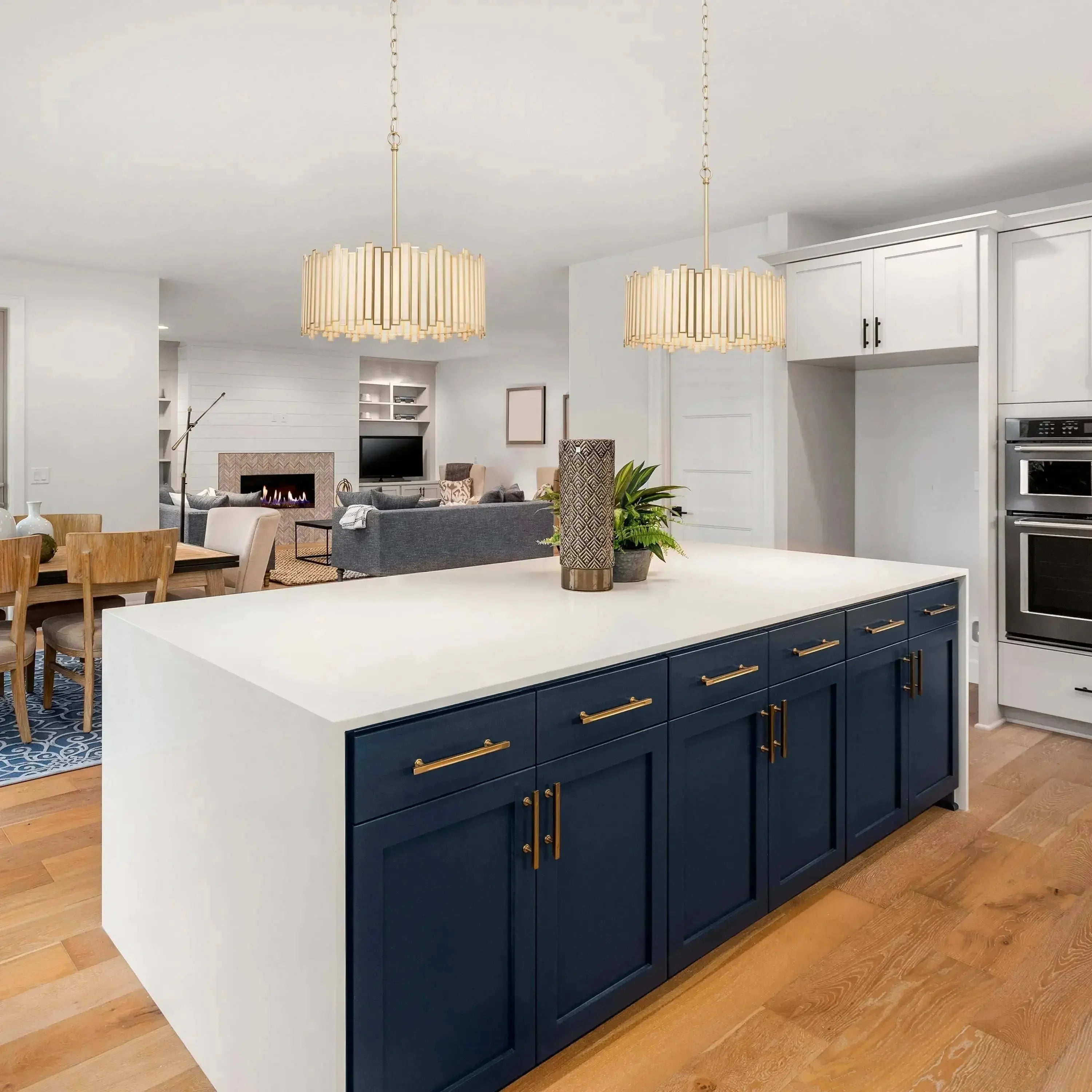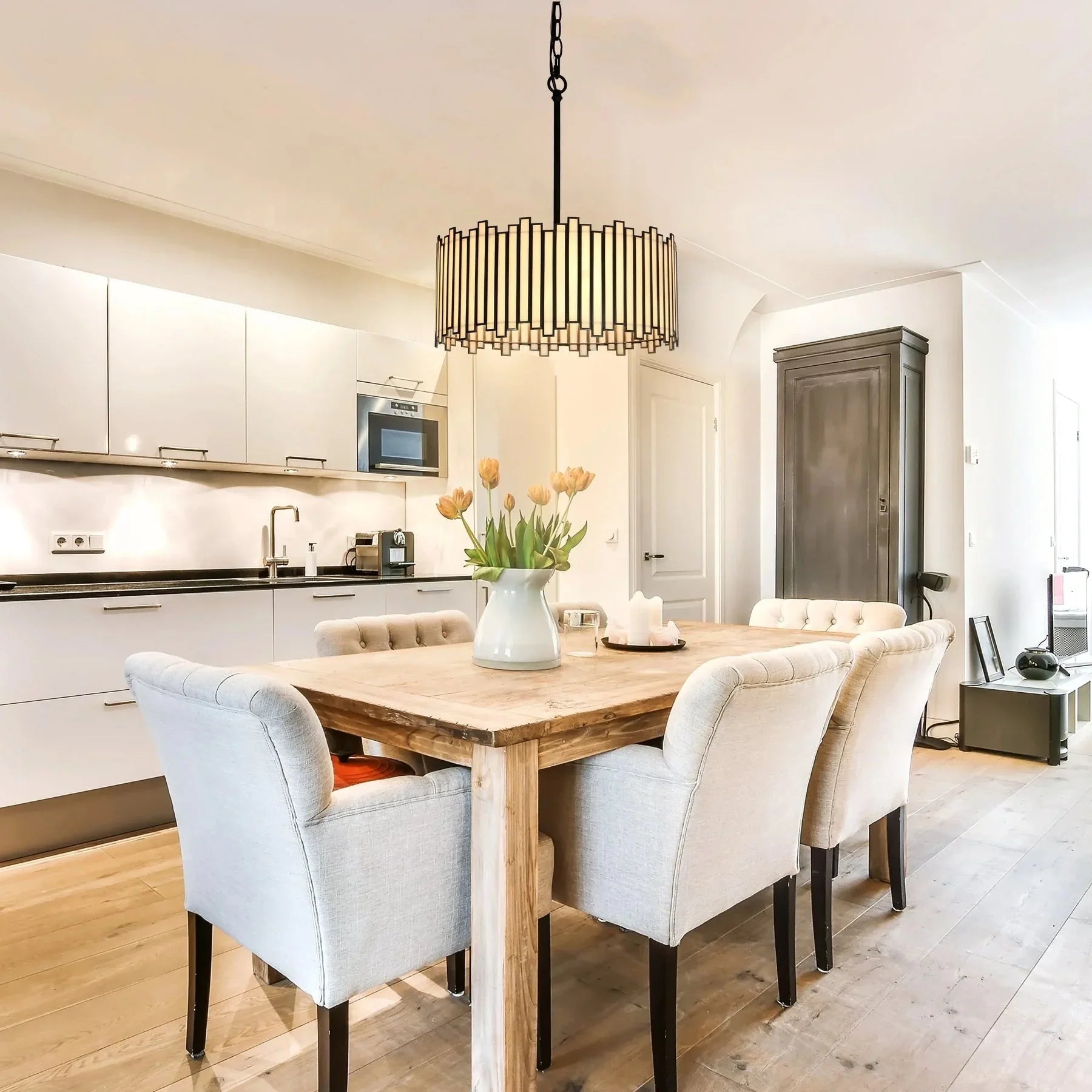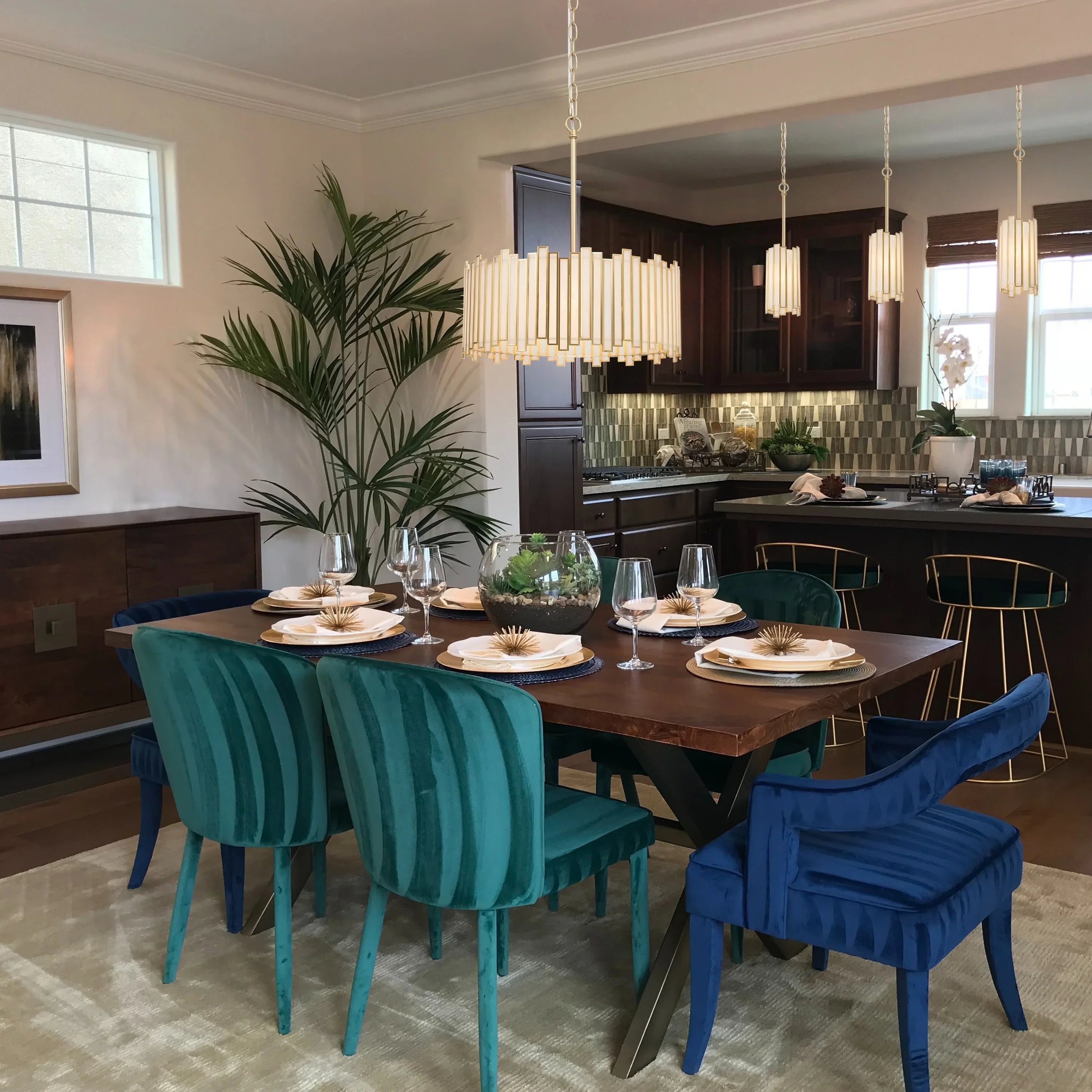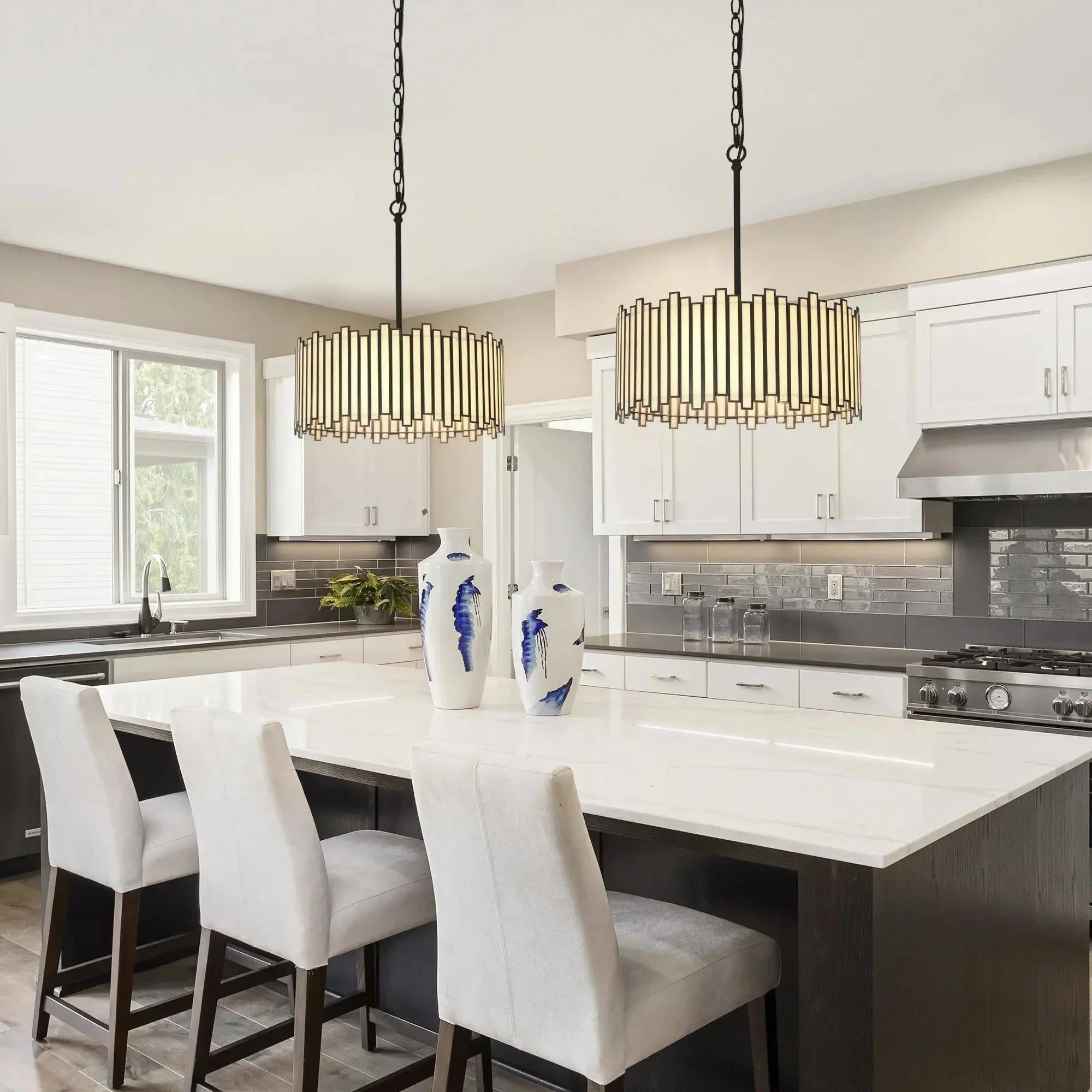 Blending modern glam style and elegant aesthetic, this black chandelier features  glass which is irregularly arranged for a chic design. The delicate white glass pieces surrounded by the copper edge in a black finish add an understated stylish decoration to your space. The chandelier lighting is perfect for the dining room, kitchen island, hallway, and so on.
