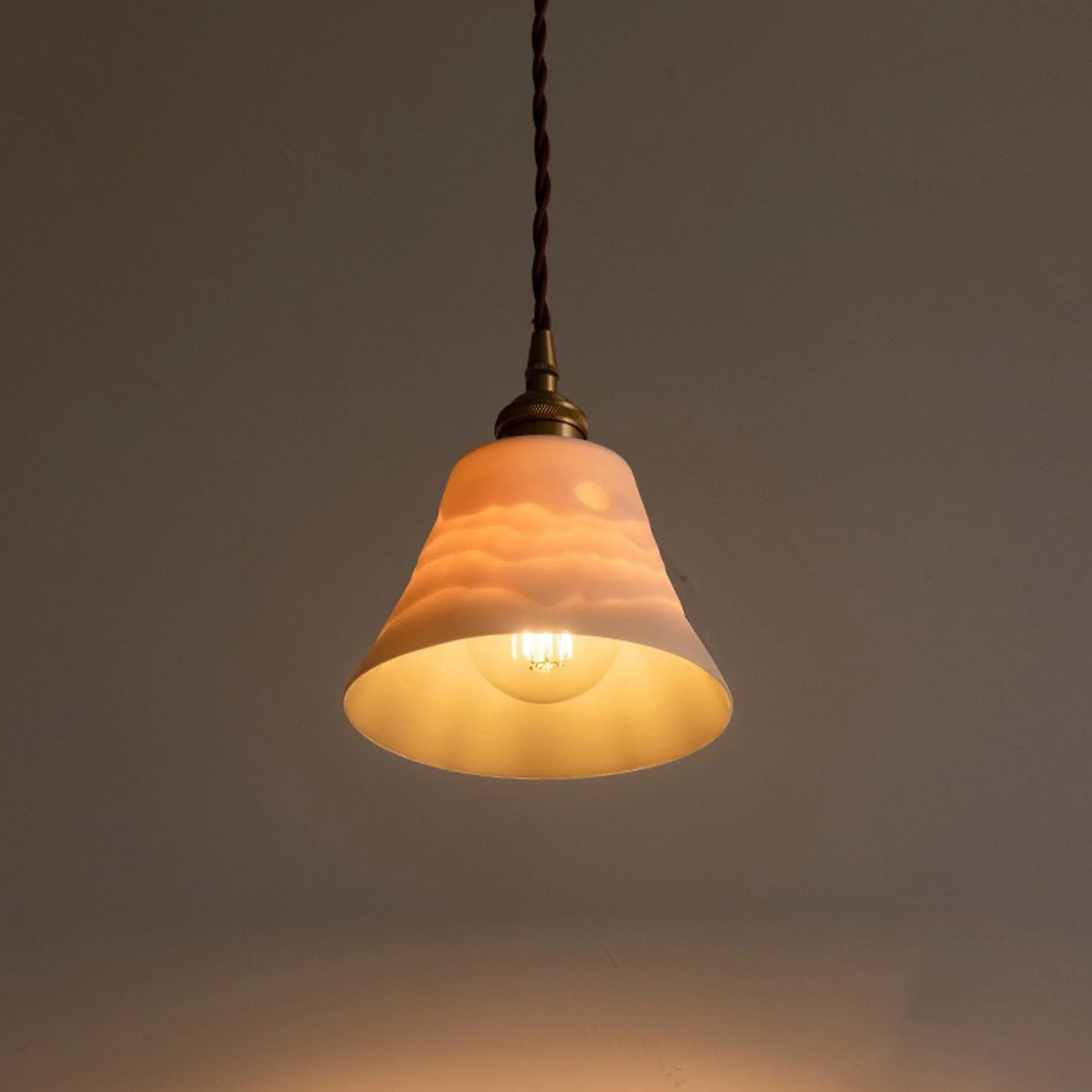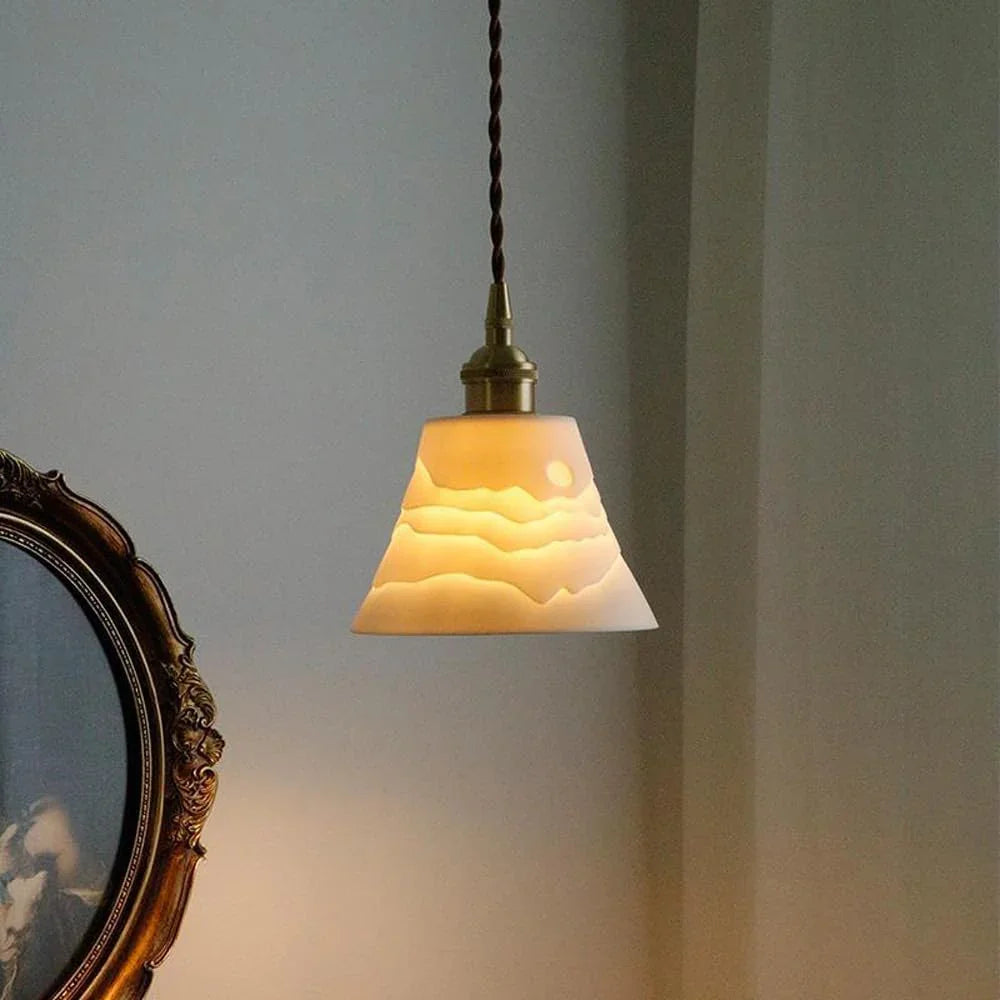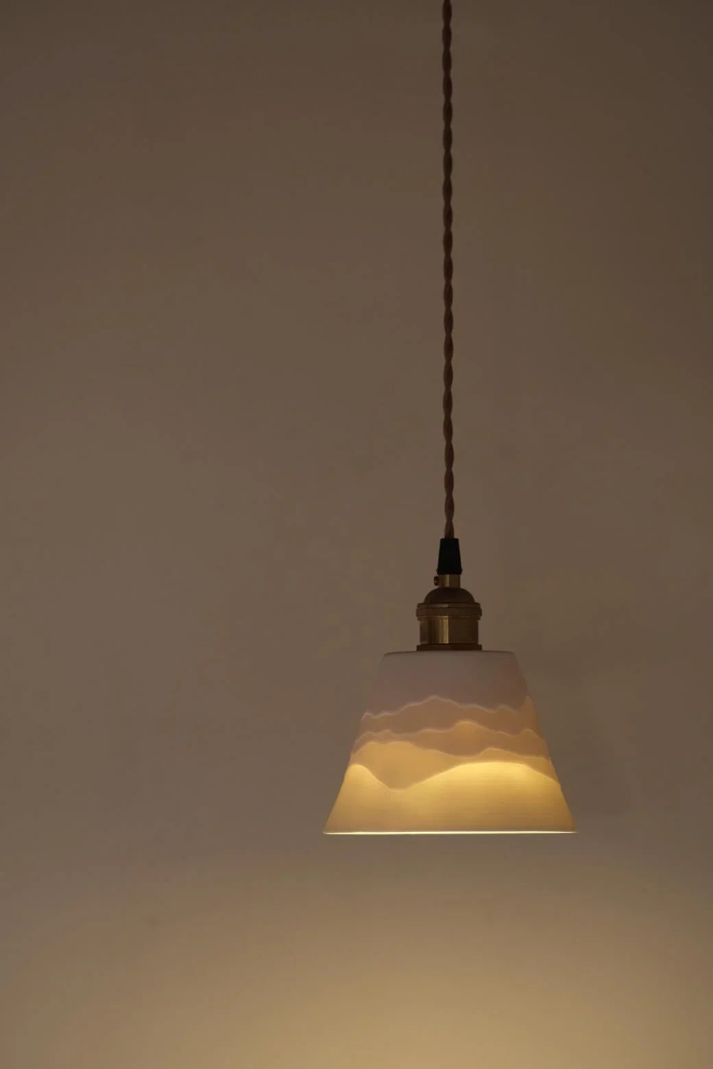 Illuminate your space with understated elegance. This Mountains Shadow Ceramic Pendant Lamp features a beautiful ceramic shade adorned with a striking mountain silhouette. Its soft light creates a warm and inviting atmosphere. More than just a practical lighting tool, it's a sculptural visual focal point, perfectly blending natural inspiration with minimalist aesthetics. Add sophistication and visual interest to any room.