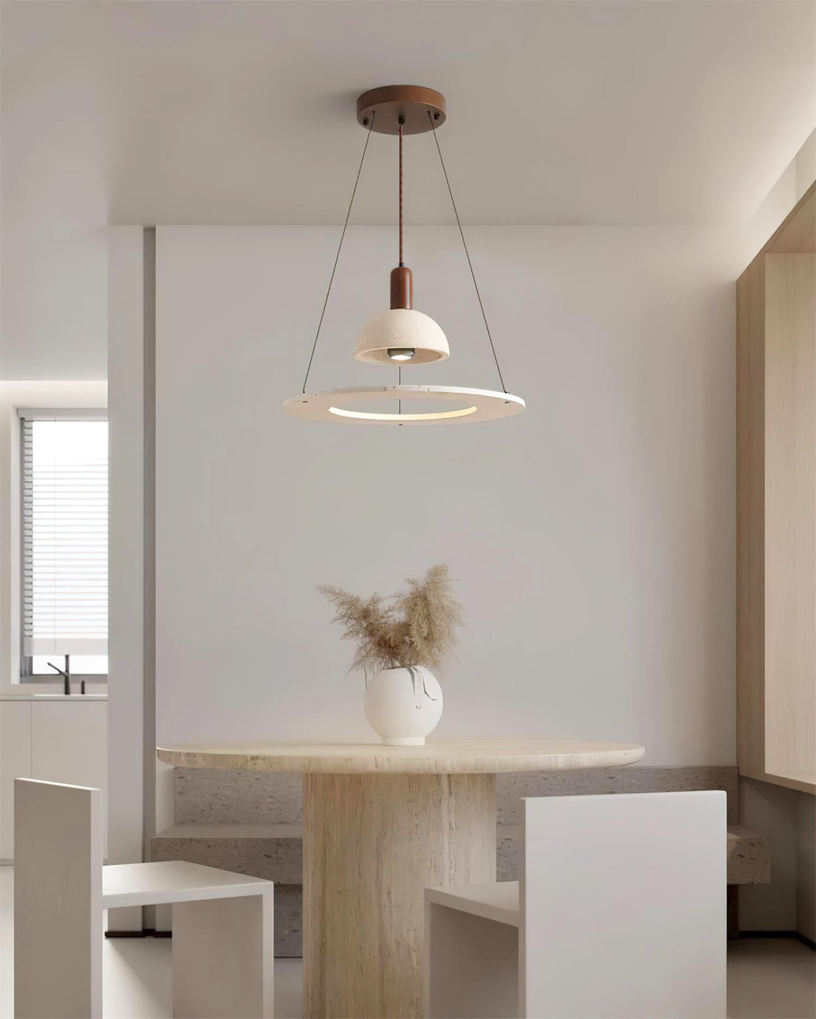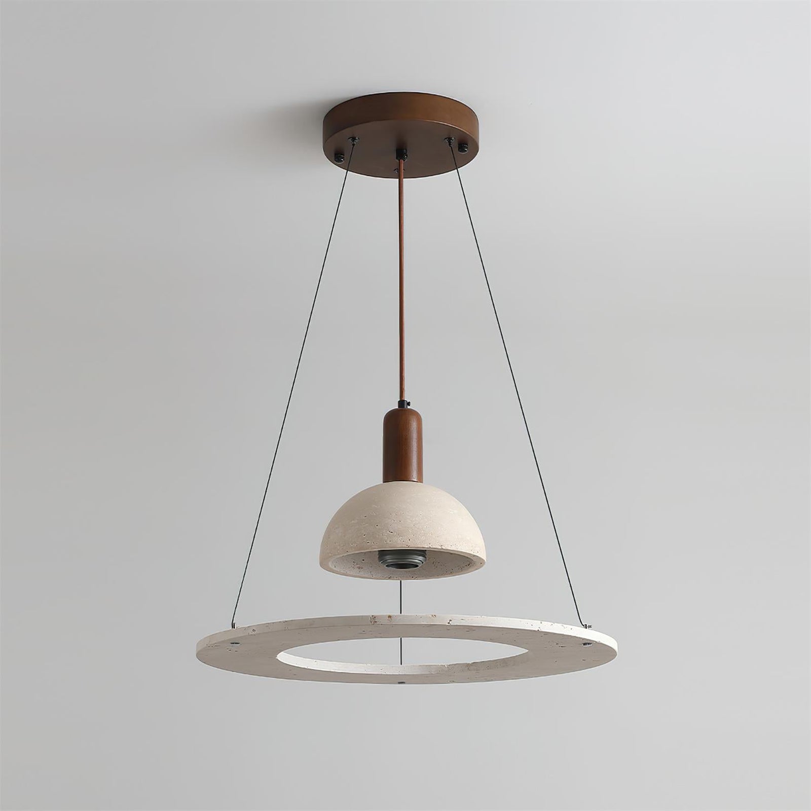 Suspended like a celestial body, the Travertine Vistara Geometric Pendant Lamp brings sculptural sophistication to your space. A dome of honed travertine floats within an orbital circular frame, its natural stone texture radiating warmth and authenticity. The offset ring creates an unexpectedly airy geometry that defies its substantial presence, while wood accents and refined suspension lines complete the architectural narrative. This is lighting as art—a statement piece that elevates interiors with understated luxury and timeless design.