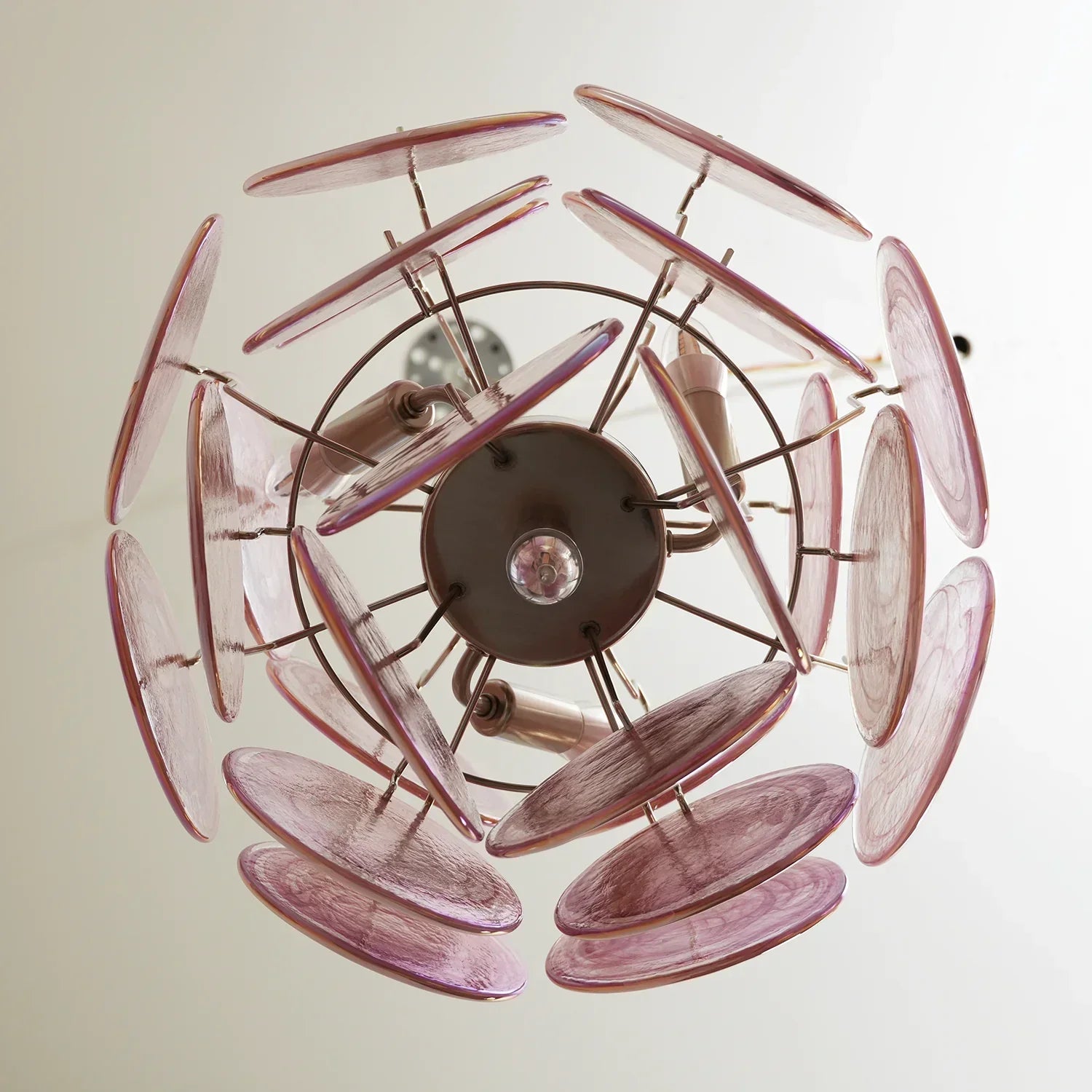 Elevate your space with our Vintage Murano Pink Glass Chandelier. This dazzling piece features Pink disks that reflect a spectrum of colors, transforming any room into an exquisite masterpiece. With its vintage charm and iridescent glasses, this chandelier will add style and sophistication to your home.