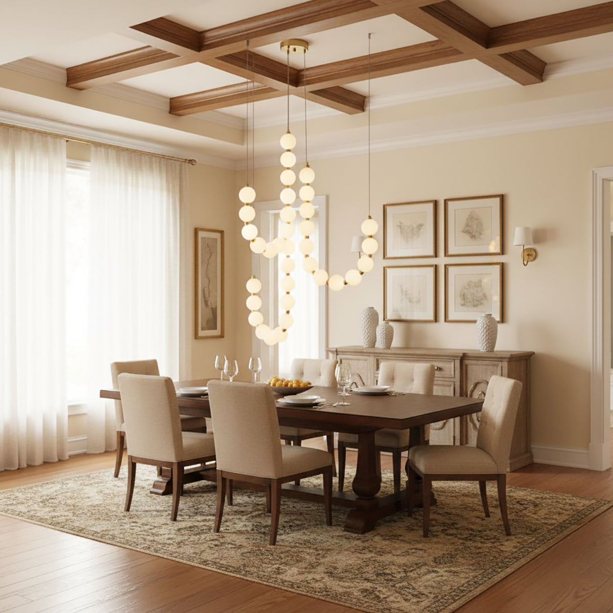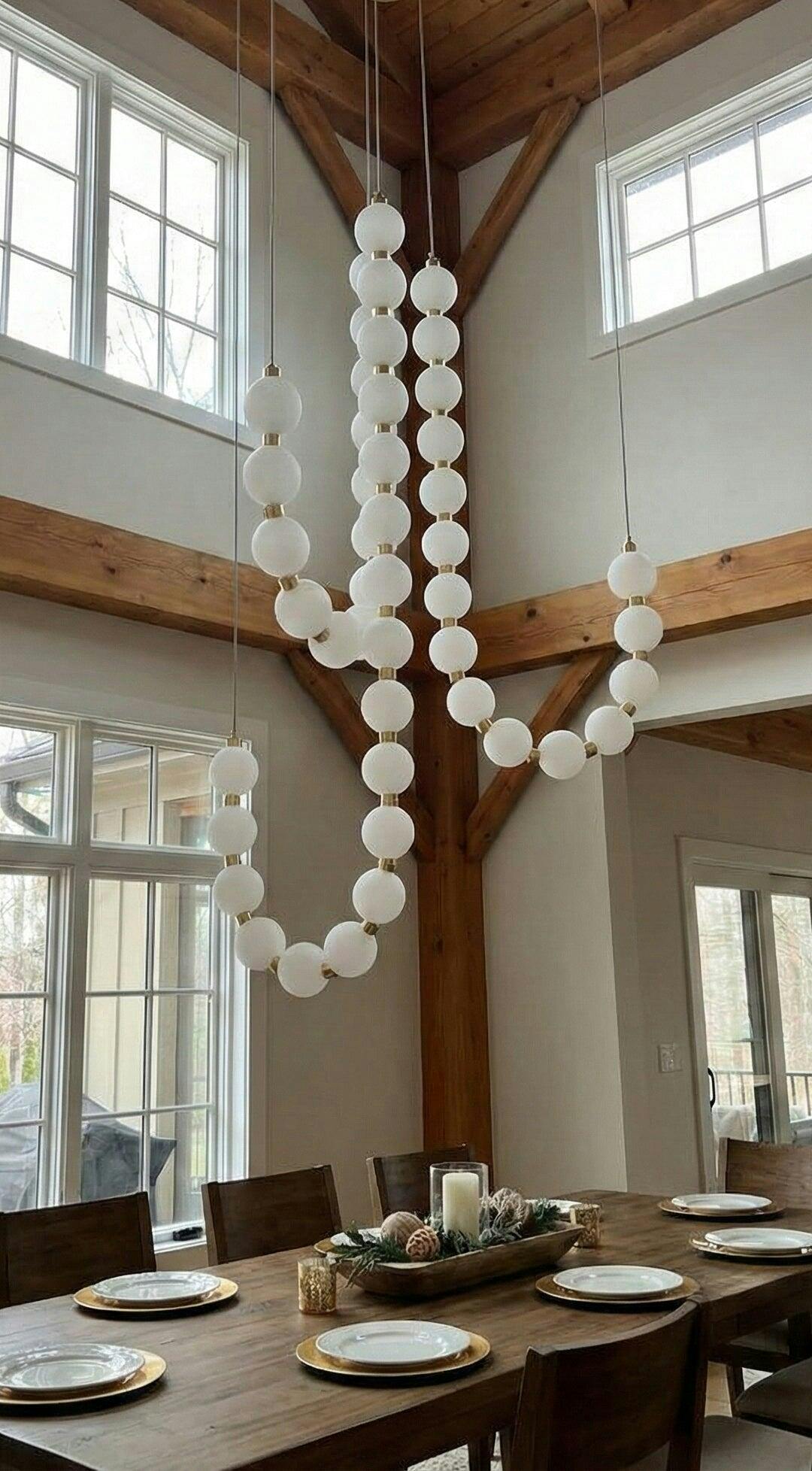 The Acrylic Pearl Necklace Chandelier is a modern art chandelier inspired by the timeless elegance of a pearl necklace. Its unique shape and modular design bring unparalleled modern luxury to your space.