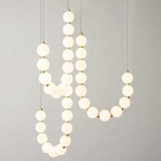 The main body of the fixture is ingeniously connected from smooth acrylic spheres with delicate brass connectors. Integrated LED light sources are embedded within the acrylic spheres, providing soft, even lighting. The unique beaded or necklace-like structure allows it to be suspended in a variety of eye-catching, dynamic shapes. The golden brass base and connectors contrast sharply with the white/frosted acrylic spheres, highlighting a Nordic minimalist and contemporary style.