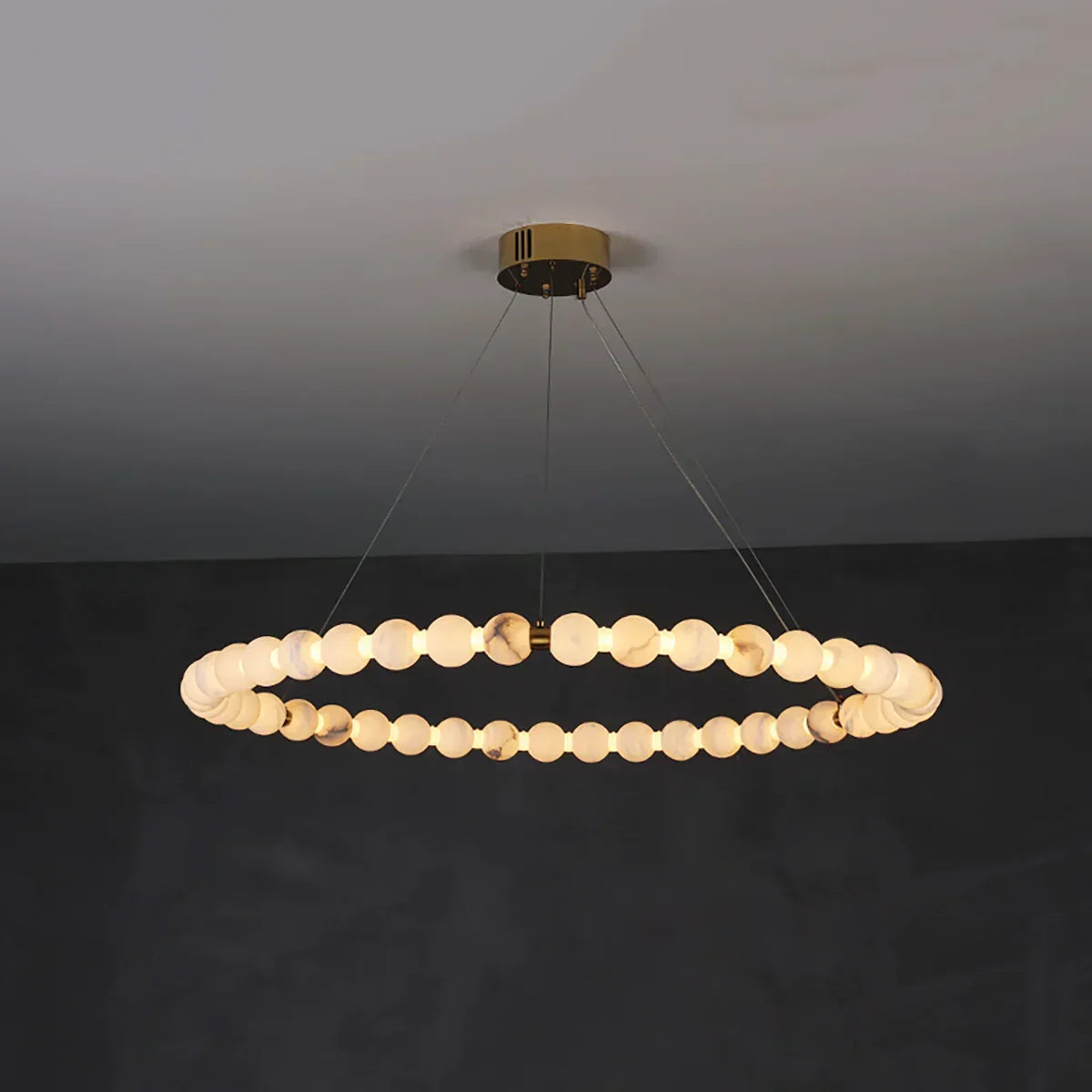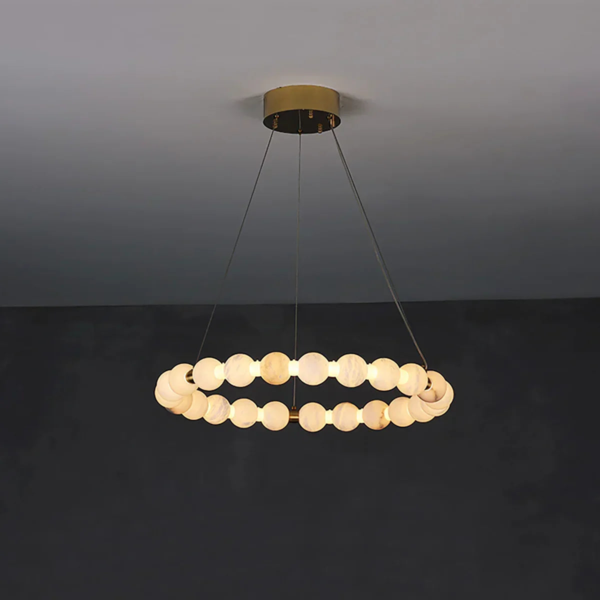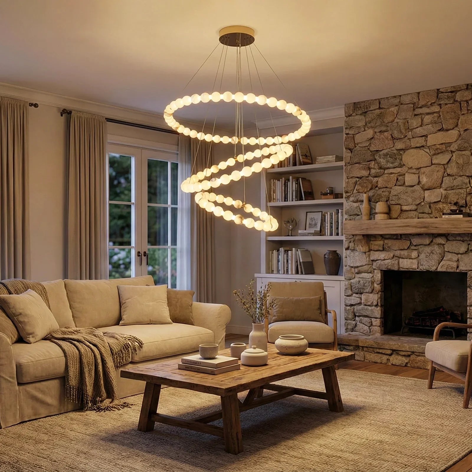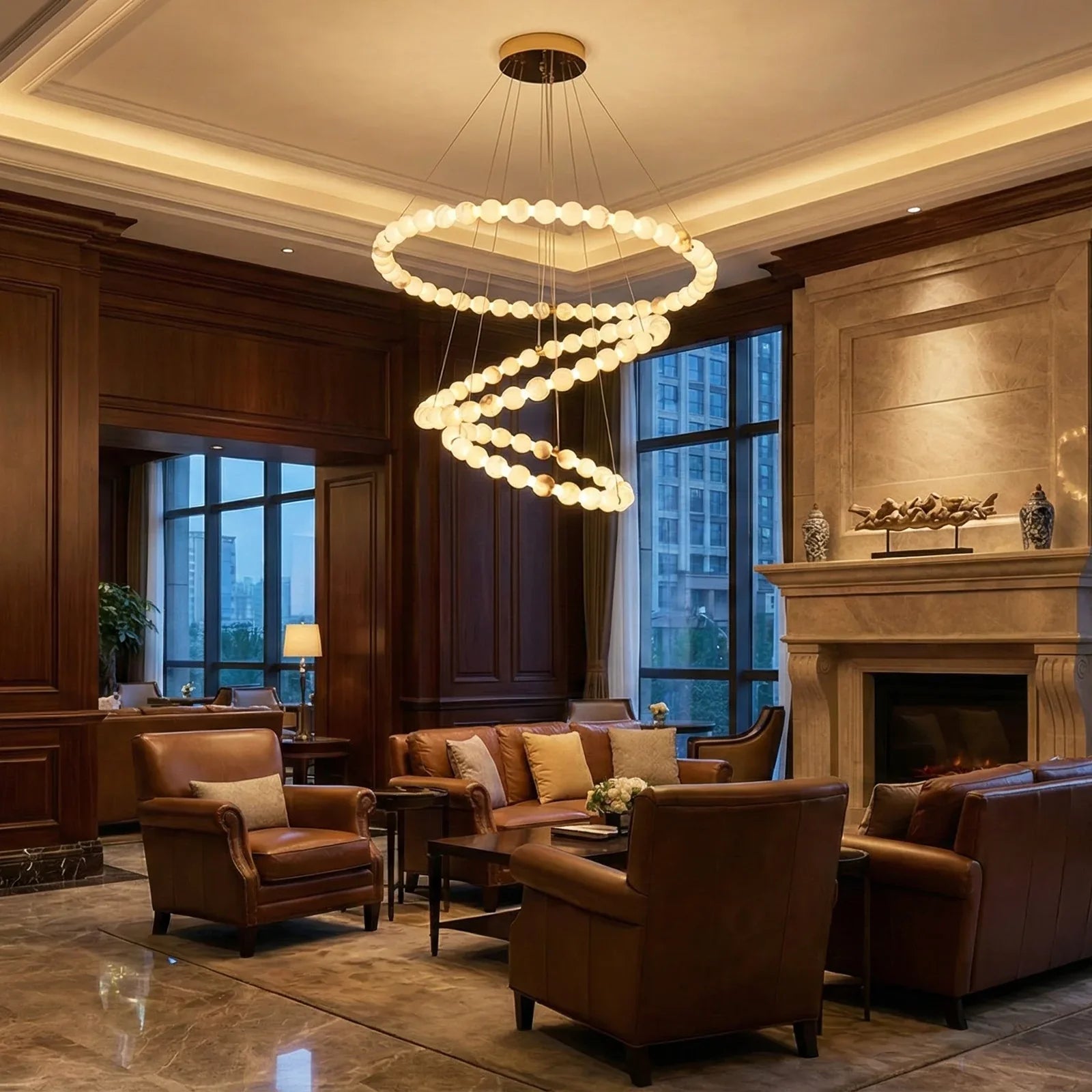 Meticulously handcrafted with natural alabaster beads, the unique texture of alabaster creates a soft, warm glow when illuminated, fostering a tranquil and romantic ambiance. Built-in concealed LED light sources emit a warm, soft, and evenly distributed light. Flexible in design, it can be configured as a single ring, multi-layered circular, or dynamic spiral chandelier to meet diverse visual and spatial needs.