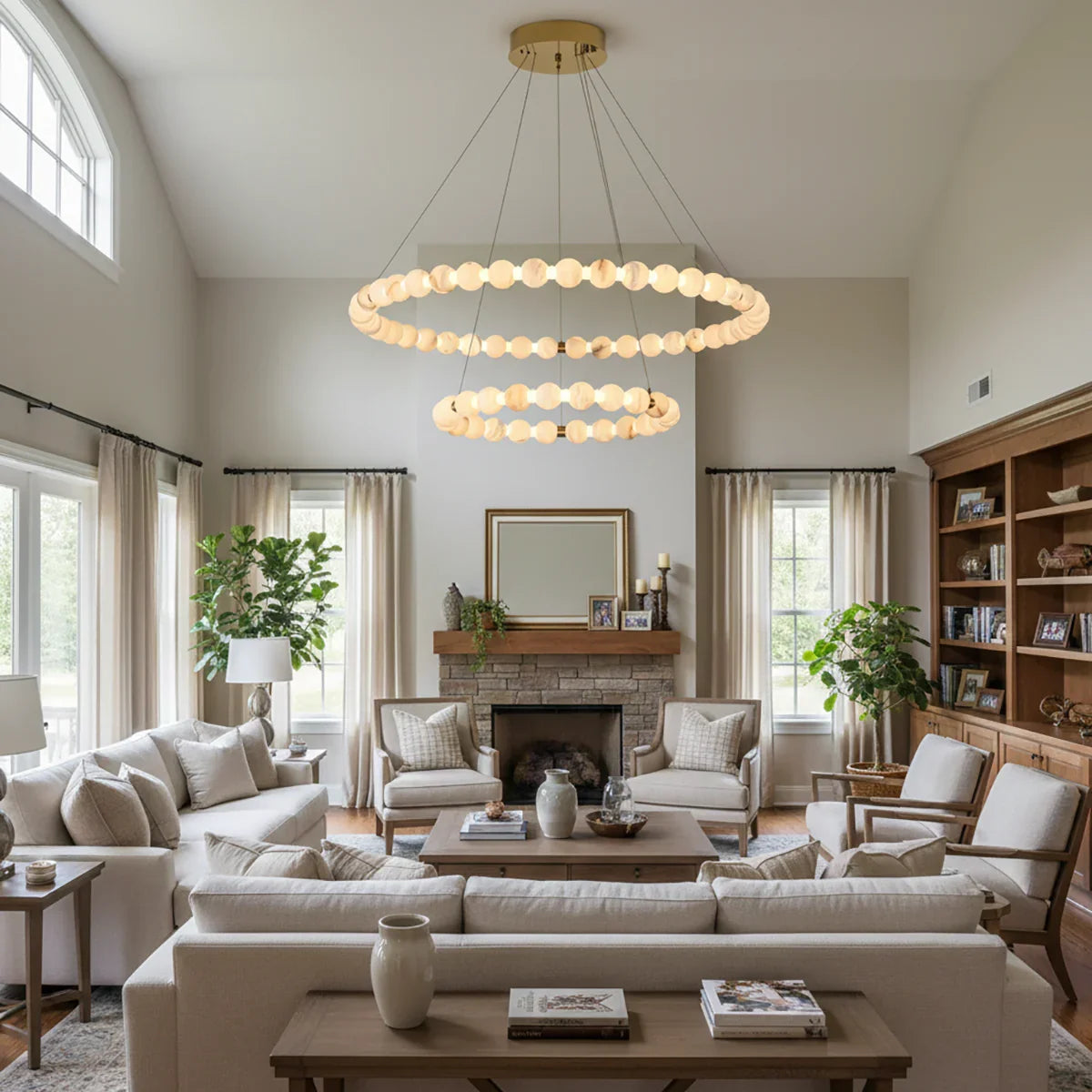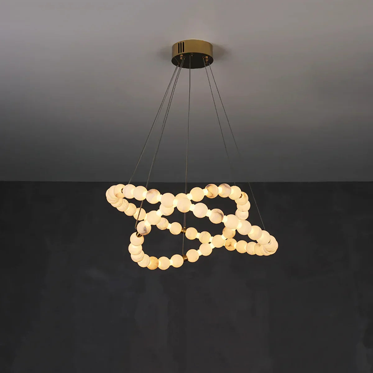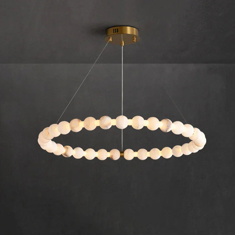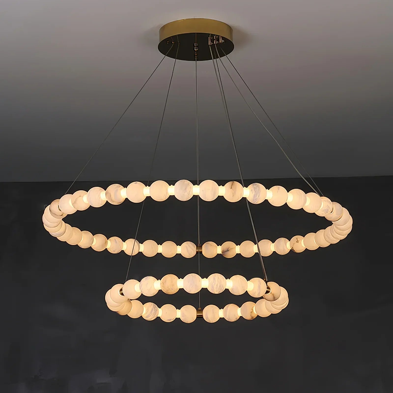 Meticulously handcrafted with natural alabaster beads, the unique texture of alabaster creates a soft, warm glow when illuminated, fostering a tranquil and romantic ambiance. Built-in concealed LED light sources emit a warm, soft, and evenly distributed light. Flexible in design, it can be configured as a single ring, multi-layered circular, or dynamic spiral chandelier to meet diverse visual and spatial needs.