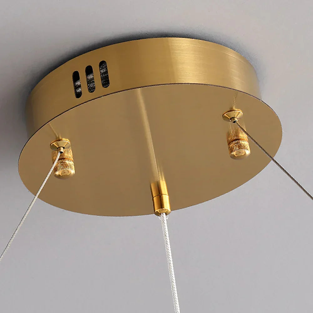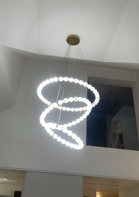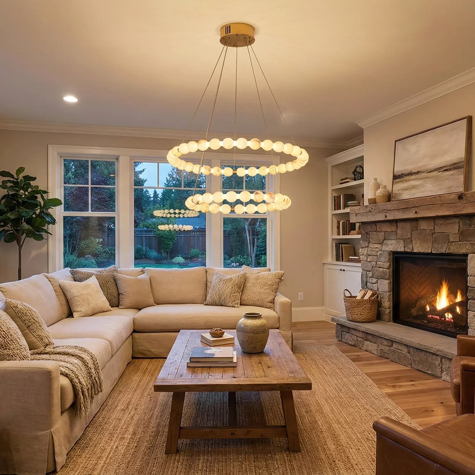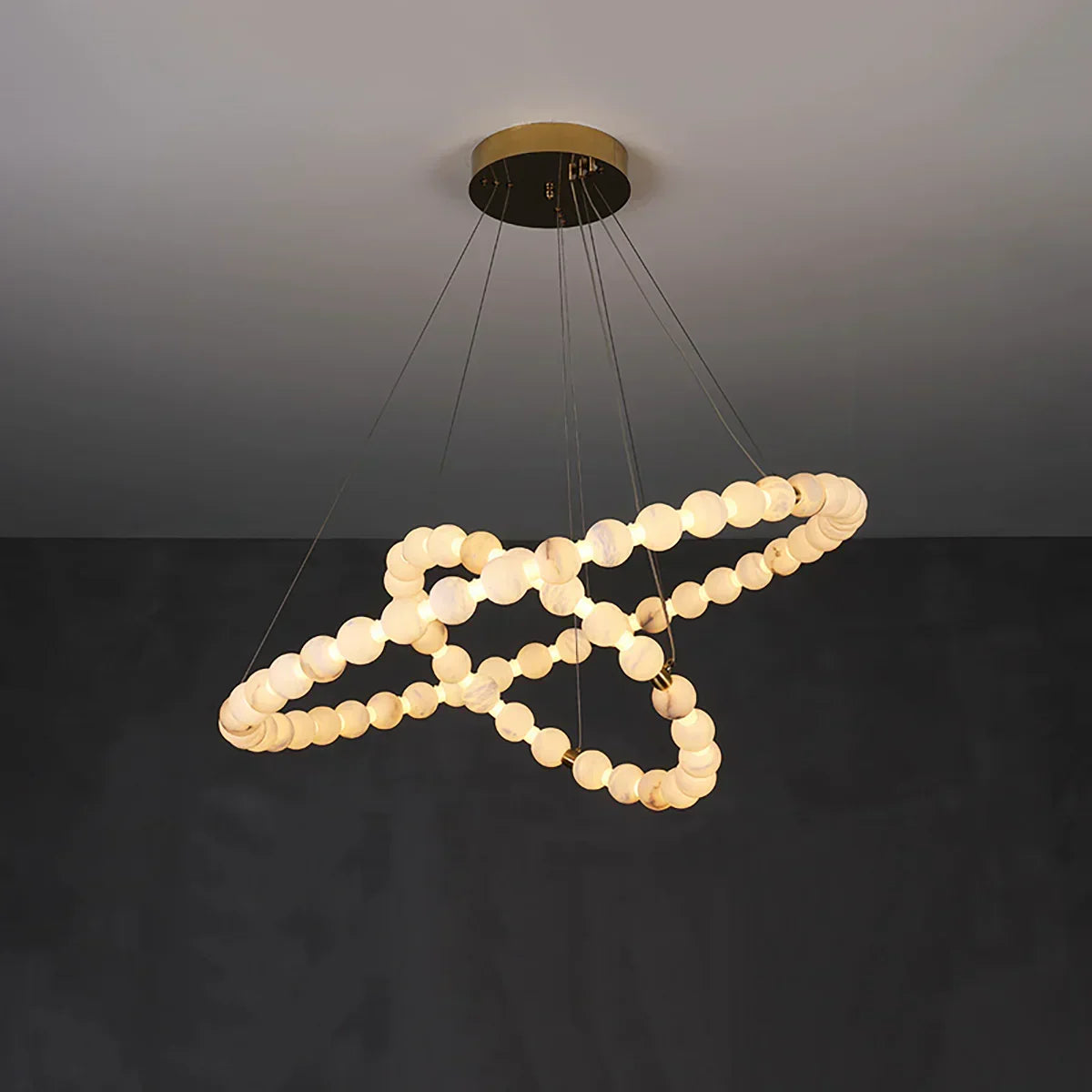 Meticulously handcrafted with natural alabaster beads, the unique texture of alabaster creates a soft, warm glow when illuminated, fostering a tranquil and romantic ambiance. Built-in concealed LED light sources emit a warm, soft, and evenly distributed light. Flexible in design, it can be configured as a single ring, multi-layered circular, or dynamic spiral chandelier to meet diverse visual and spatial needs.