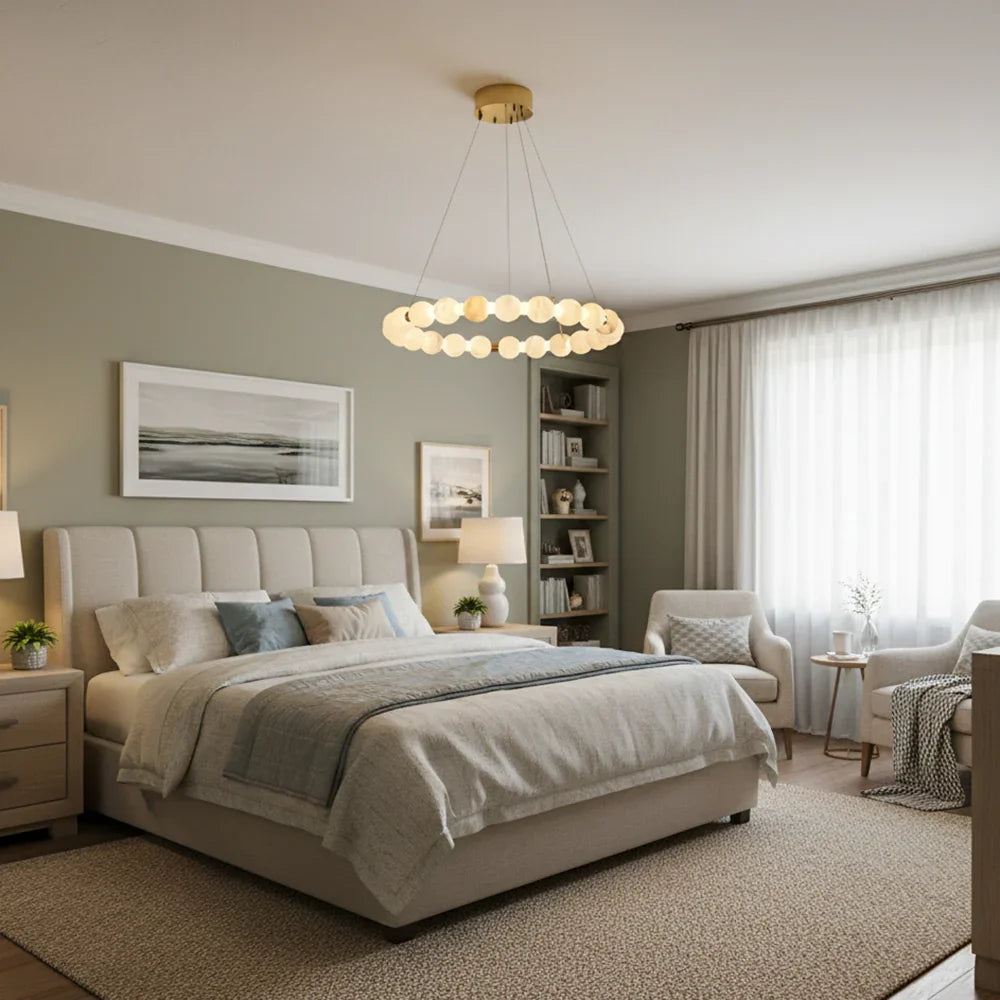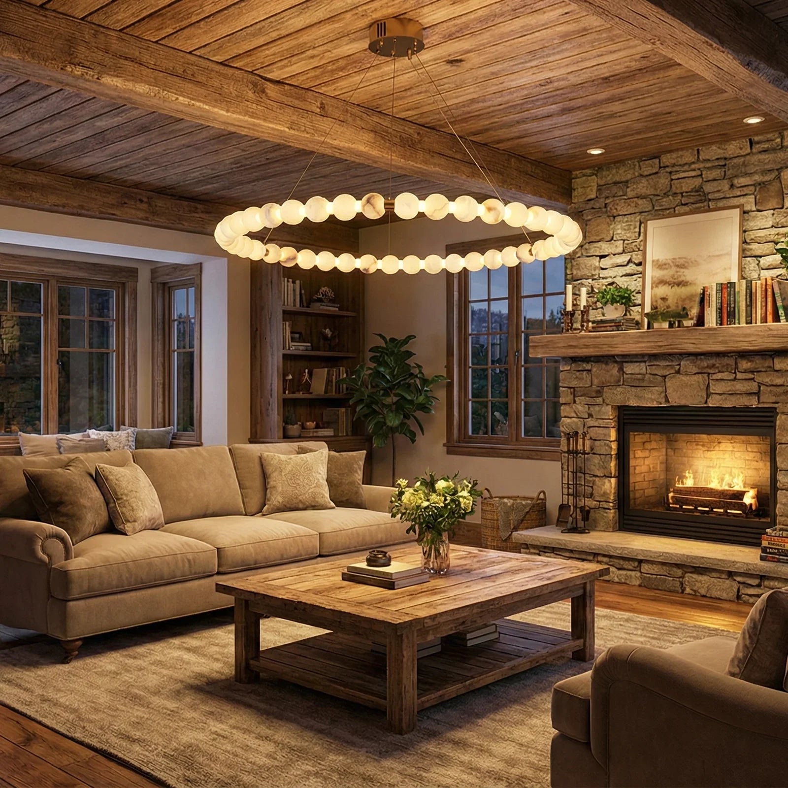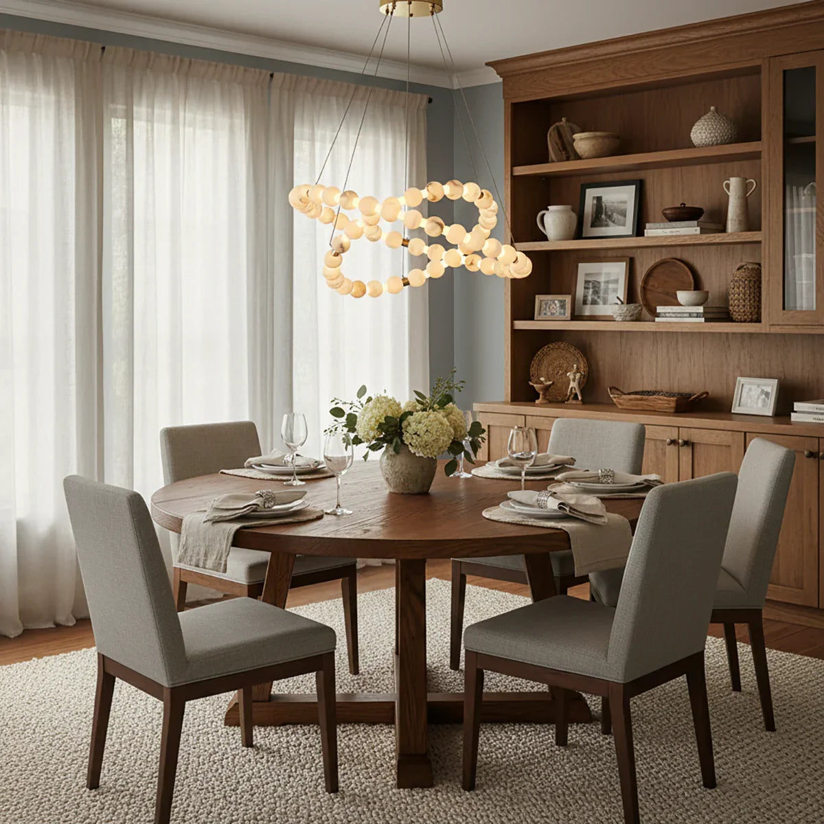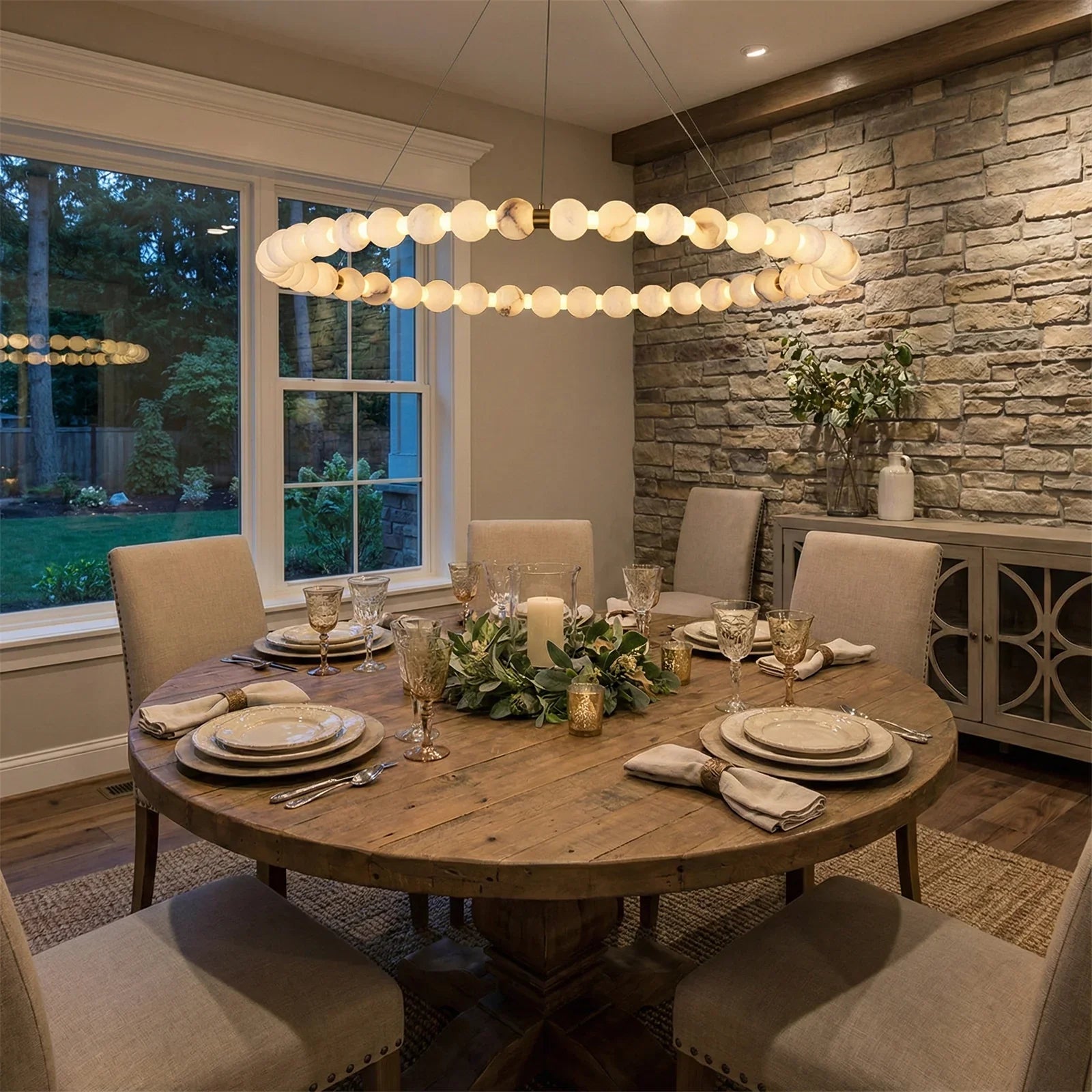 The Pearl Alabaster Necklace Round Chandelier is an ultra-luxurious art chandelier that perfectly blends natural stone with modern geometry. Its beaded design, reminiscent of a pearl necklace, exudes understated luxury and sophisticated home décor. Its compact design delivers a powerful visual impact, making it ideal for use as a main light in duplexes, high-ceilinged living rooms, or as a focal point in private corners such as dining rooms and bedrooms.