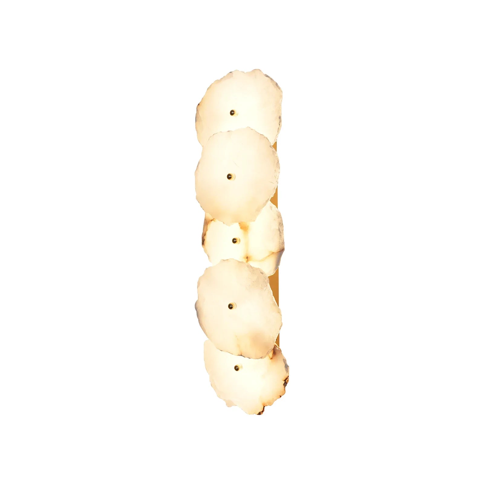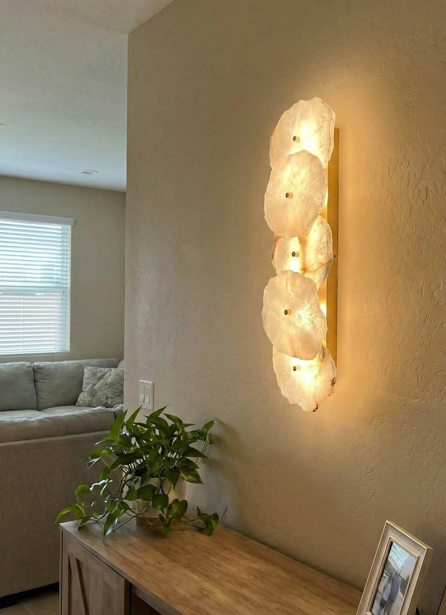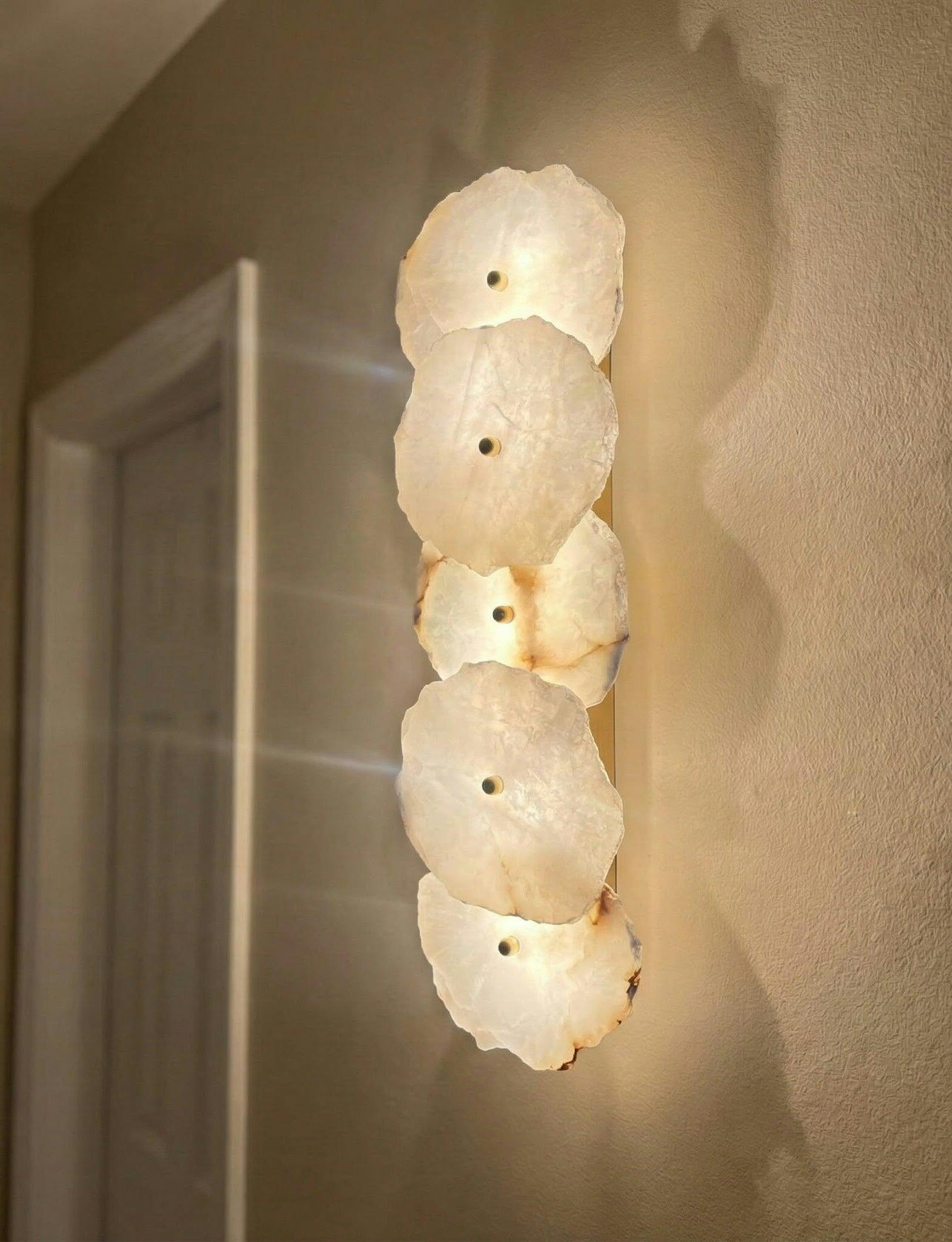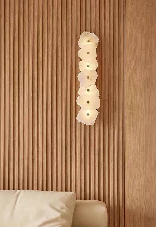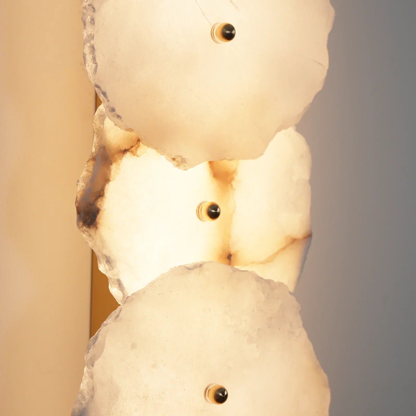 The Petra Alabaster Wall Lamp is the perfect choice! This exquisite vertical lamp is a true work of functional art, creating a warm and cozy atmosphere in any room. Natural stones of varying shapes are meticulously stacked to create a long, sculptural column of light. This unique design is sure to catch your eye. When illuminated, the light beautifully diffuses through the translucent stone, highlighting the stone's natural veining and creating a captivating, shimmering edge that will transform your wall.