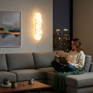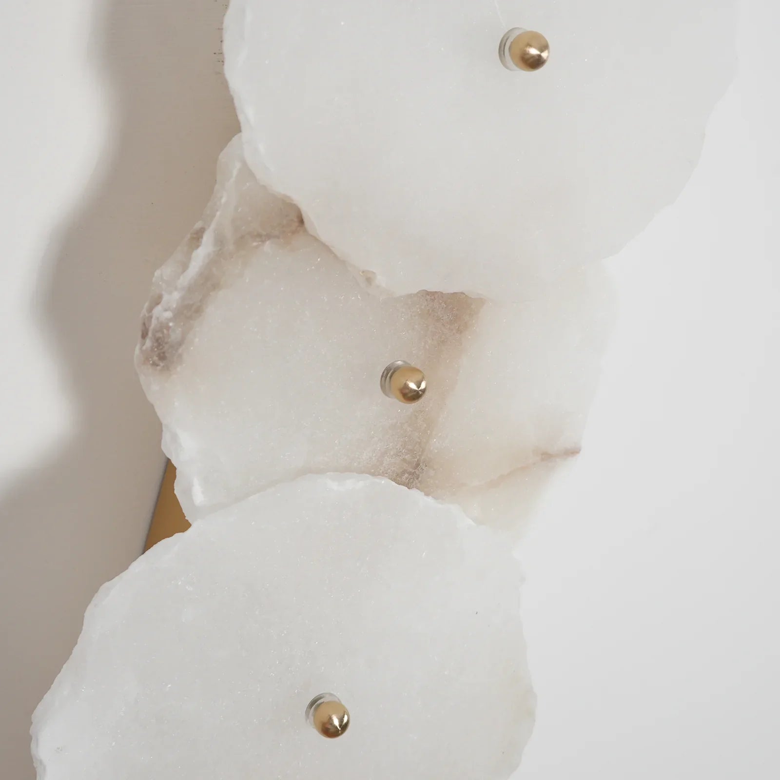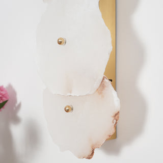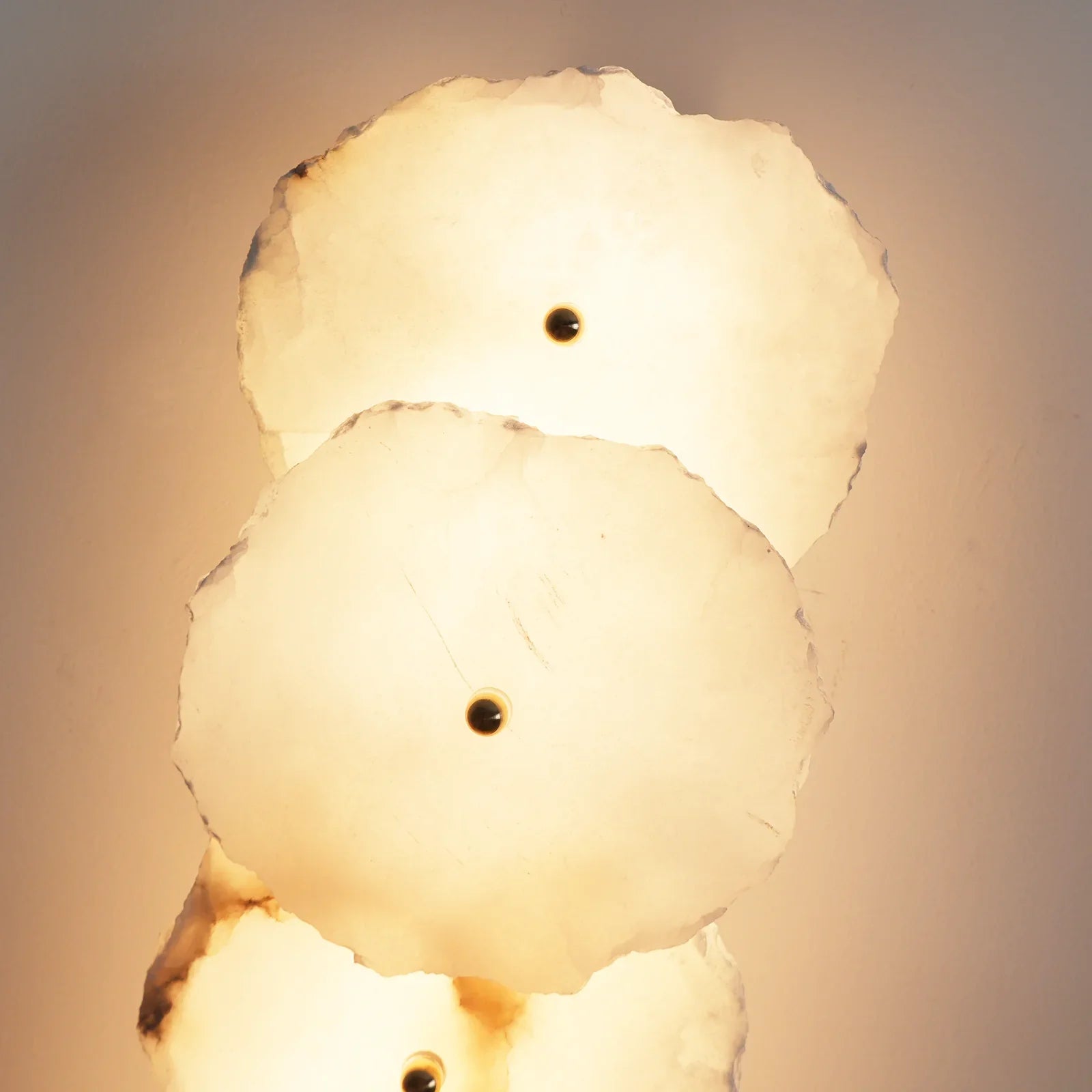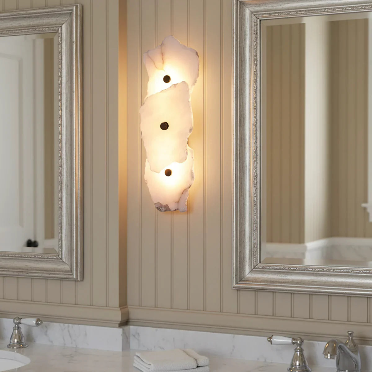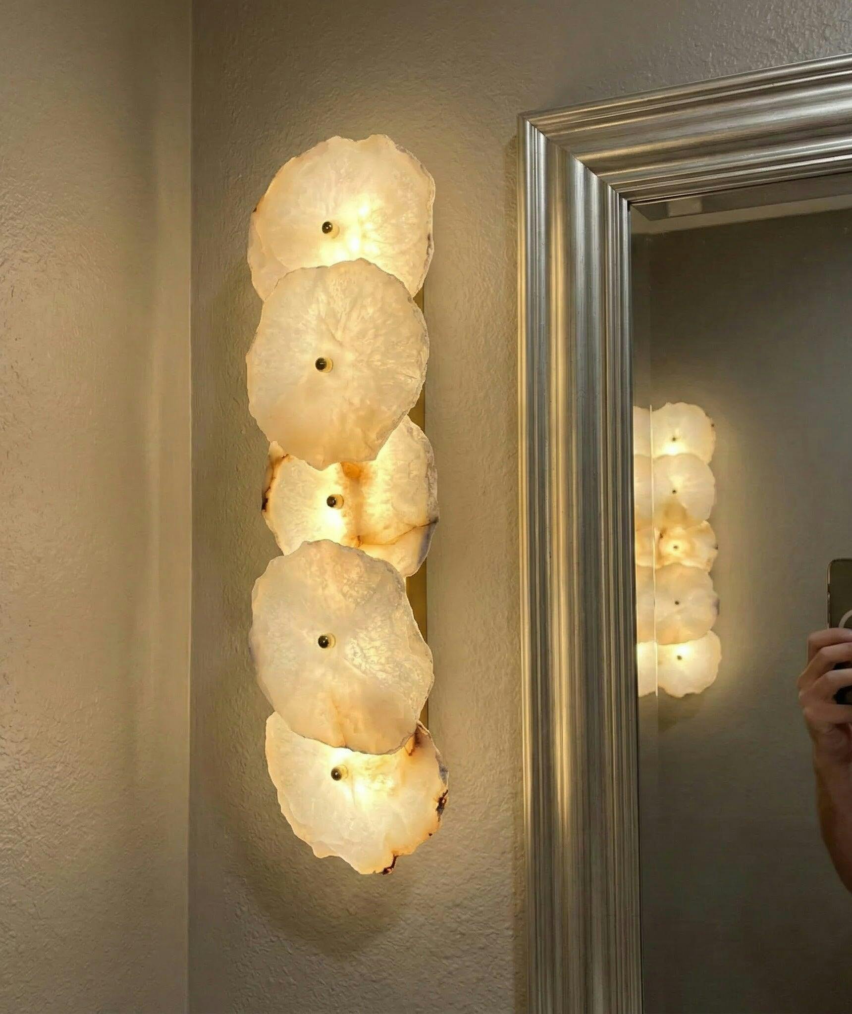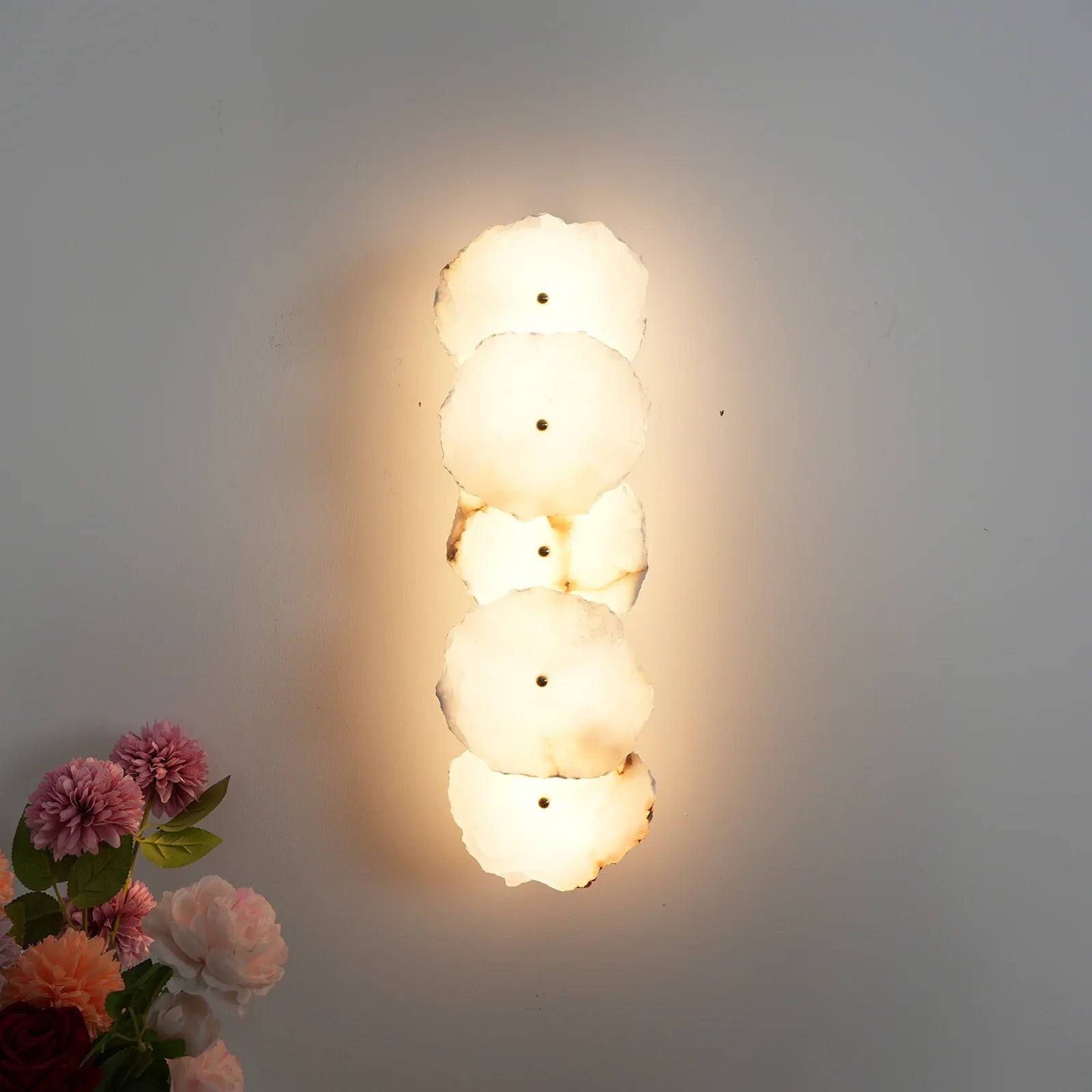 The Petra Alabaster Wall Lamp is the perfect choice! This exquisite vertical lamp is a true work of functional art, creating a warm and cozy atmosphere in any room. Natural stones of varying shapes are meticulously stacked to create a long, sculptural column of light. This unique design is sure to catch your eye. When illuminated, the light beautifully diffuses through the translucent stone, highlighting the stone's natural veining and creating a captivating, shimmering edge that will transform your wall.