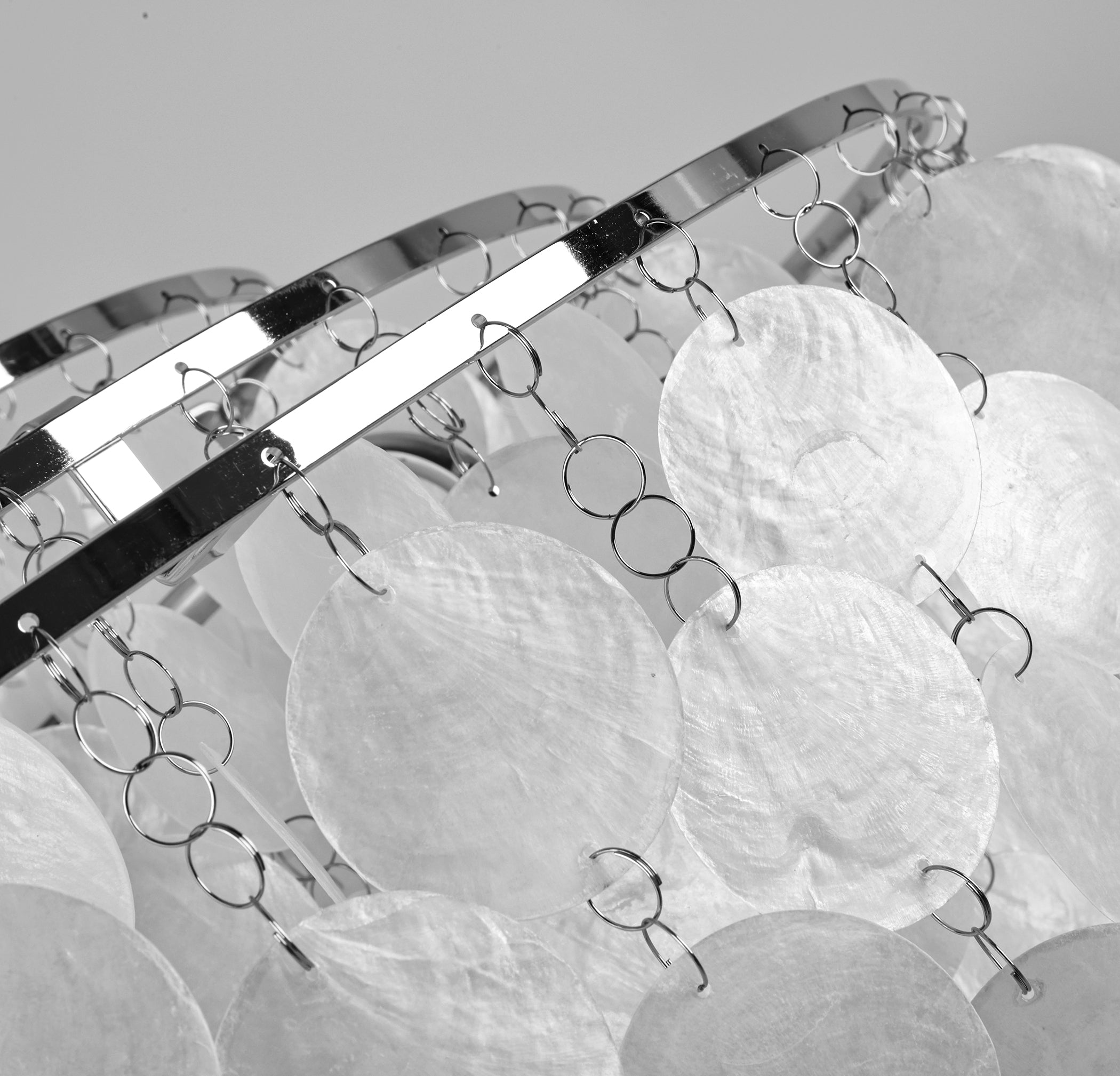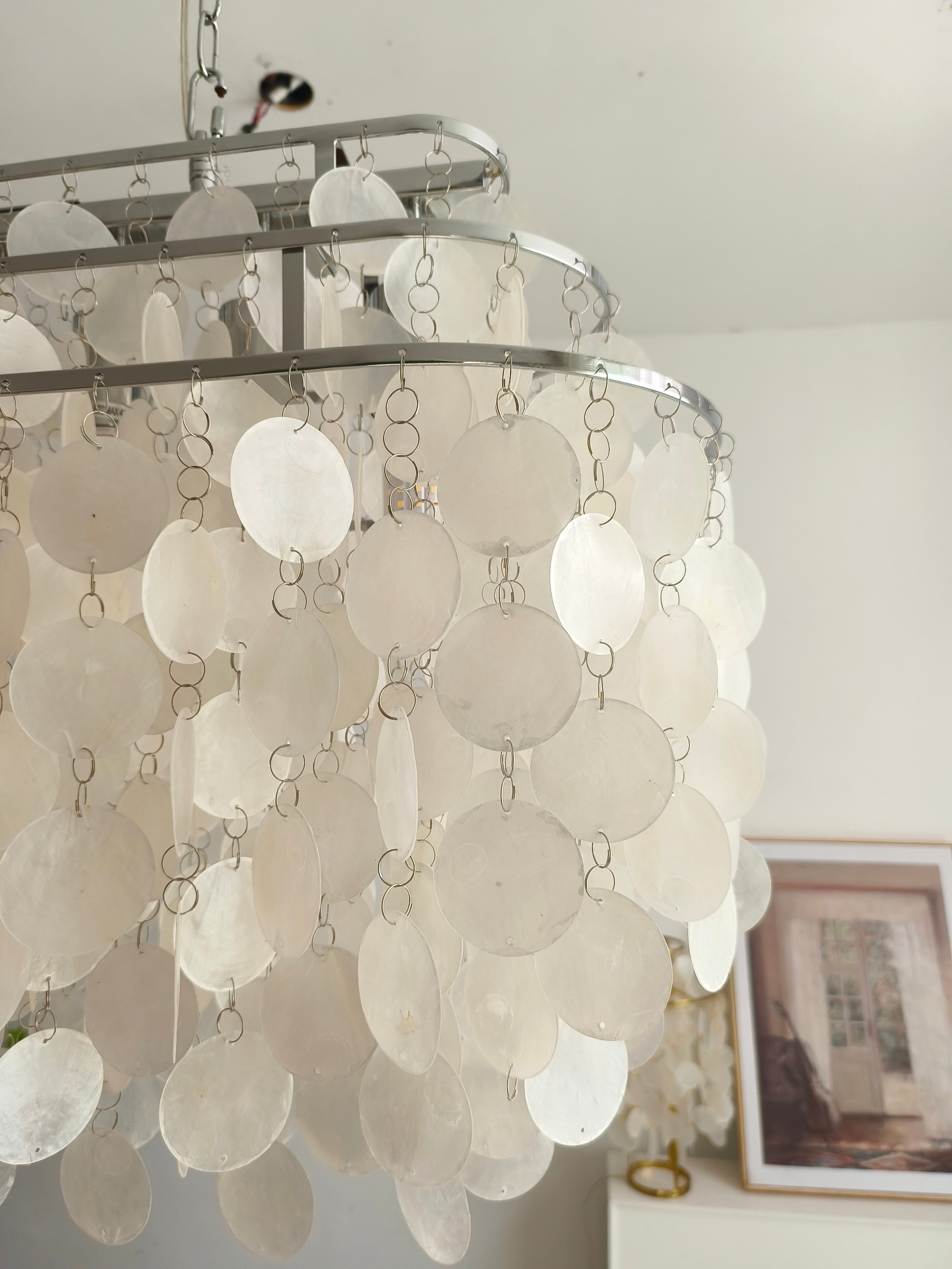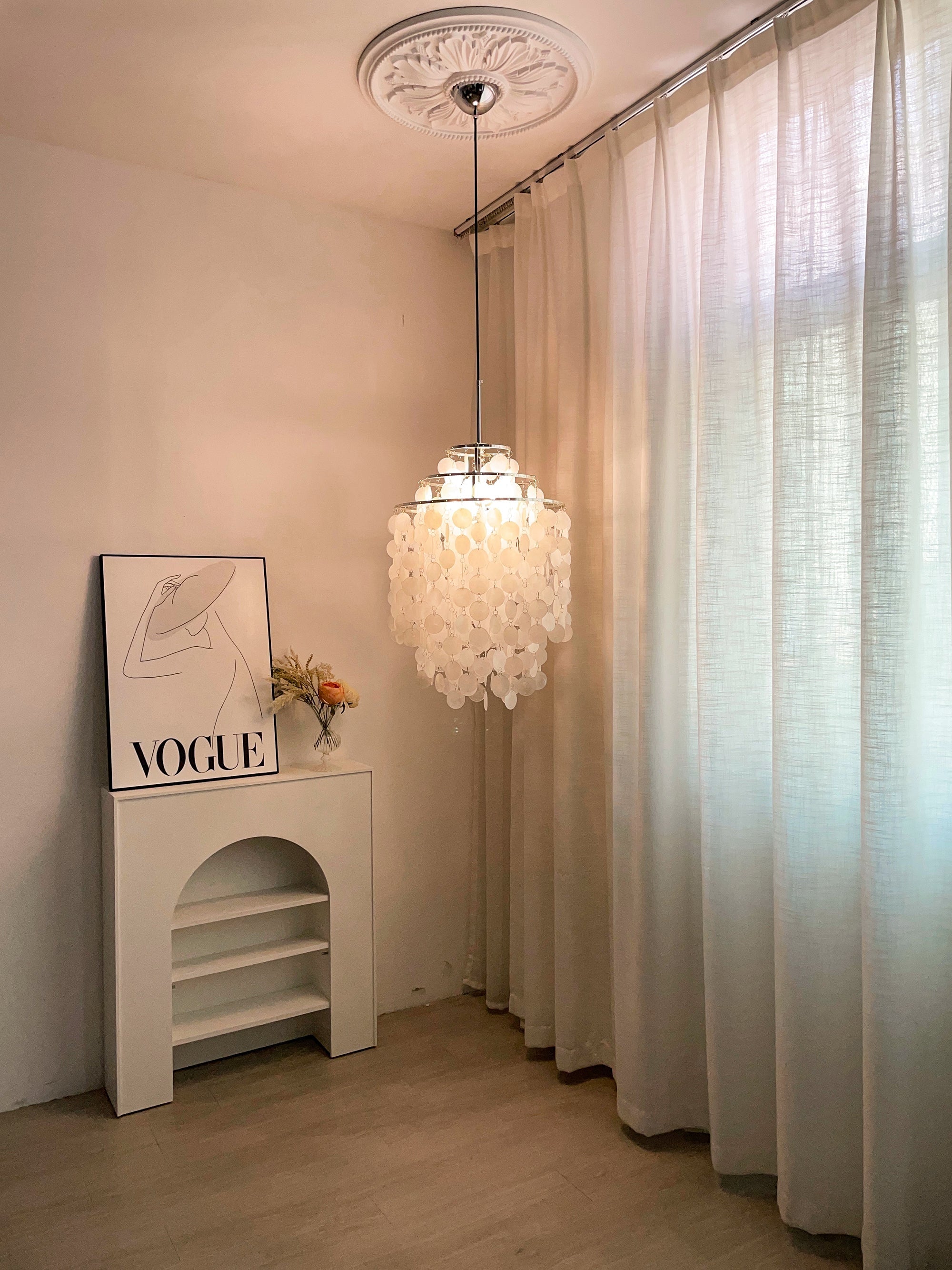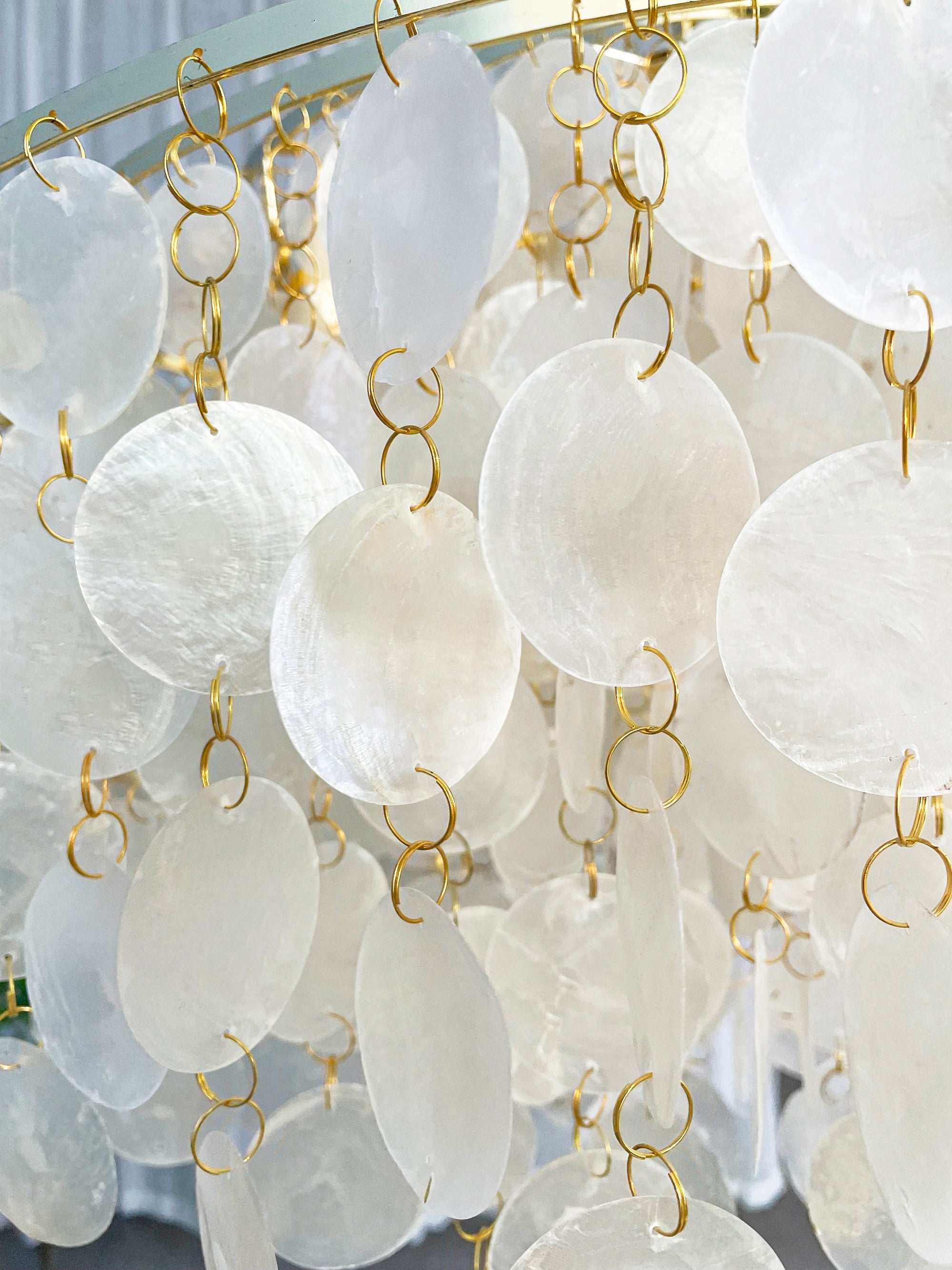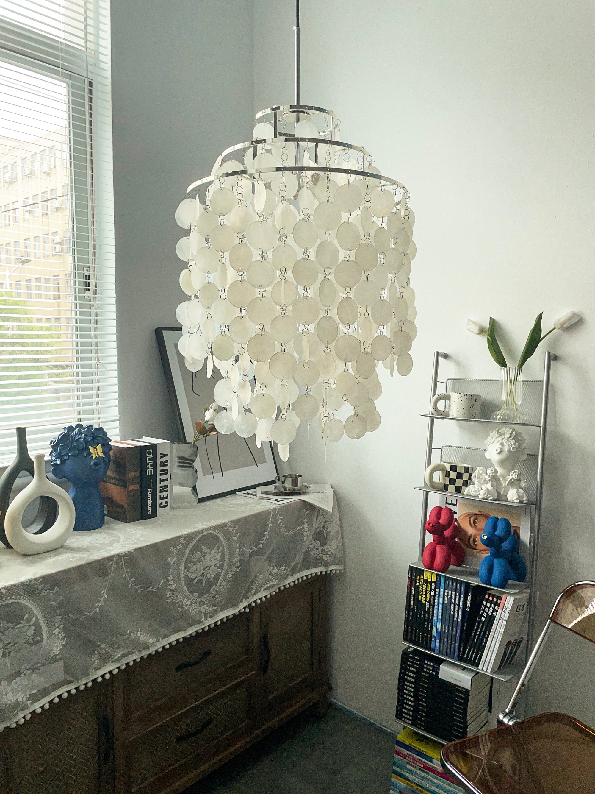 This Shell Pendant Light, crafted from delicate shell discs, cascades down like a waterfall. Elegant and chic, it creates stunning interplay of light and shadow, adding a touch of joy and sophistication. It seamlessly integrates into both classic and modern interior design styles, complementing any space, whether hung above a dining table or placed in the center of the living room.