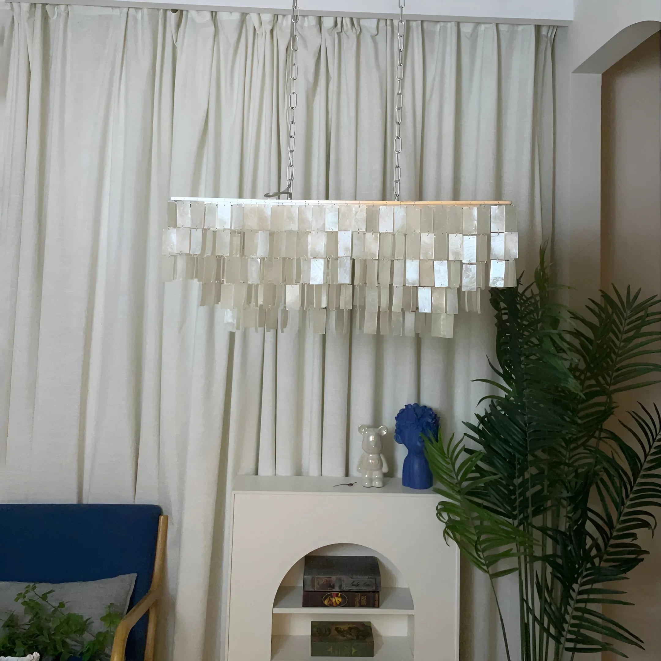 Skye Linear Tiered Chandelier, tiers of natural shells cascade down in a rectangular shape to Adds alluring style and charm. casting warm luminosity through your space, This light delivers artful tranquility that you are sure to adore.