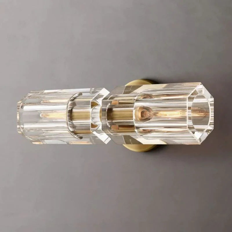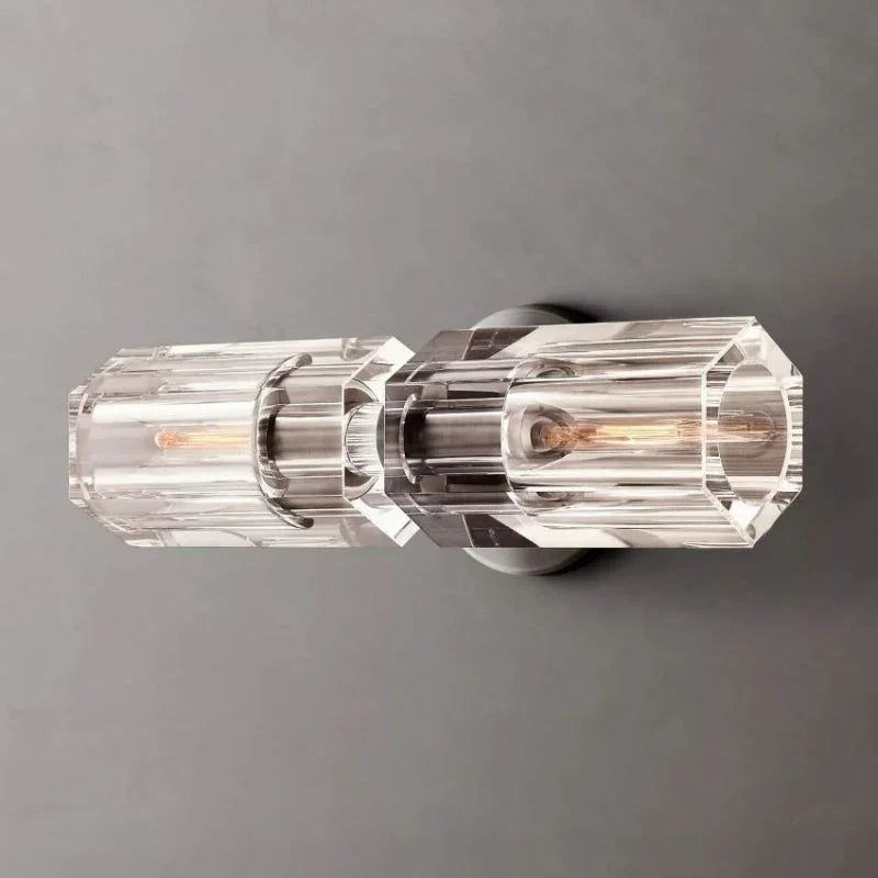 The rhythmic design of this Beliy Linear Sconce collection is inspired by the shape and scale of industrial gears, where spokes are interlaced with negative space to interlock with other gears. Here, the spokes are hexagonal in form, juxtaposed with a circular interior, crafted from crystal glass, running along a simple, sturdy metal frame. The light shines through the glass as if it were a candle.
