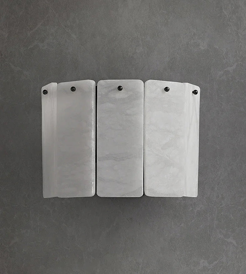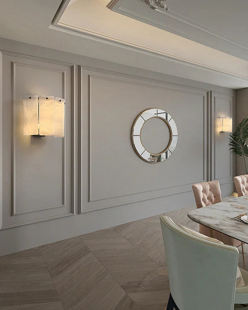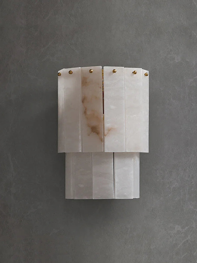 The Eichholtz Brasen wall sconce features two rows of translucent marble panels to decorate your space with soft charm and sophistication. Brushed brass accents add warmth to the overall design, making it a charming addition to your decor.